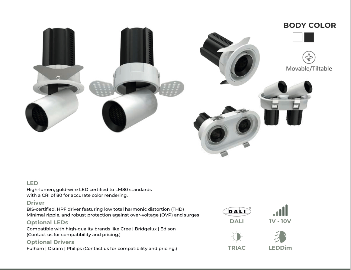 LEARC 12 watt 360 degree rotatable, tiltable, pull out type LED down light with CREE COB and top branded LED driver.
