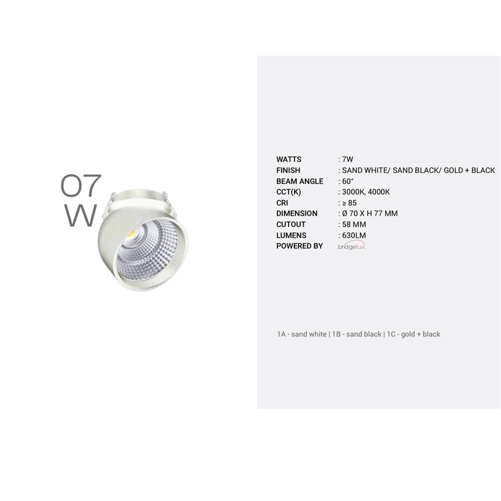 LEARC aluminium white finish 7 watt all angle adjustible recessed spot light.