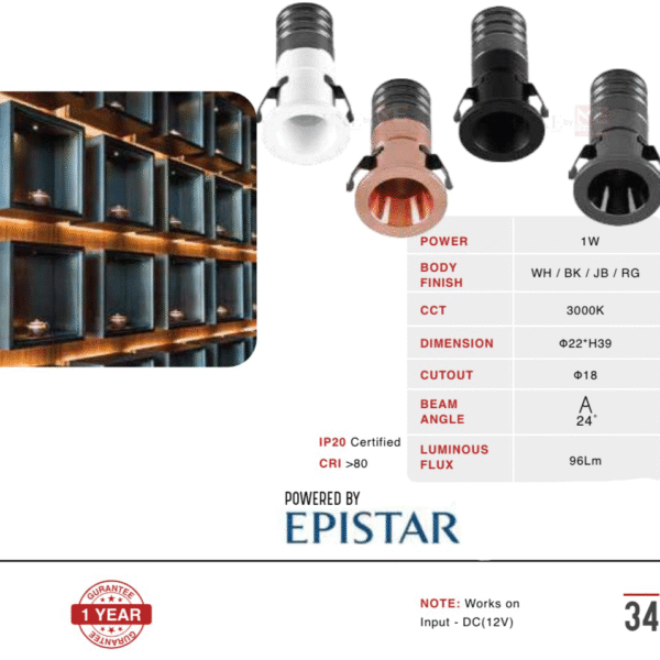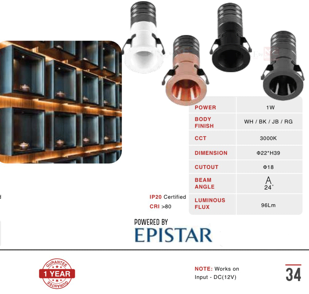 LEARC aluminium black finish recess type 1 watt Epistar LED cabinet light without Driver. It is also used in cluster to create dot type lighting effect. Single Driver can be used for many light.
