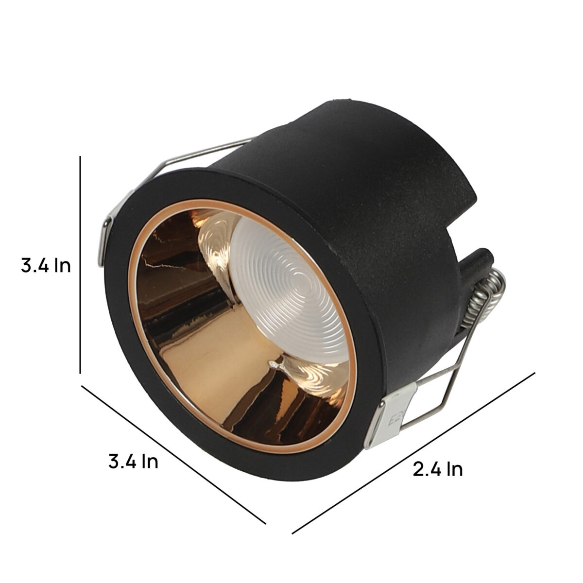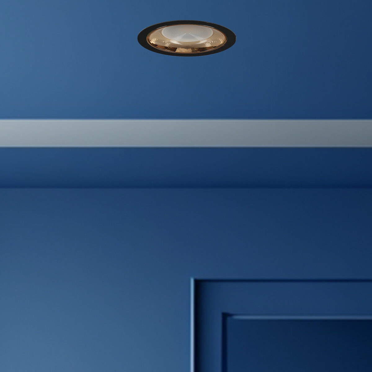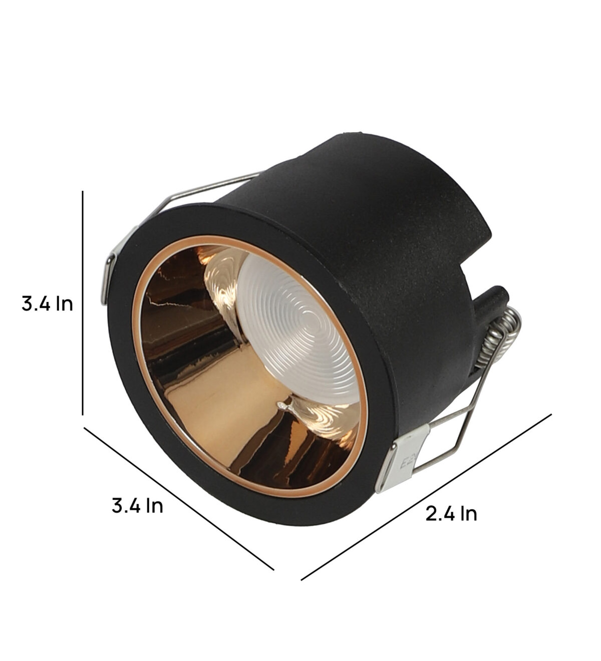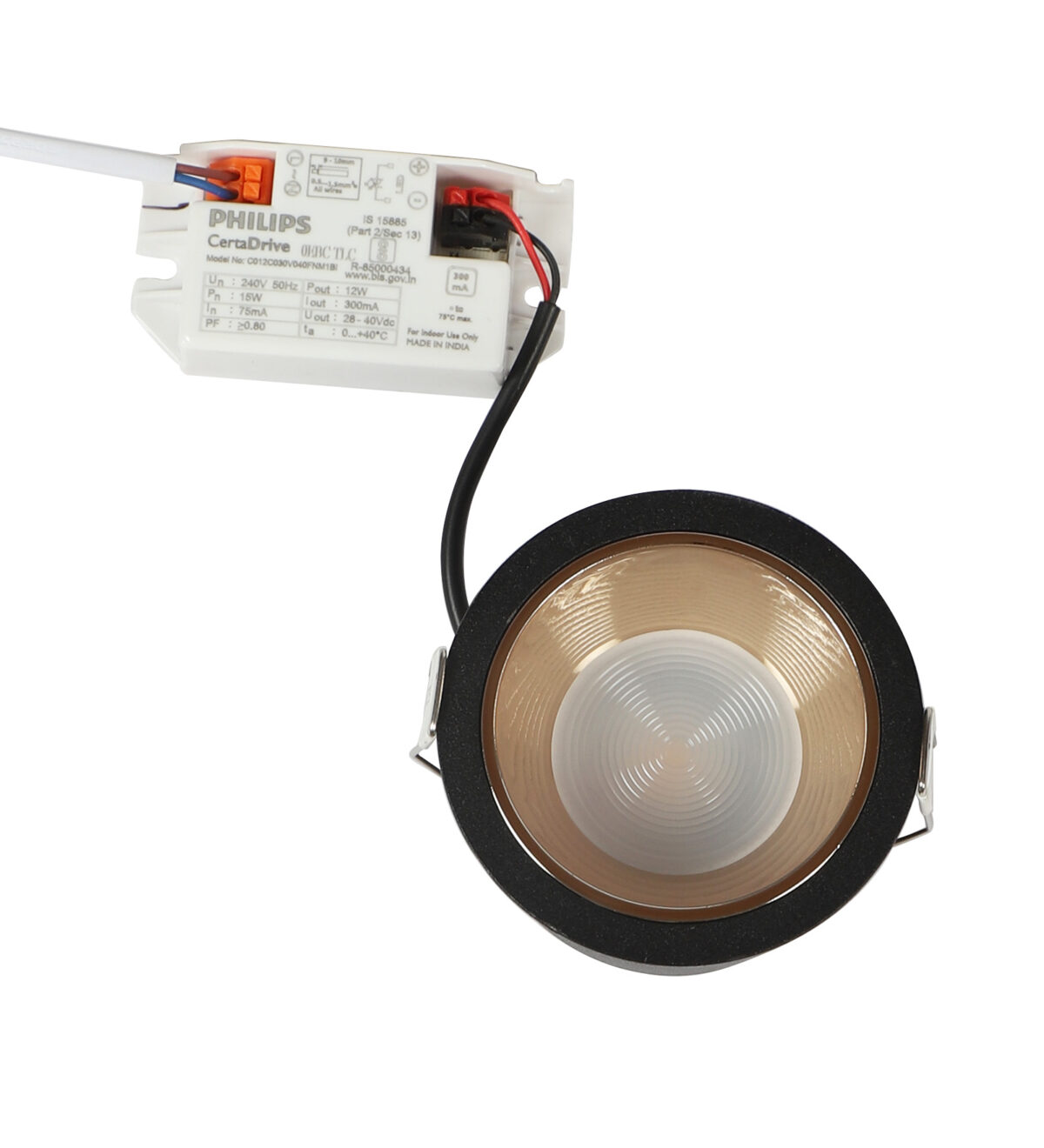Powder coated black finish with rose gold reflector, aluminium die cast round 12W LED COB concealed ceiling light with top branded Bridgelux LED and Philips or equivalent LED driver. Application includes both indoor and outdoor ceilings. Available in 3000K, 4000K and 6000K ie warm white, nuetral white and white light output.