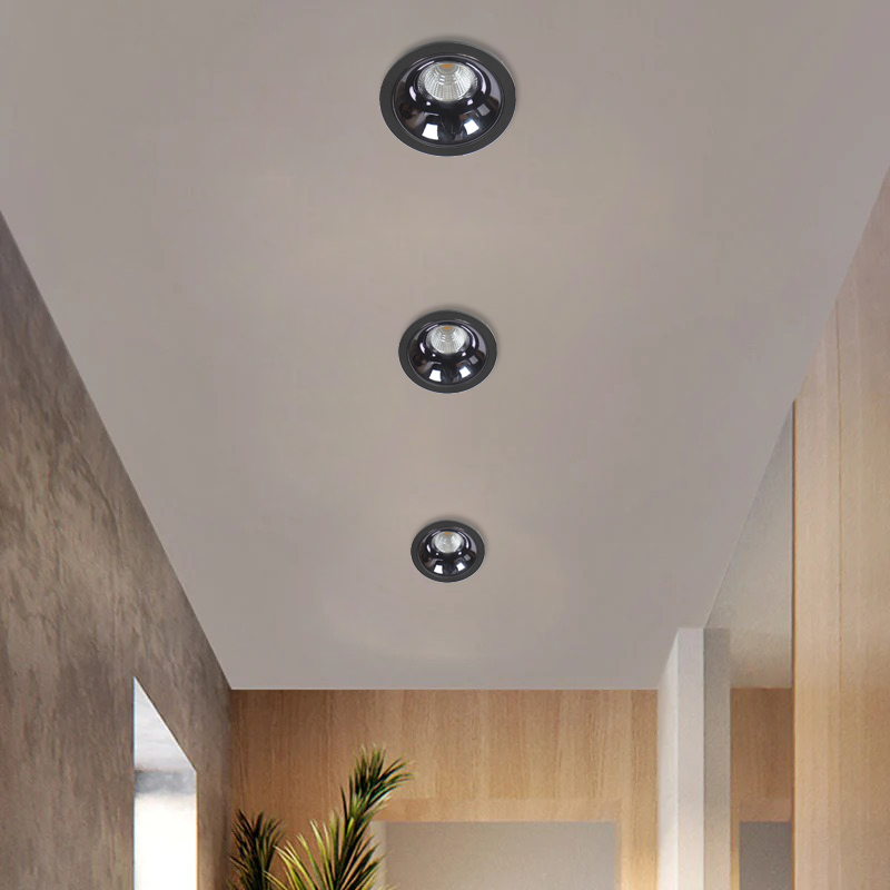 Powder coated black finish with glossy black reflector, aluminium die cast round 7W LED COB concealed ceiling light with top branded Bridgelux LED and Philips or equivalent LED driver. Application includes both indoor and outdoor ceilings. Available in 3000K, 4000K and 6000K ie warm white, nuetral white and white light output. Also available in 5000k colour temperature and colour changing 3 in 1 options.