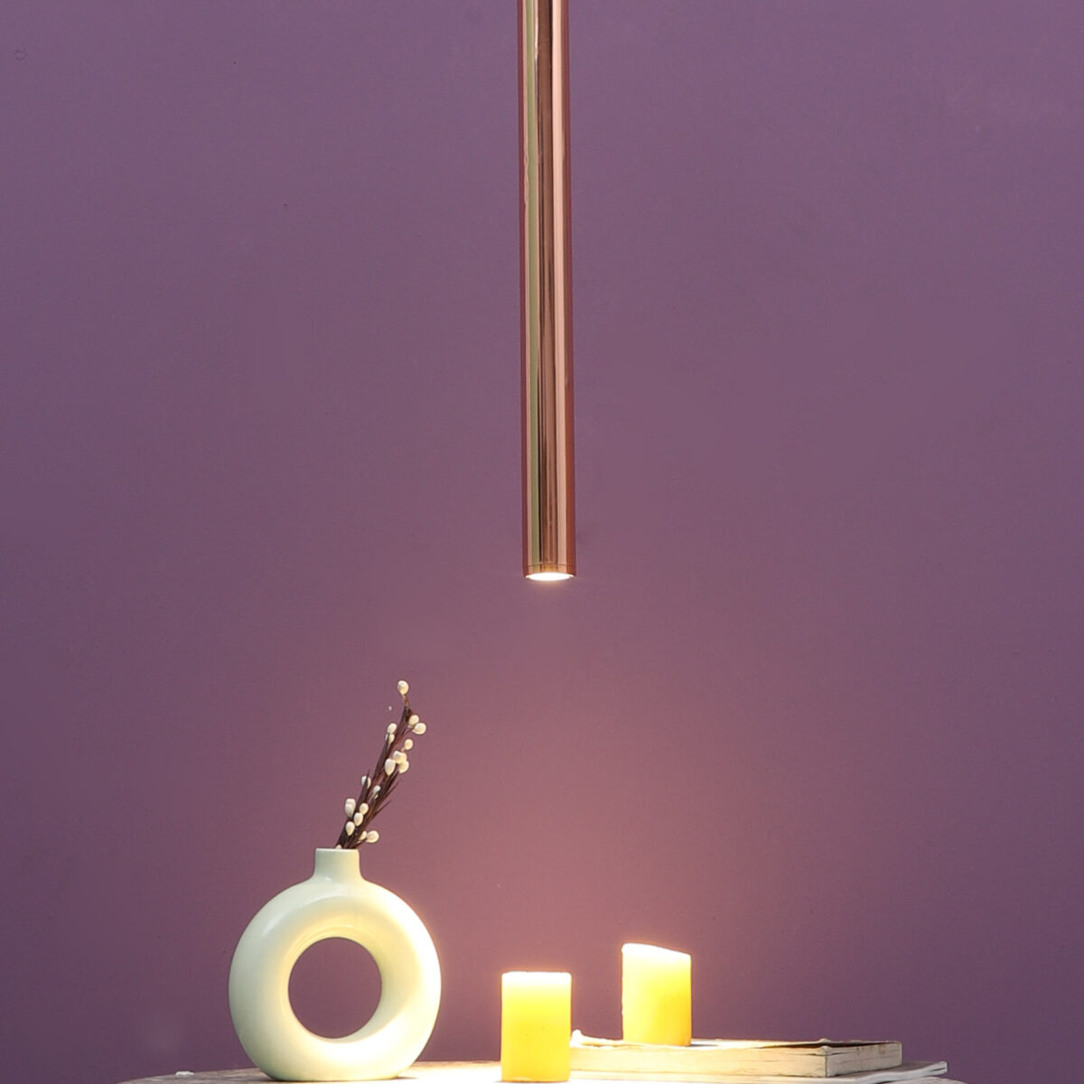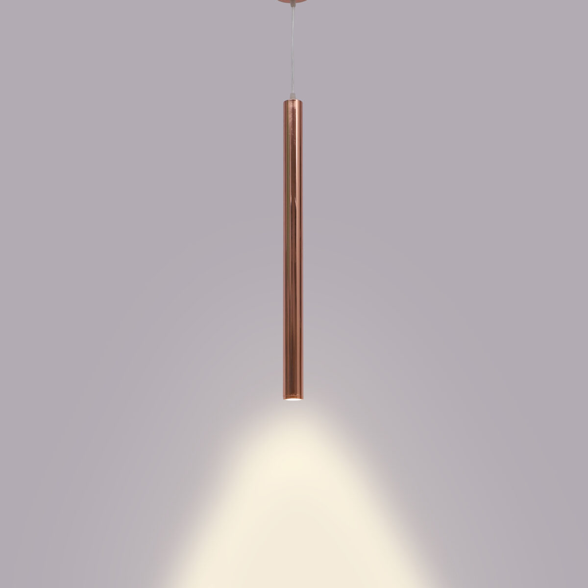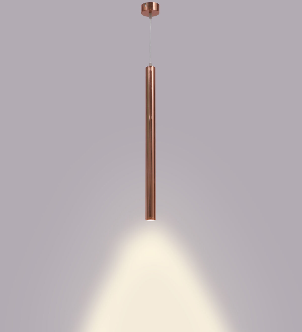 Copper sleek, modern, 12 watt LED hanging light having top branded LED and driver warm white (yellow) light output The suspension can be adjusted at time of installation to the desired height. Can be made available in a cluster of multiple quantities with round, square or rectangular base as per requirement . Application includes both residential and commercial premises wherever it matches with your interiors. Can be customized as per requirement in terms of finish, wattage, height, diameter.