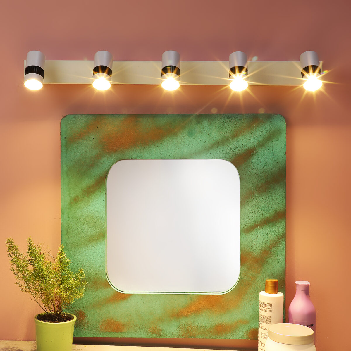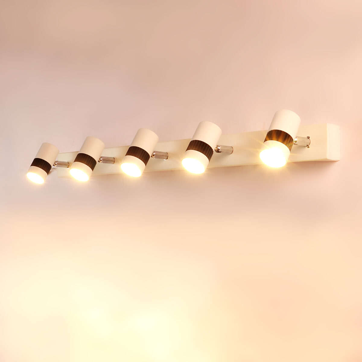 Aluminium die cast, premium powder coated adjustable picture light in white finish. It is having with five spots of 3W each to provide a very bright output. Total wattage is 15 watt having warm white (yellow) light output. The light emitting spot is mounted on a rotatable neck which can be rotated in all the directions enabling spot to be positioned wherever required. Picture lights are functional wall lights which offer a direct light on the object we need to enhance. Can also be made available in white (6000K) and neutral white (4000K) light output for bulk requirement. Also available in one, two, three, four, six spot options with code B1069-WW, ML382-2, ML382-3, ML382-4, ML382-6. Black body also available with codes B1098-WW, ML383-2, ML383-3, ML383-4, ML383-5, ML383-6.