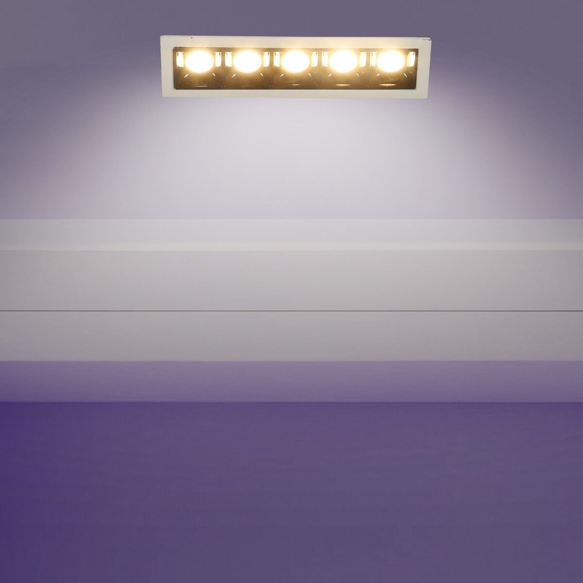 Aluminium die cast powder coated white finish 5 x 2.4 watt LED Linear down light with Bridgelux COB and Philips LED driver. Used in ultra modern spaces.