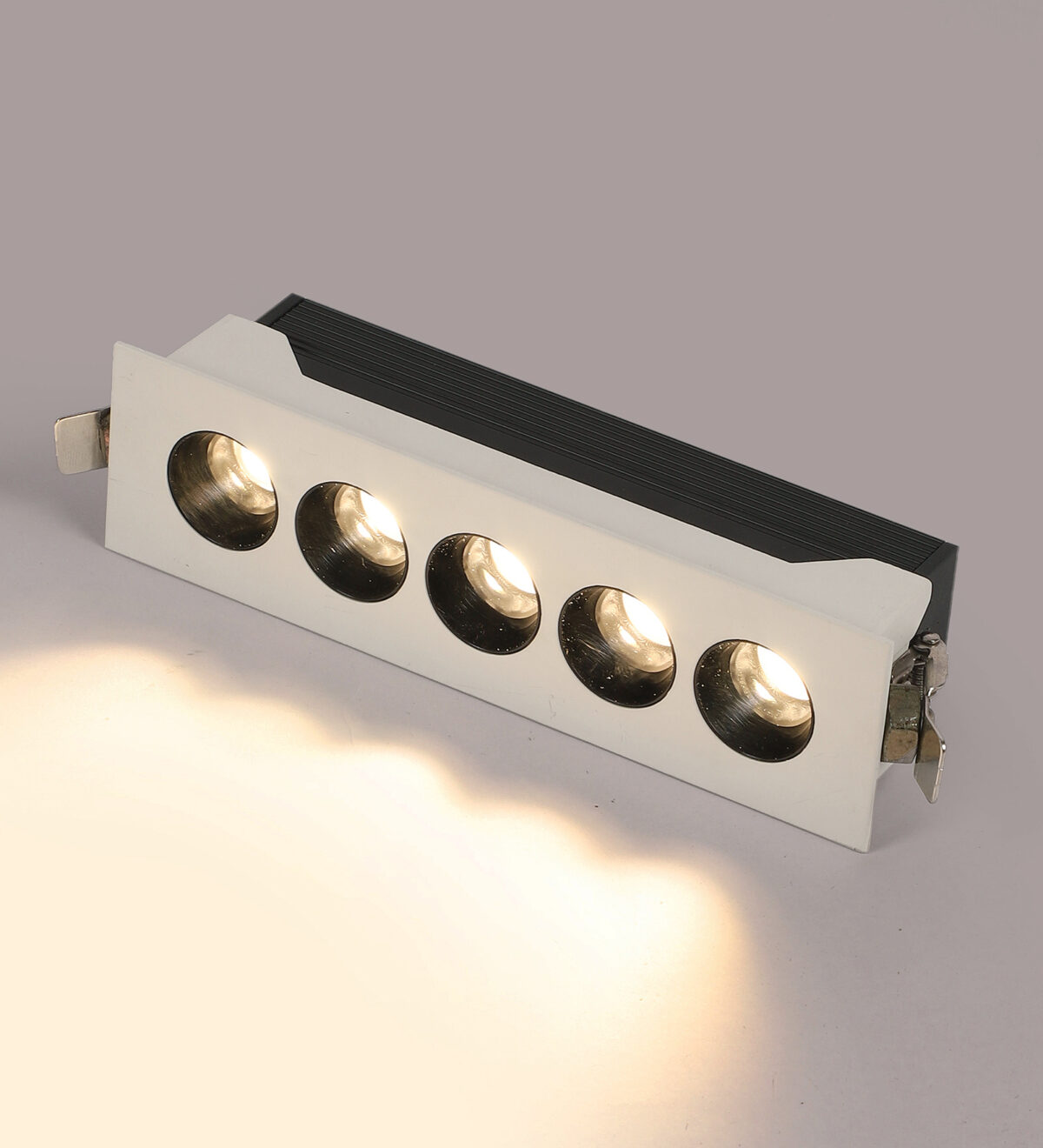 LEARC aluminium white finish 5 X 2.4 watt LED Linear down light with Bridgelux COB and Fulham LED driver.
