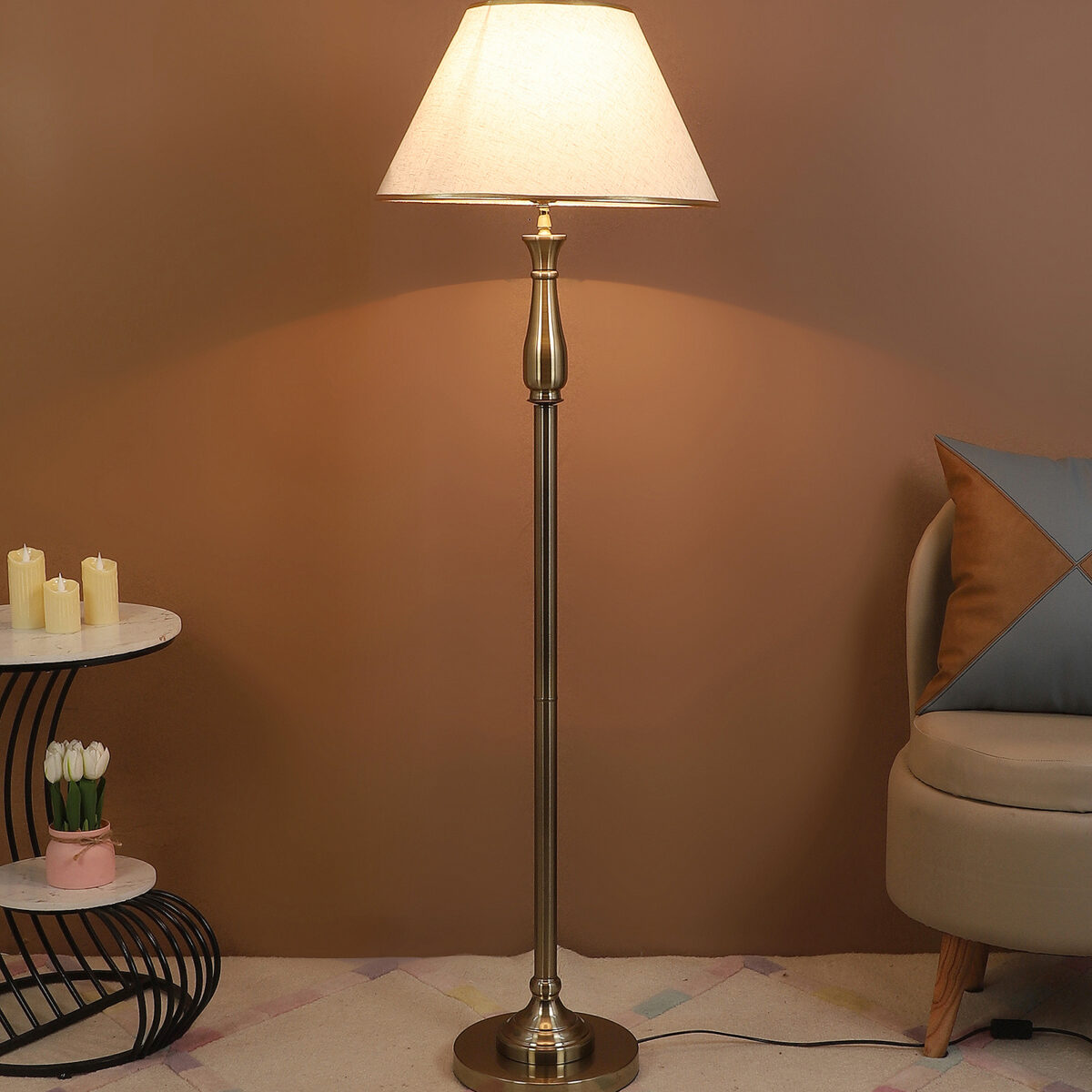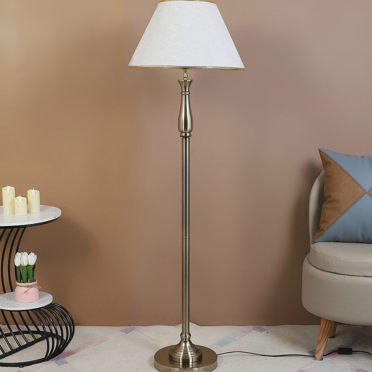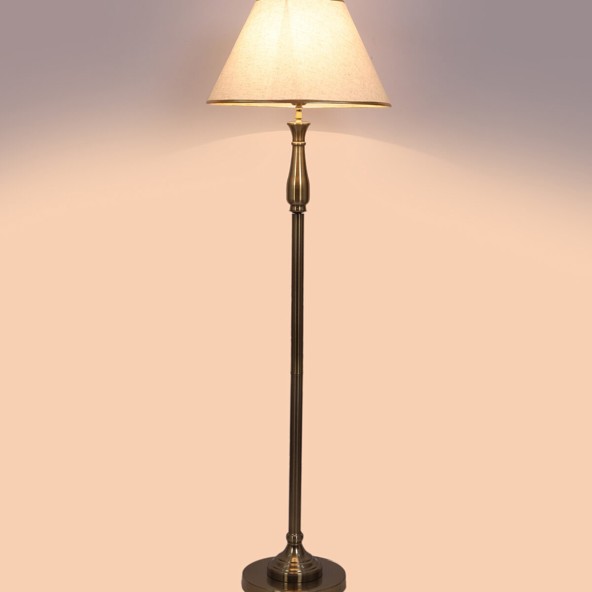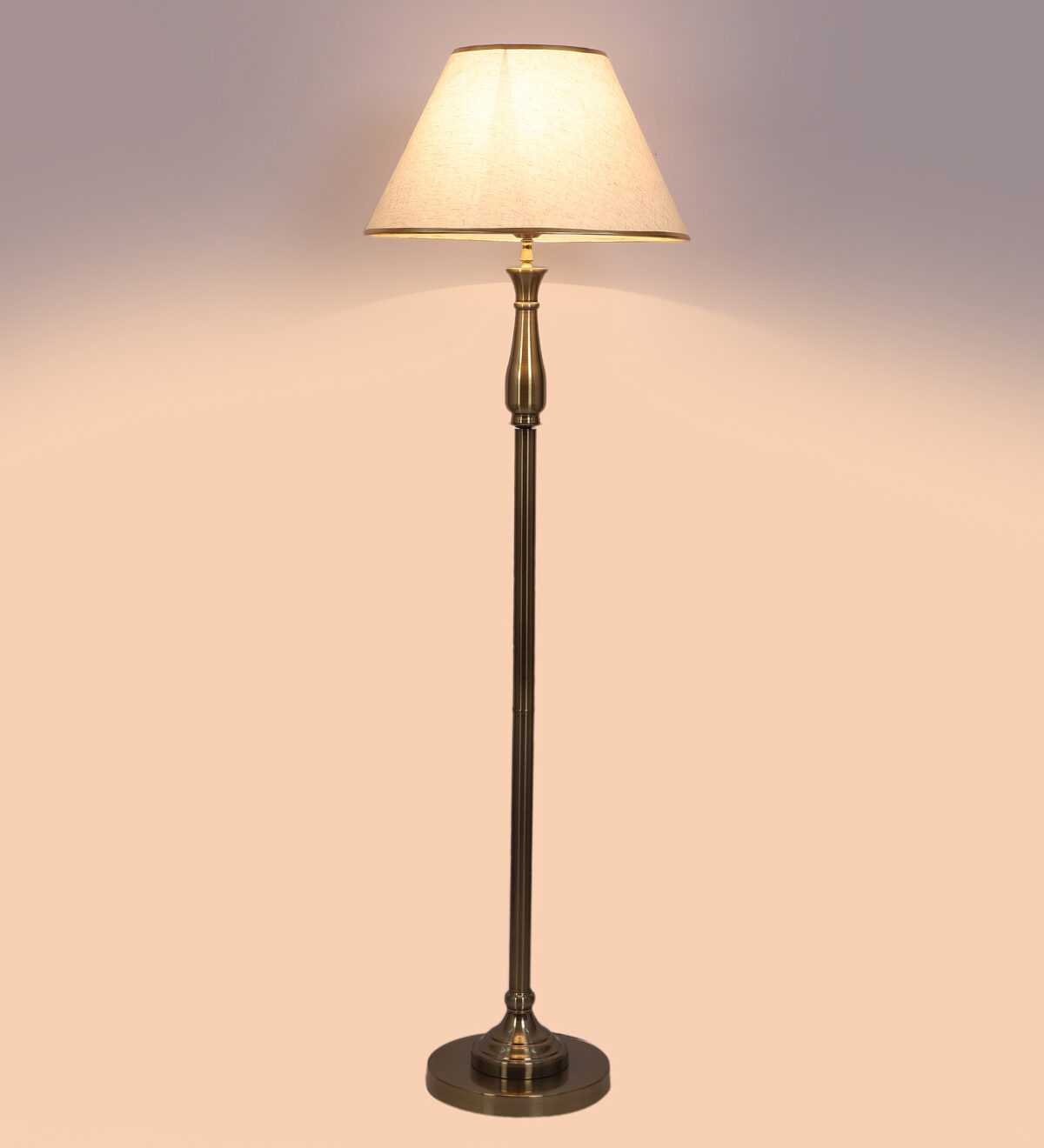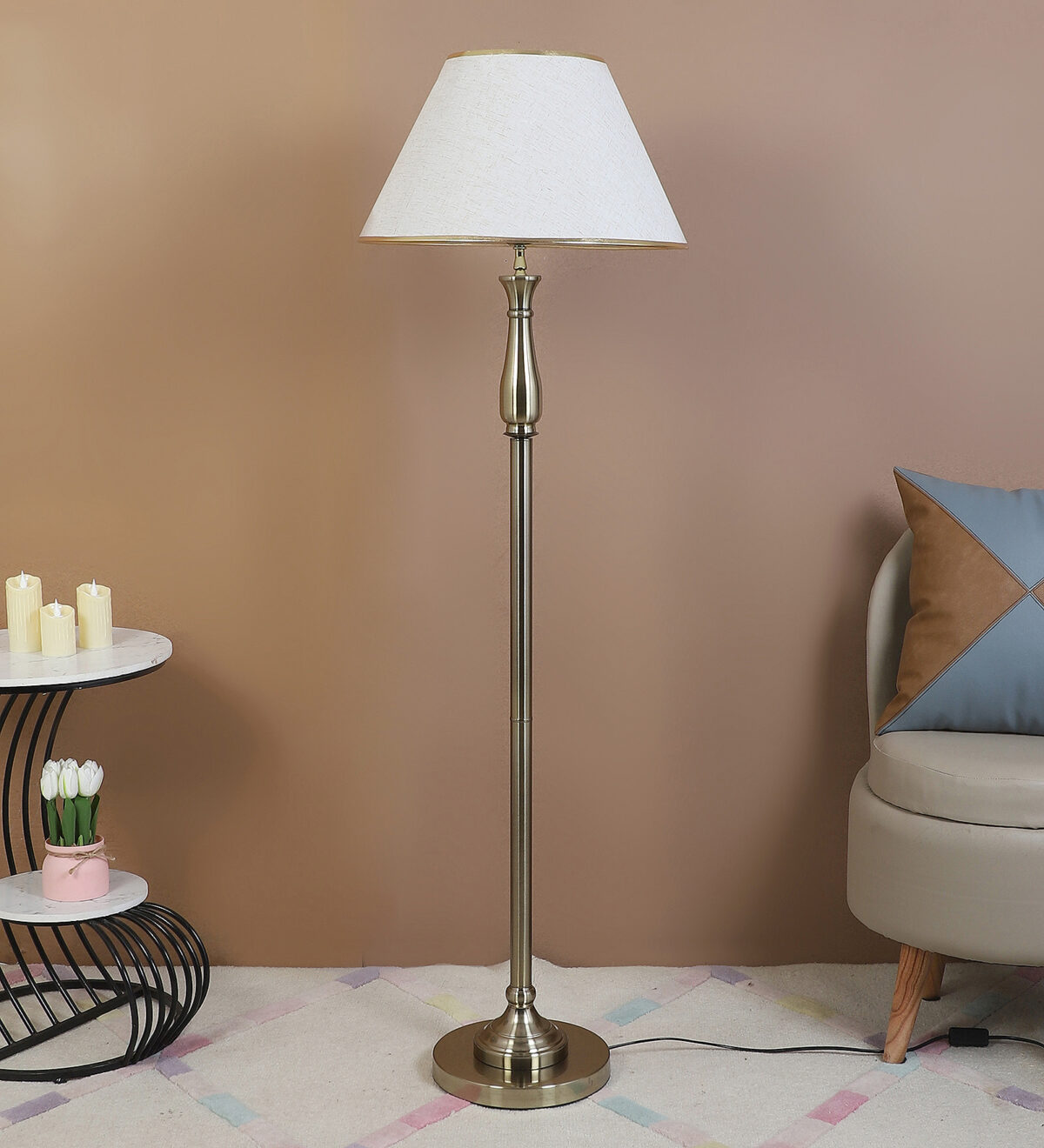 LEARC antique brass finish floor lamp with cream textured shade having golden border. LAMP NOT INCLUDED.