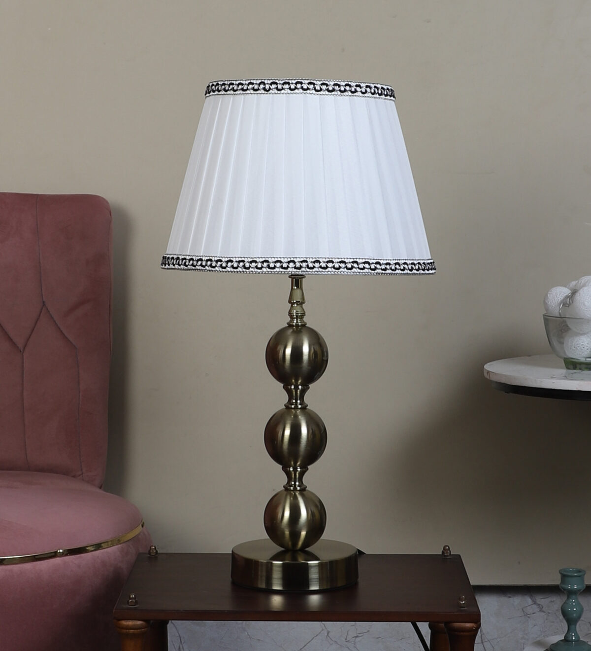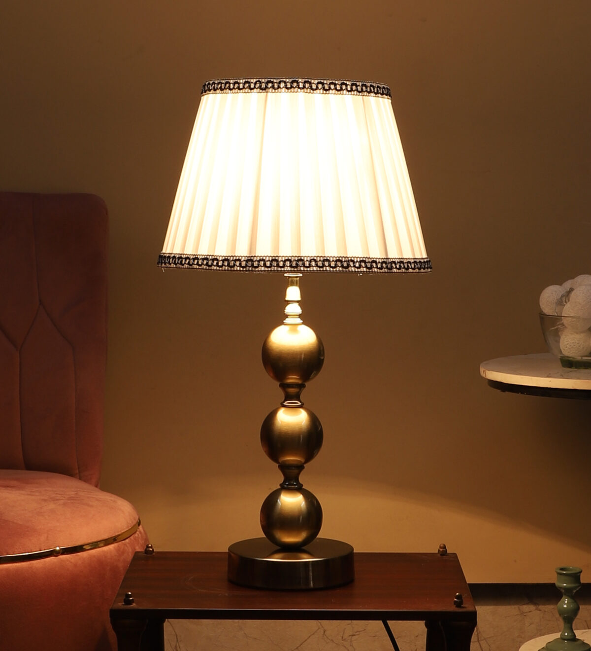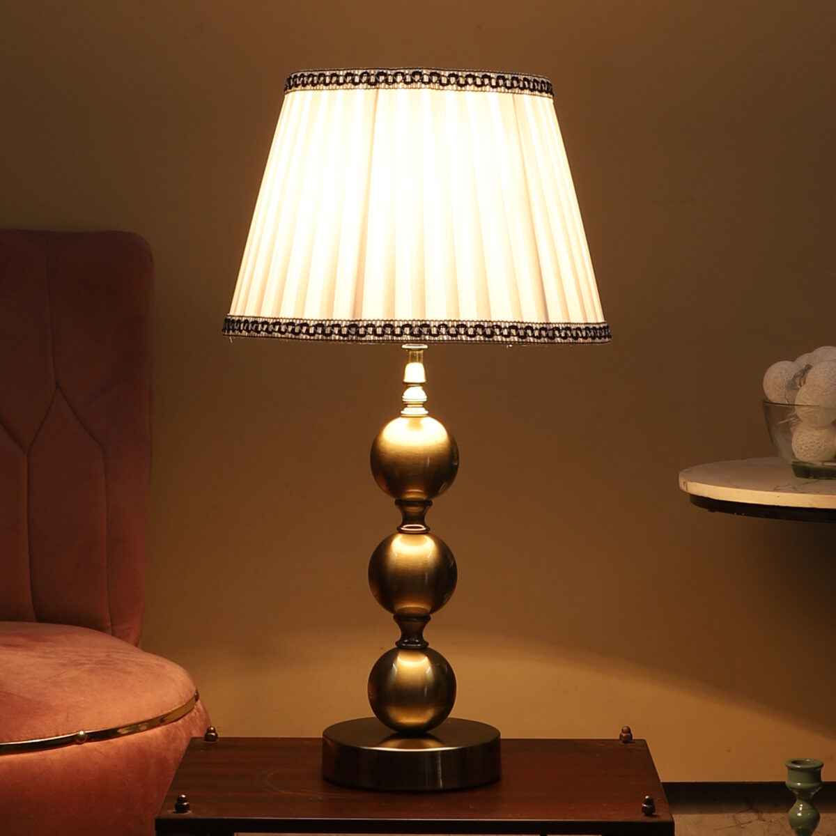 LEARC antique brass finish table lamp with cream shade. LAMP NOT INCLUDED.