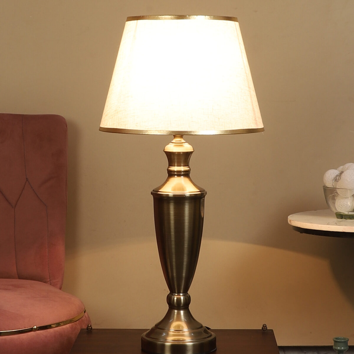 LEARC antique brass finish table lamp with cream textured shade having golden border. LAMP NOT INCLUDED.