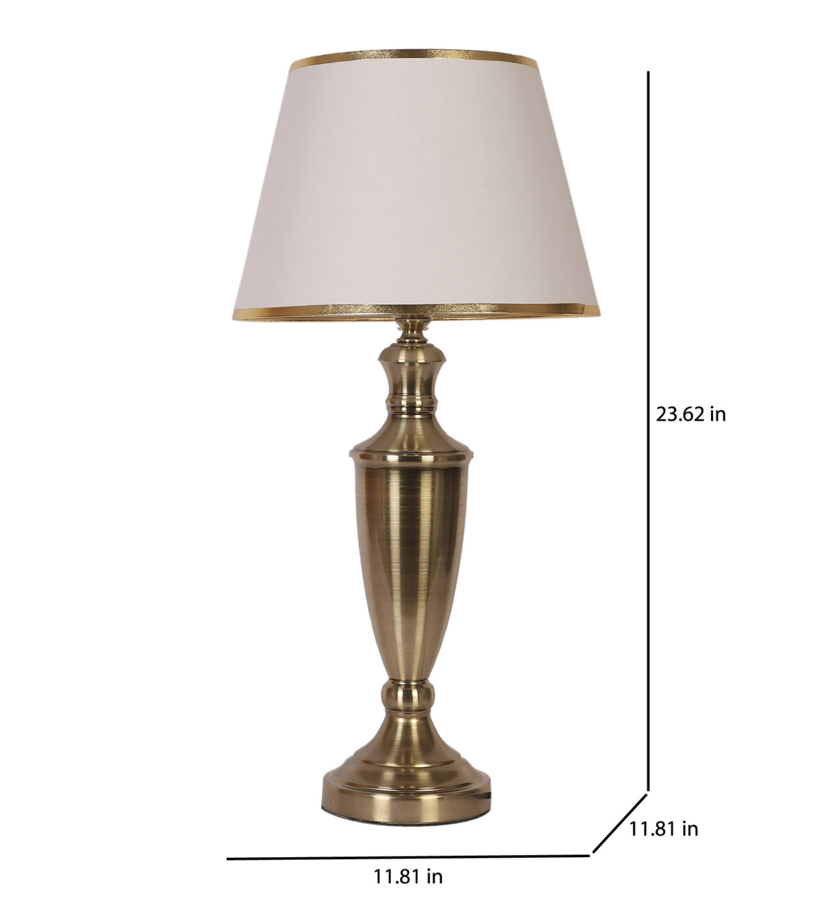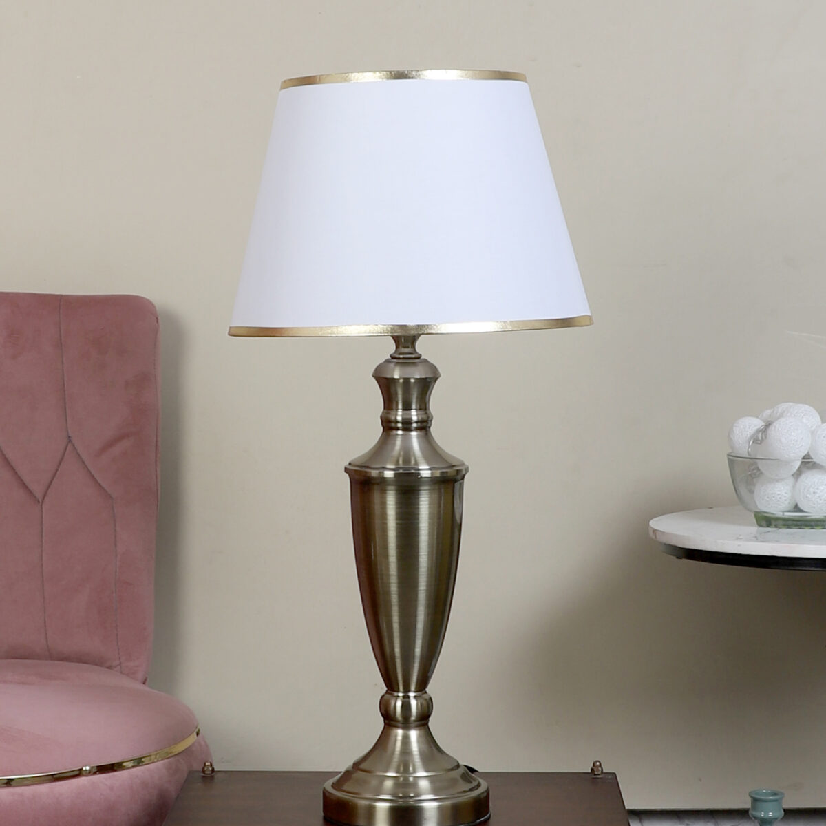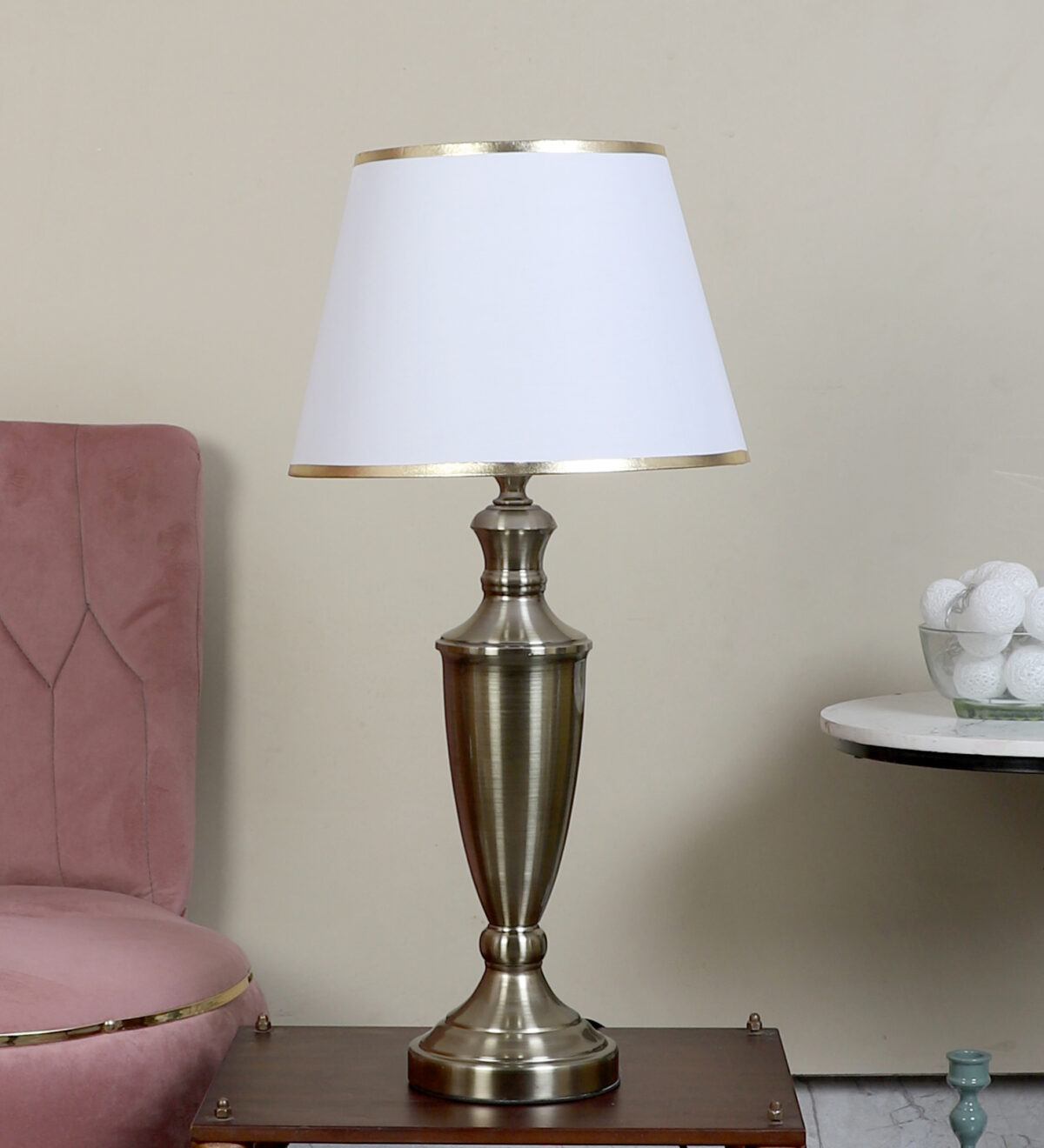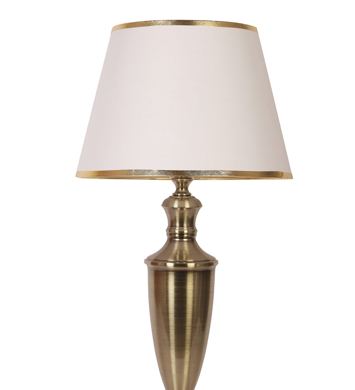 LEARC antique brass finish table lamp with white shade having golden border. LAMP NOT INCLUDED.