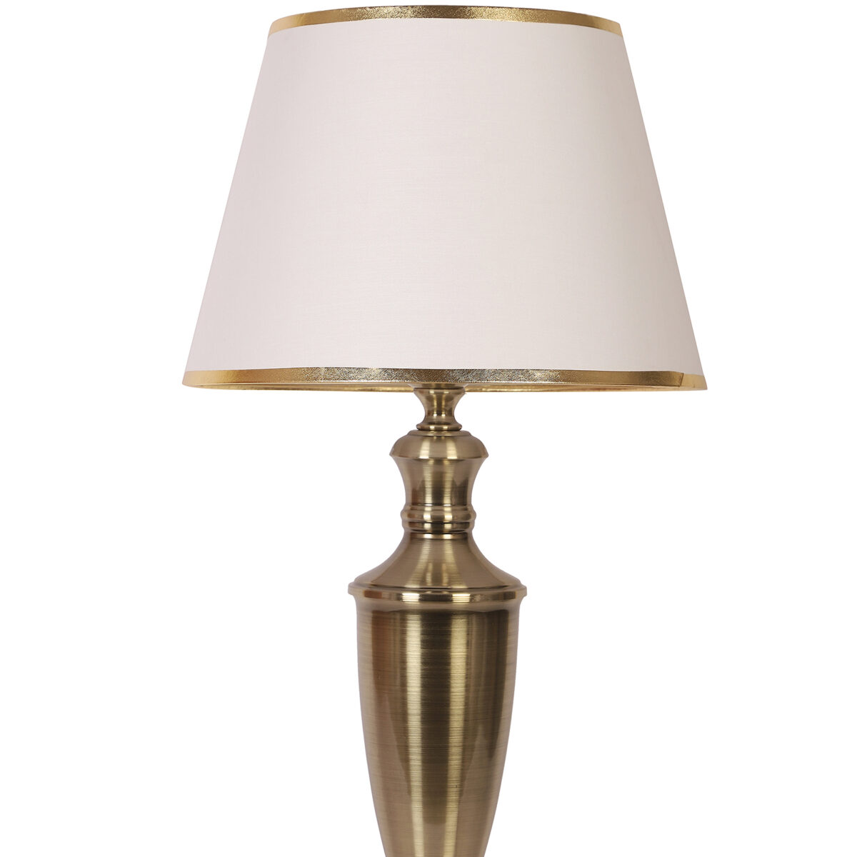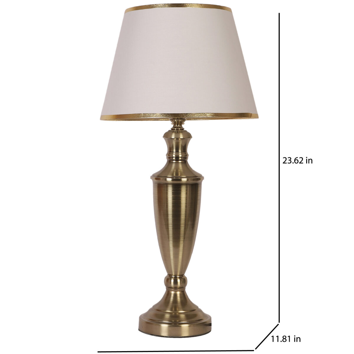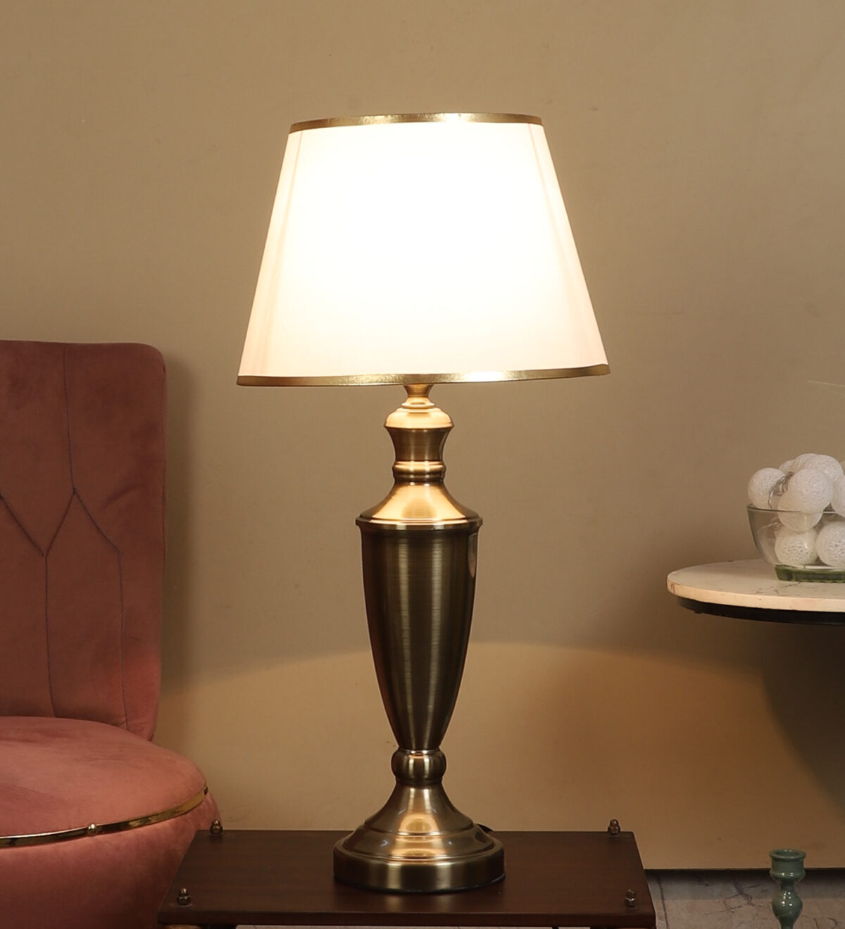 LEARC antique brass finish table lamp with white shade having golden border. LAMP NOT INCLUDED.