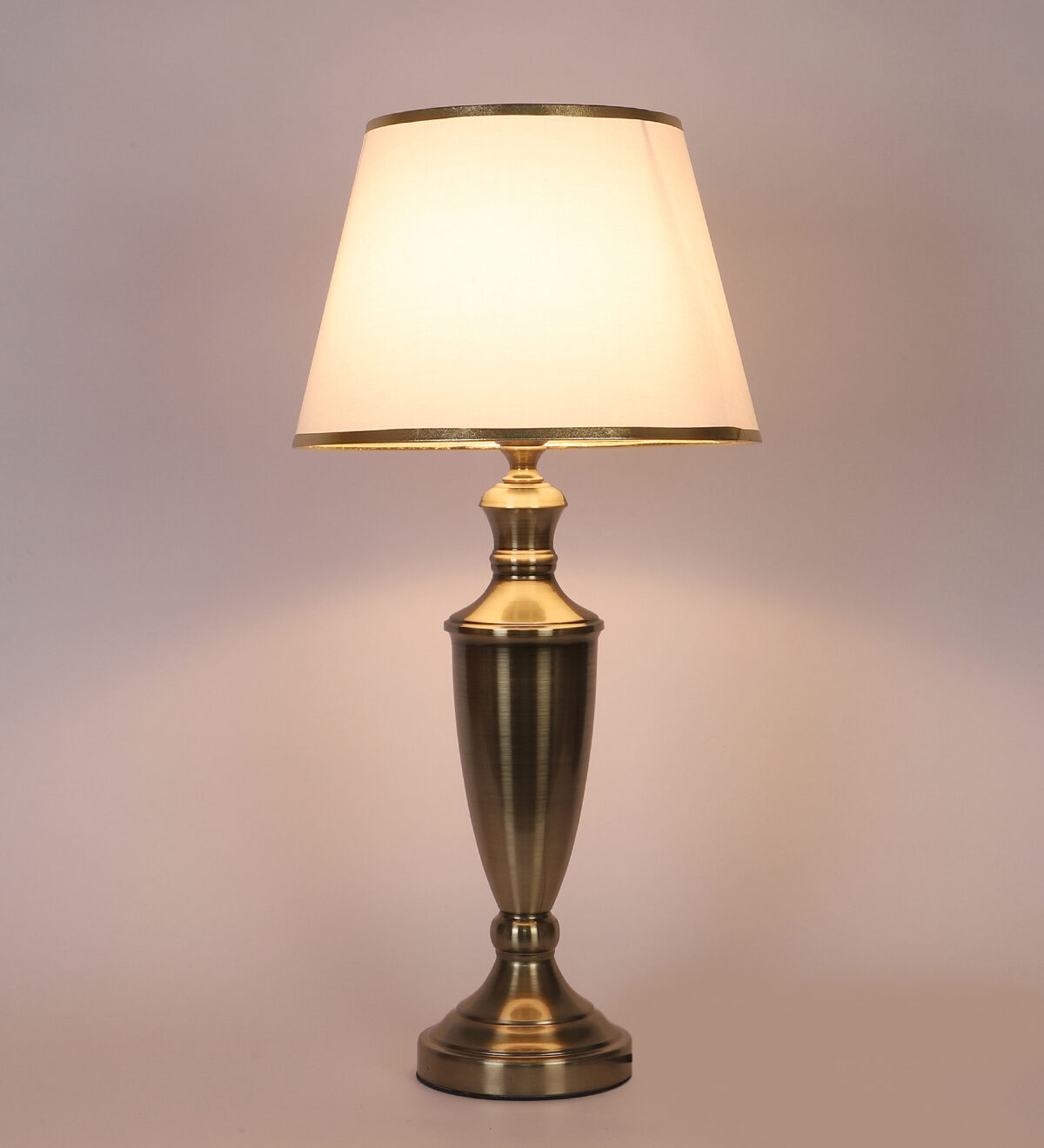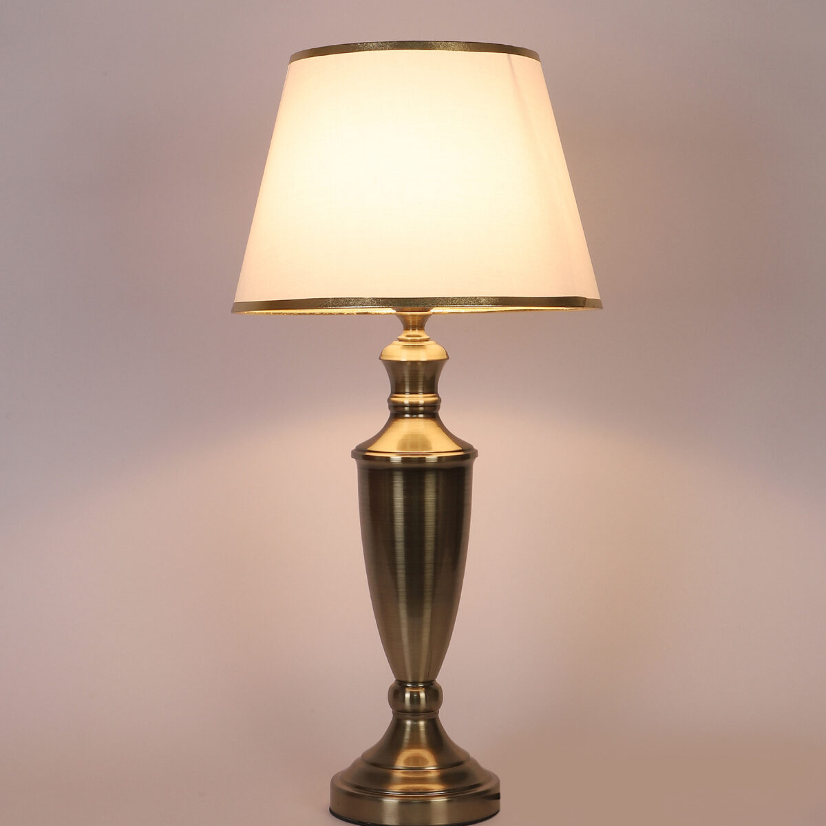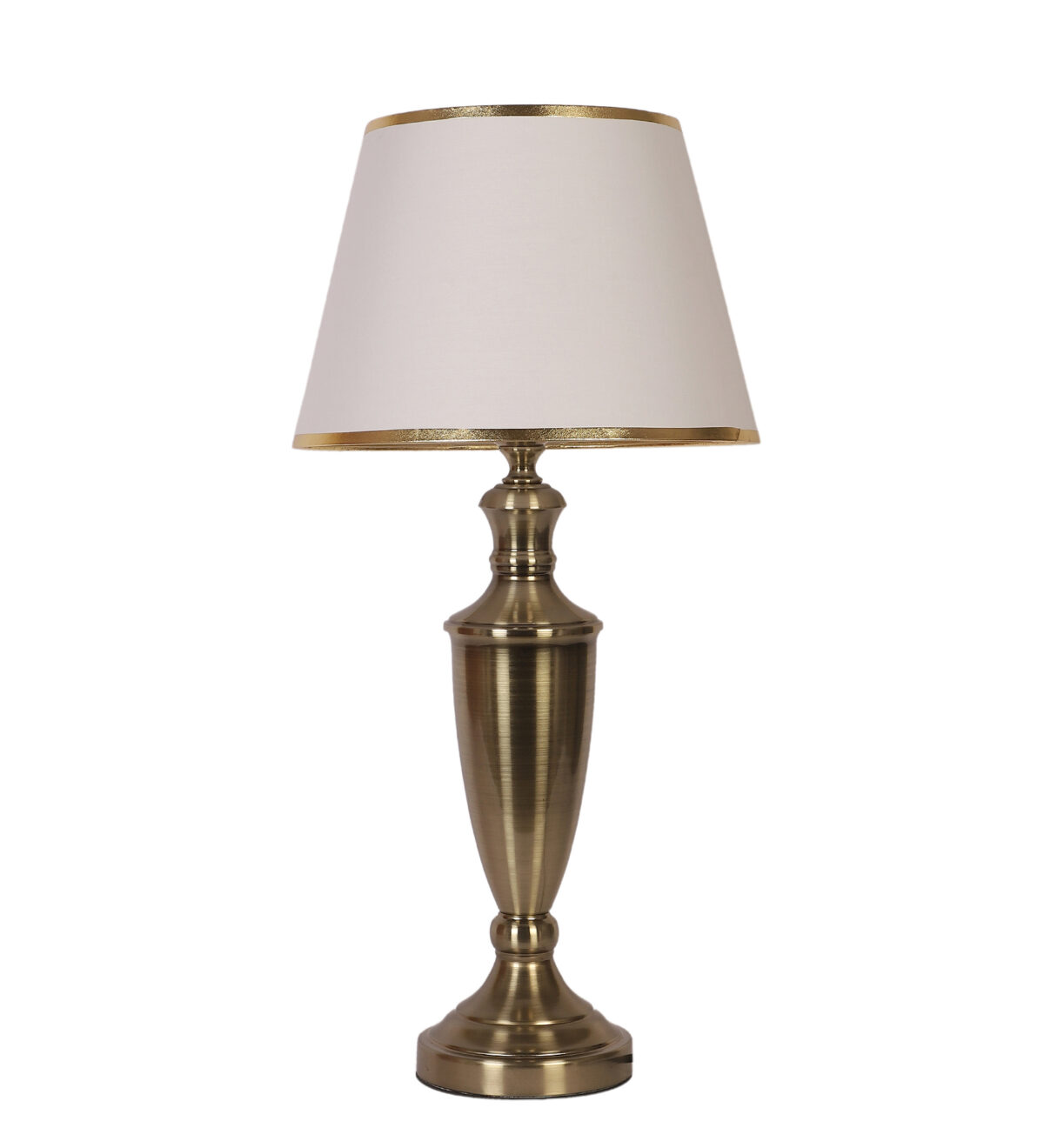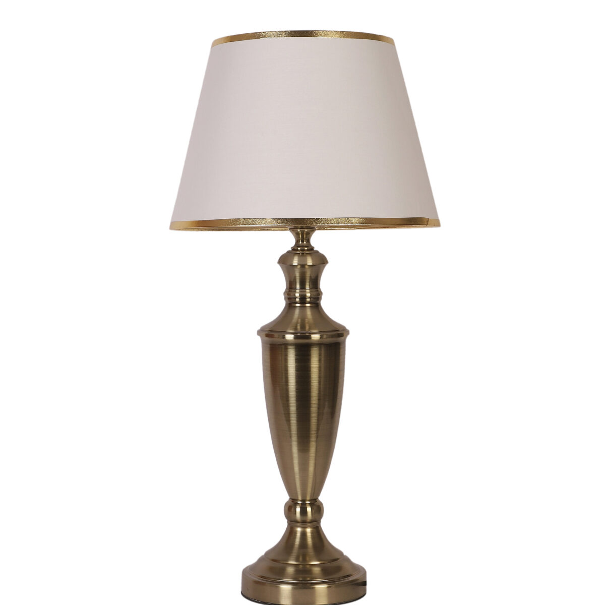 LEARC antique brass finish table lamp with white shade having golden border. LAMP NOT INCLUDED.