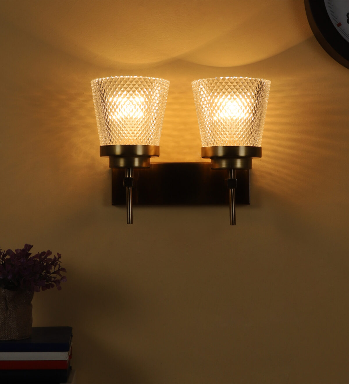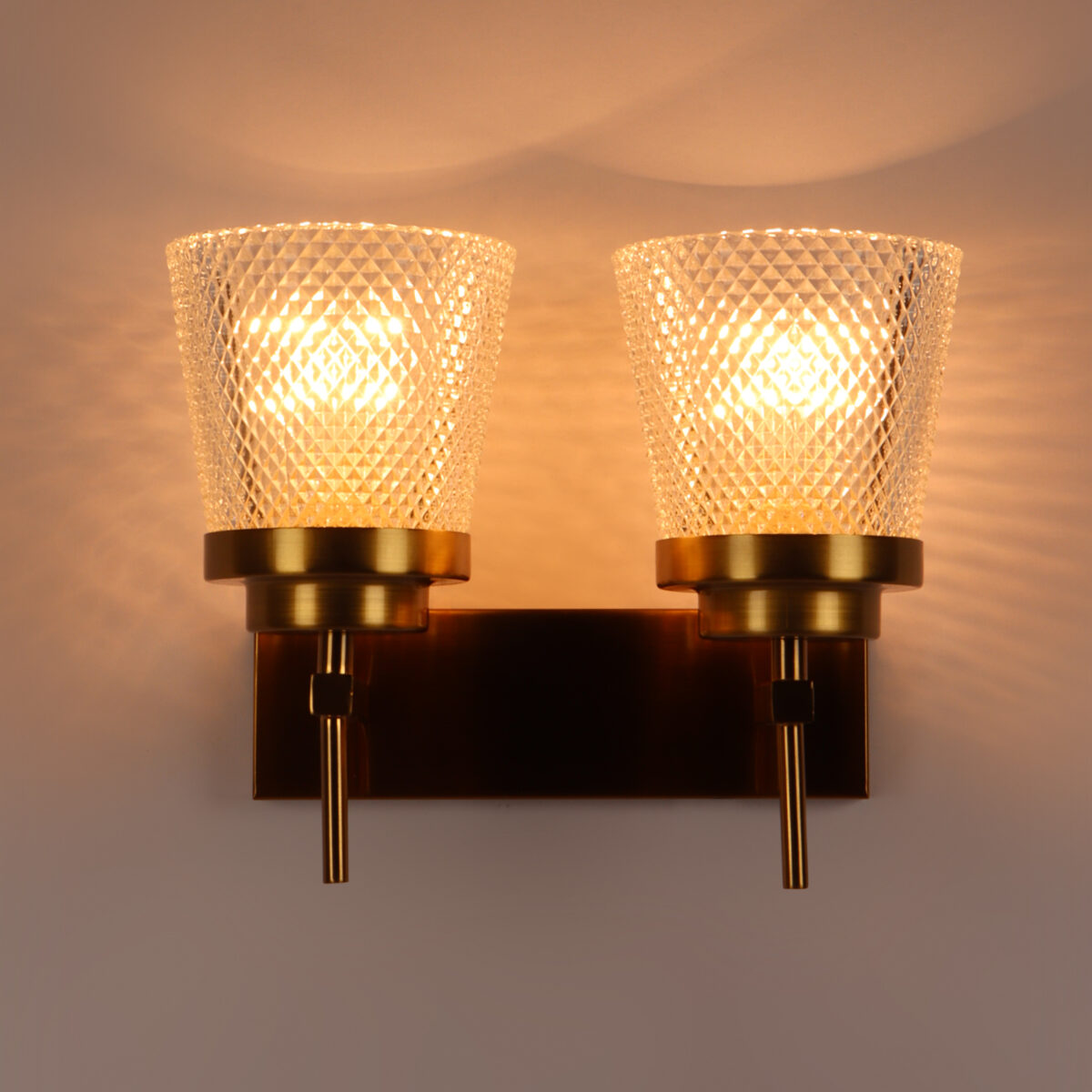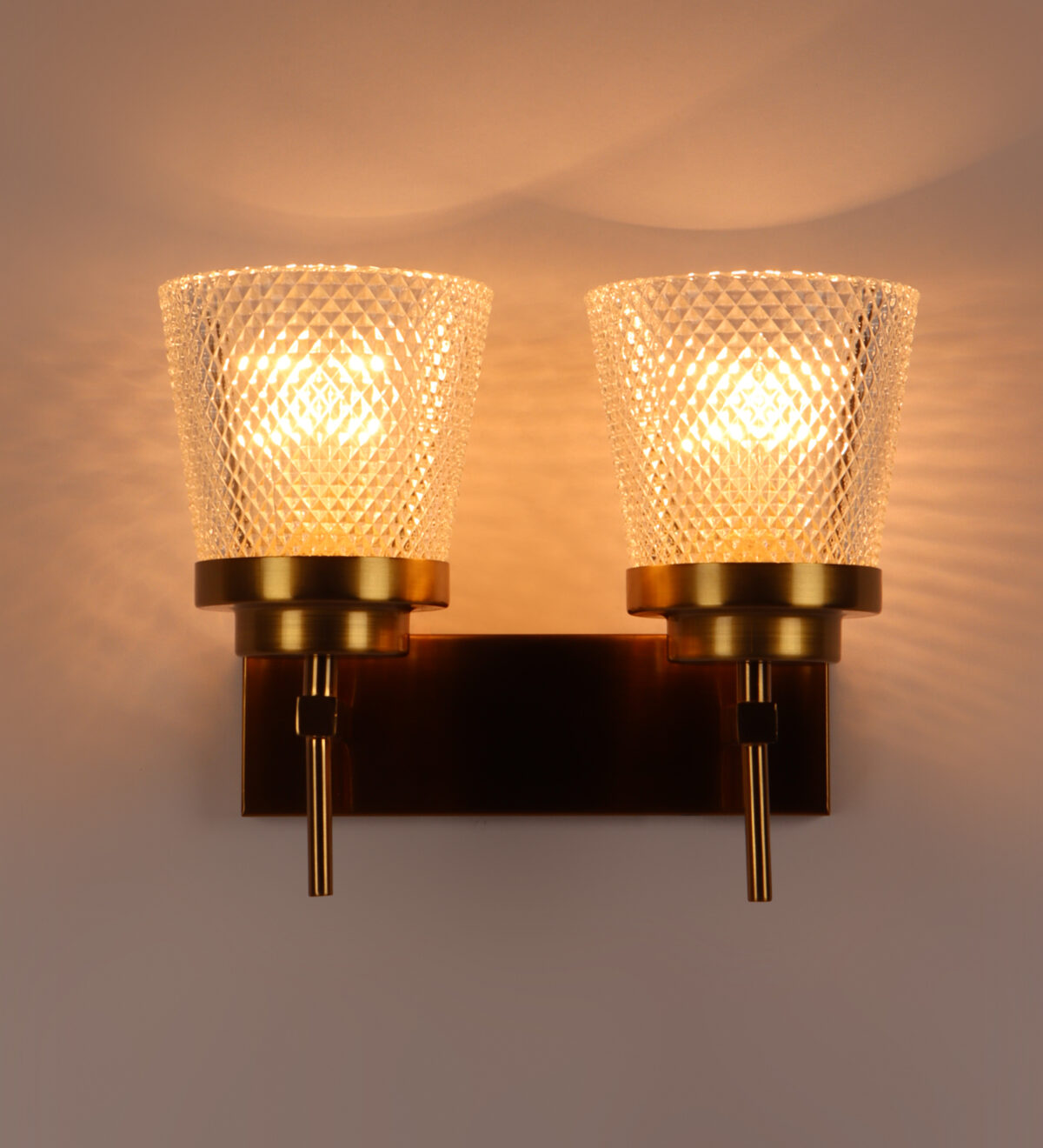 Antique brass finish double wall light having crystal glass made of mild steel. It is maintenance free., It is easy to remove glass and wash them. Comes with an E27 holder, only the change of lamp is required, which is available locally everywhere. Application includes both residential and commercial premises wherever it matches with your interiors. Matching single wall light code – WL2629. LAMP NOT INCLUDED.