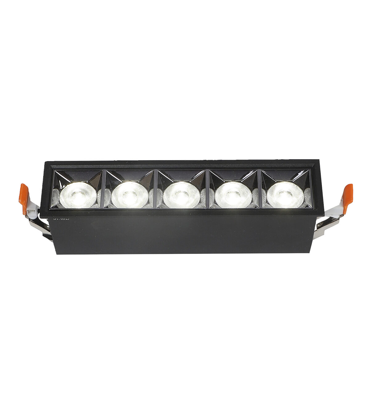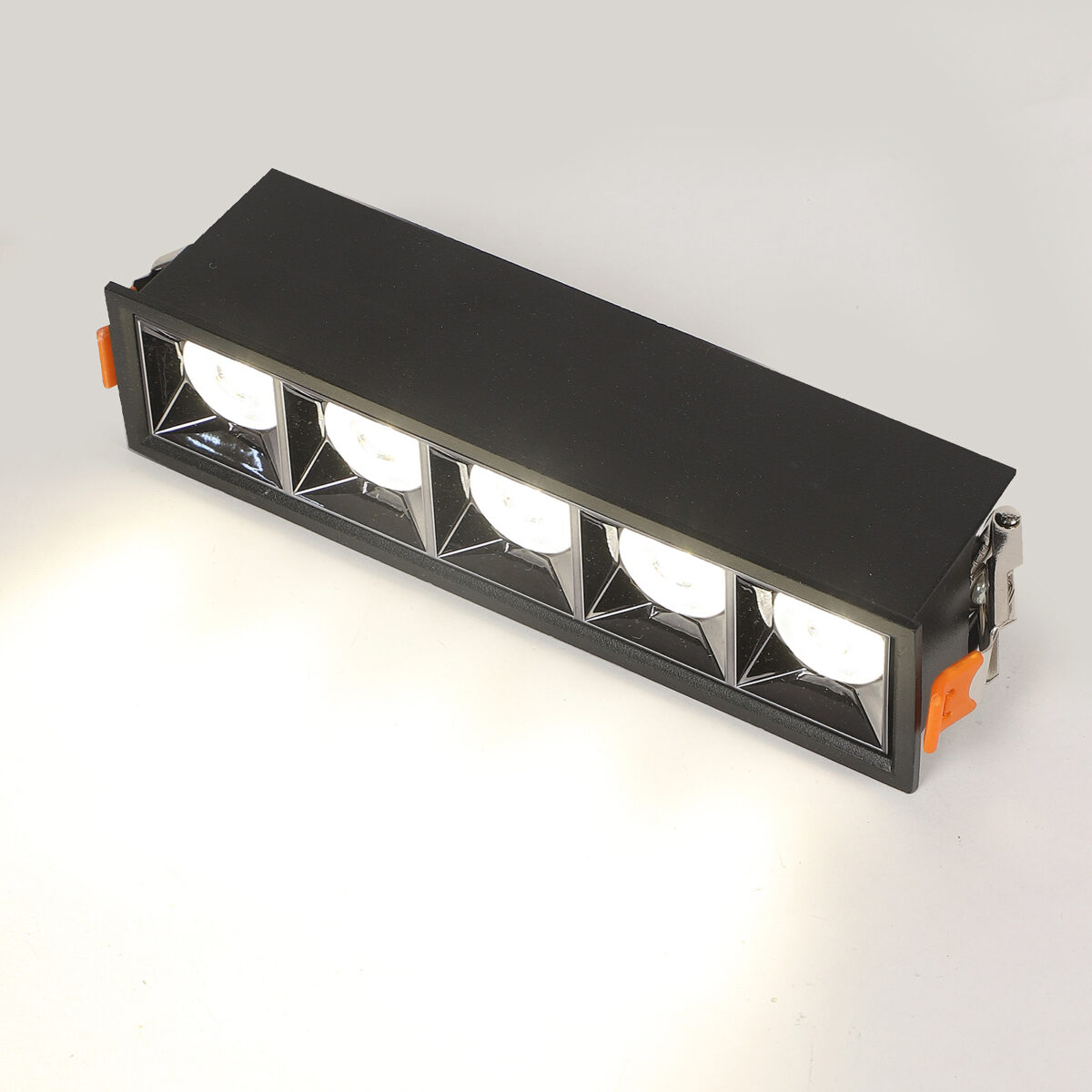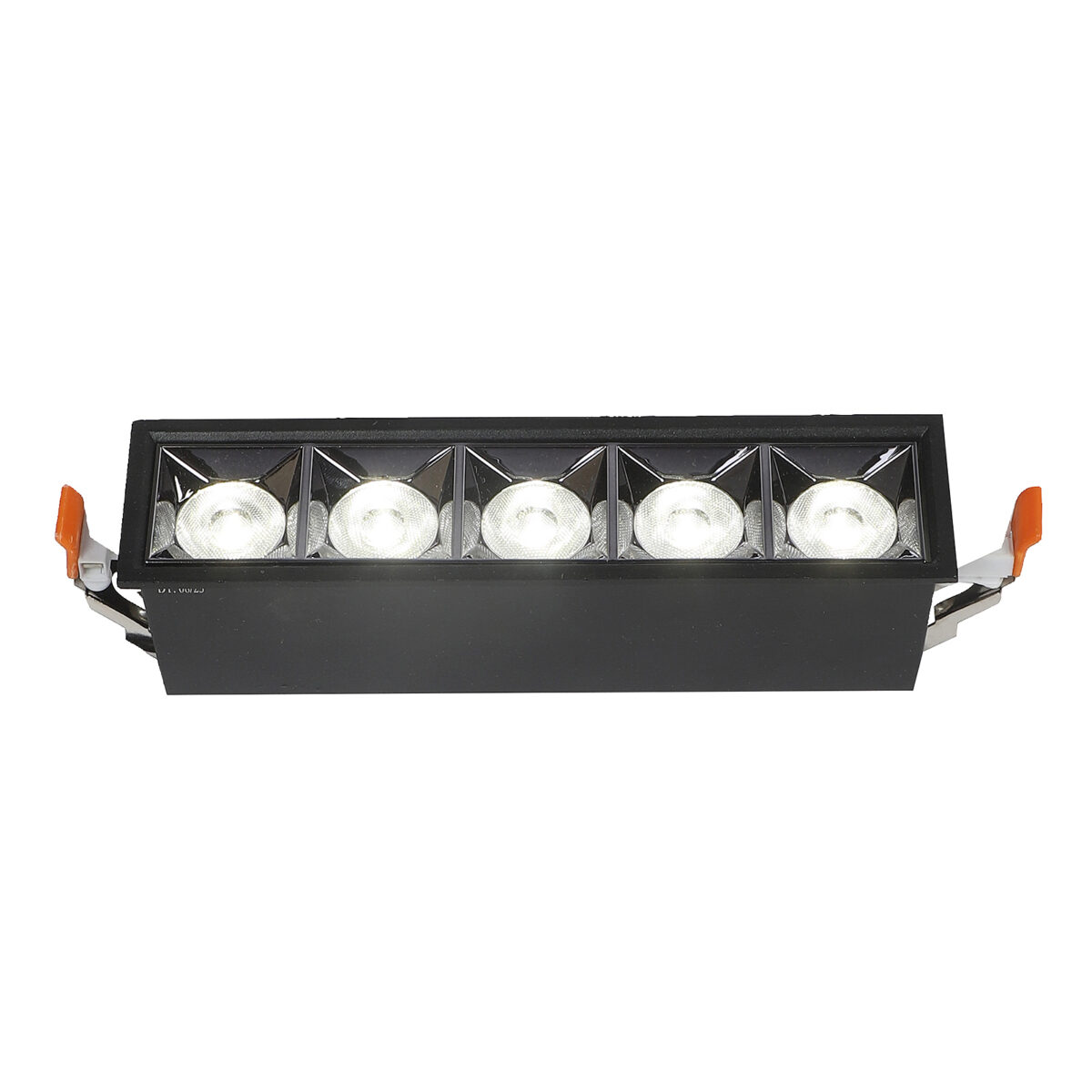 Aluminium die cast powder coated black finish 20 watt (5 X 4 watt) anti LED Linear down light with Bridgelux COB and Fulham or equivalent LED driver. Used in ultra modern spaces.
