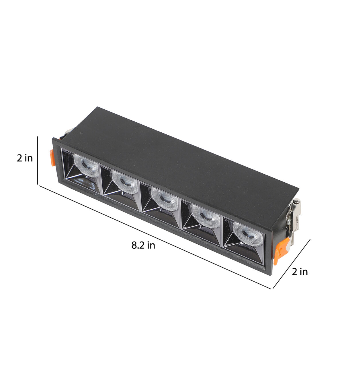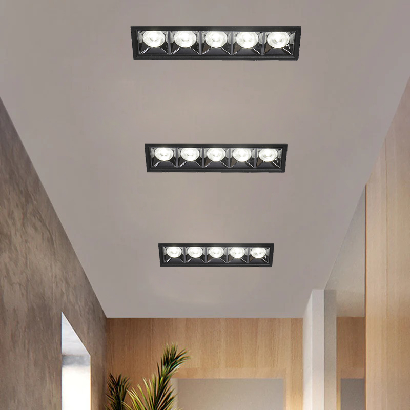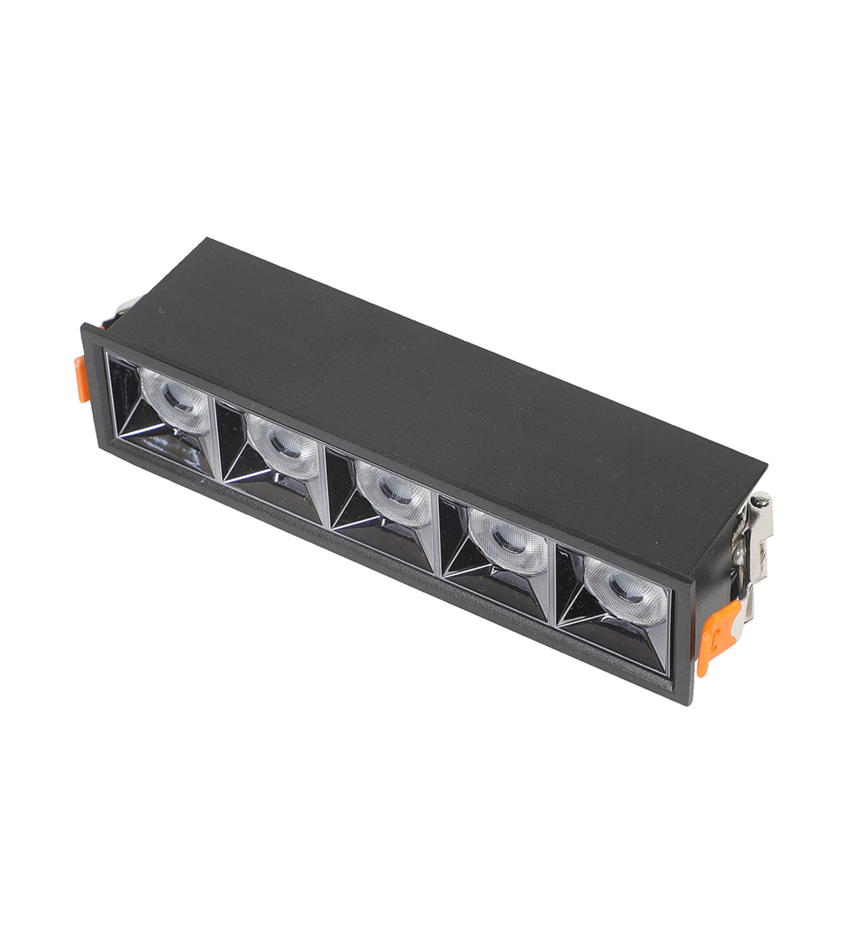 Aluminium die cast powder coated black finish 20 watt (5 X 4 watt) anti LED Linear down light with Bridgelux COB and Fulham or equivalent LED driver. Used in ultra modern spaces.