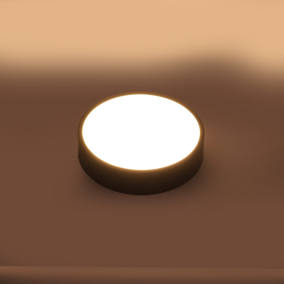 Black round LED surface seiling light with warm white (yellow) light output. Can be used both indoors and outdoors. Also avalable in white finish.