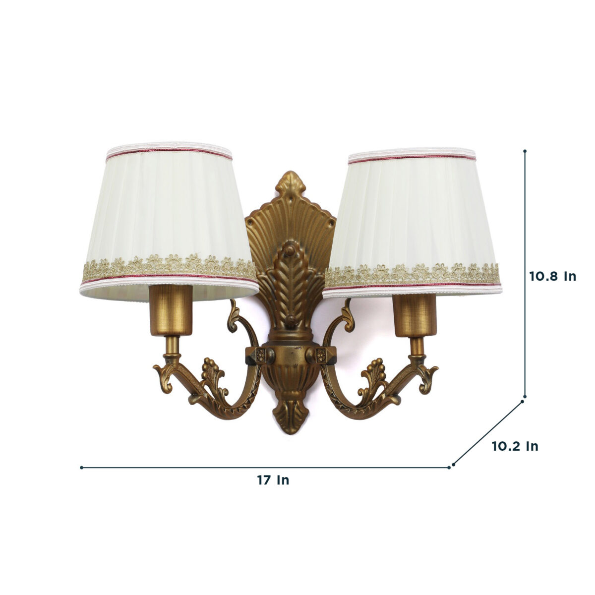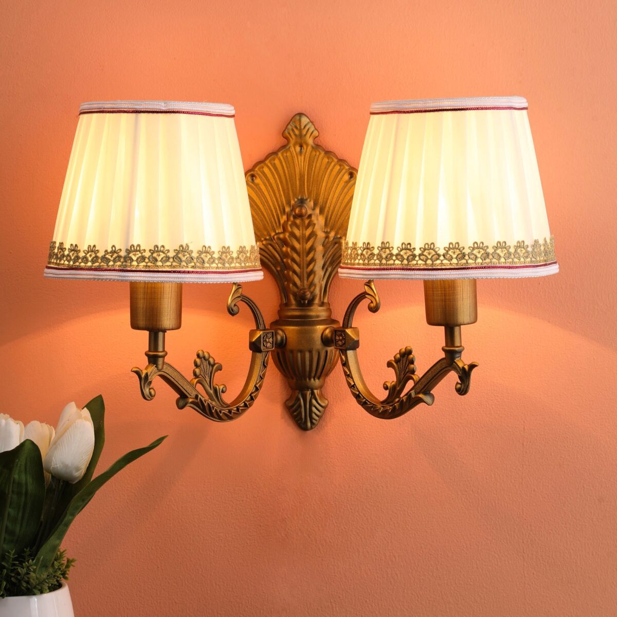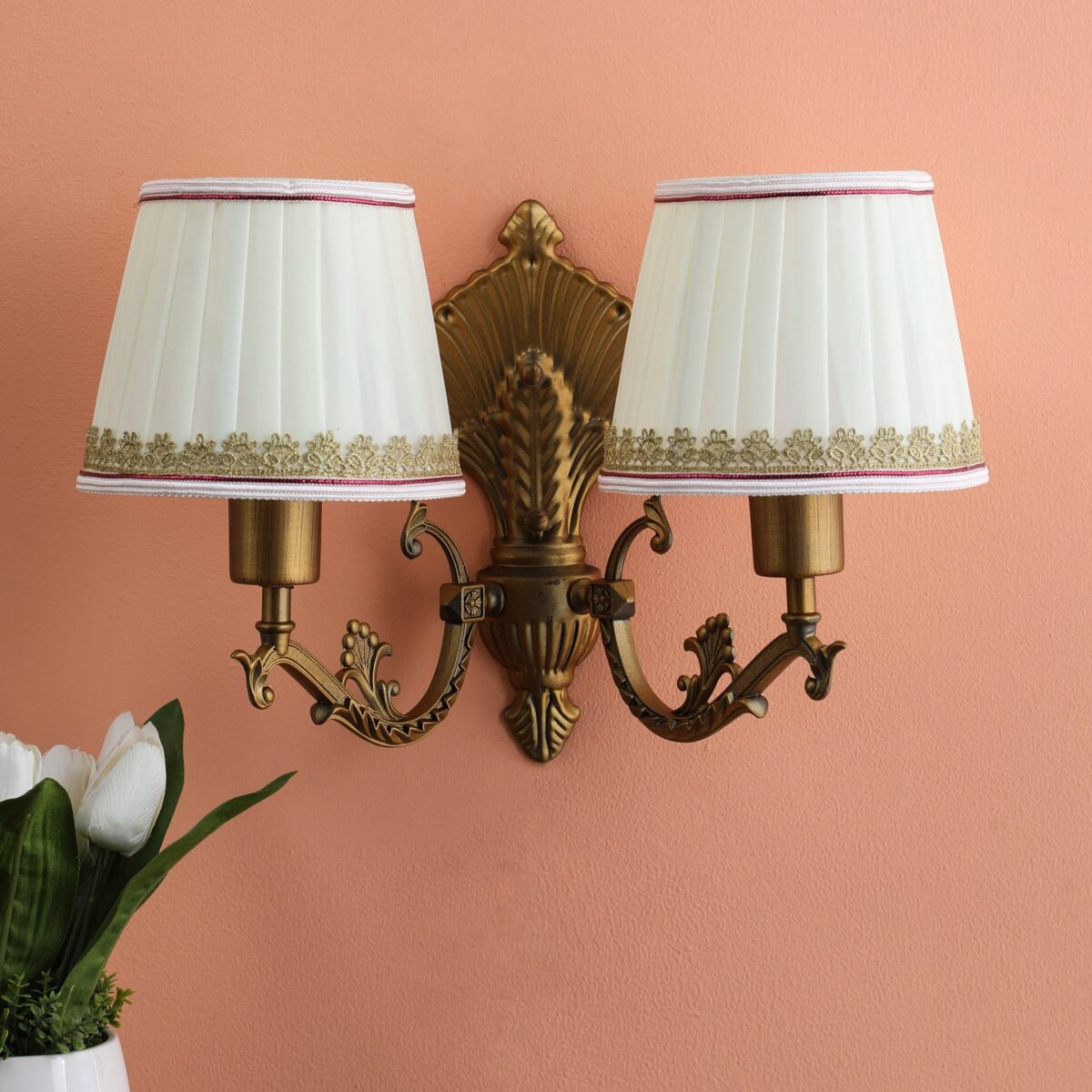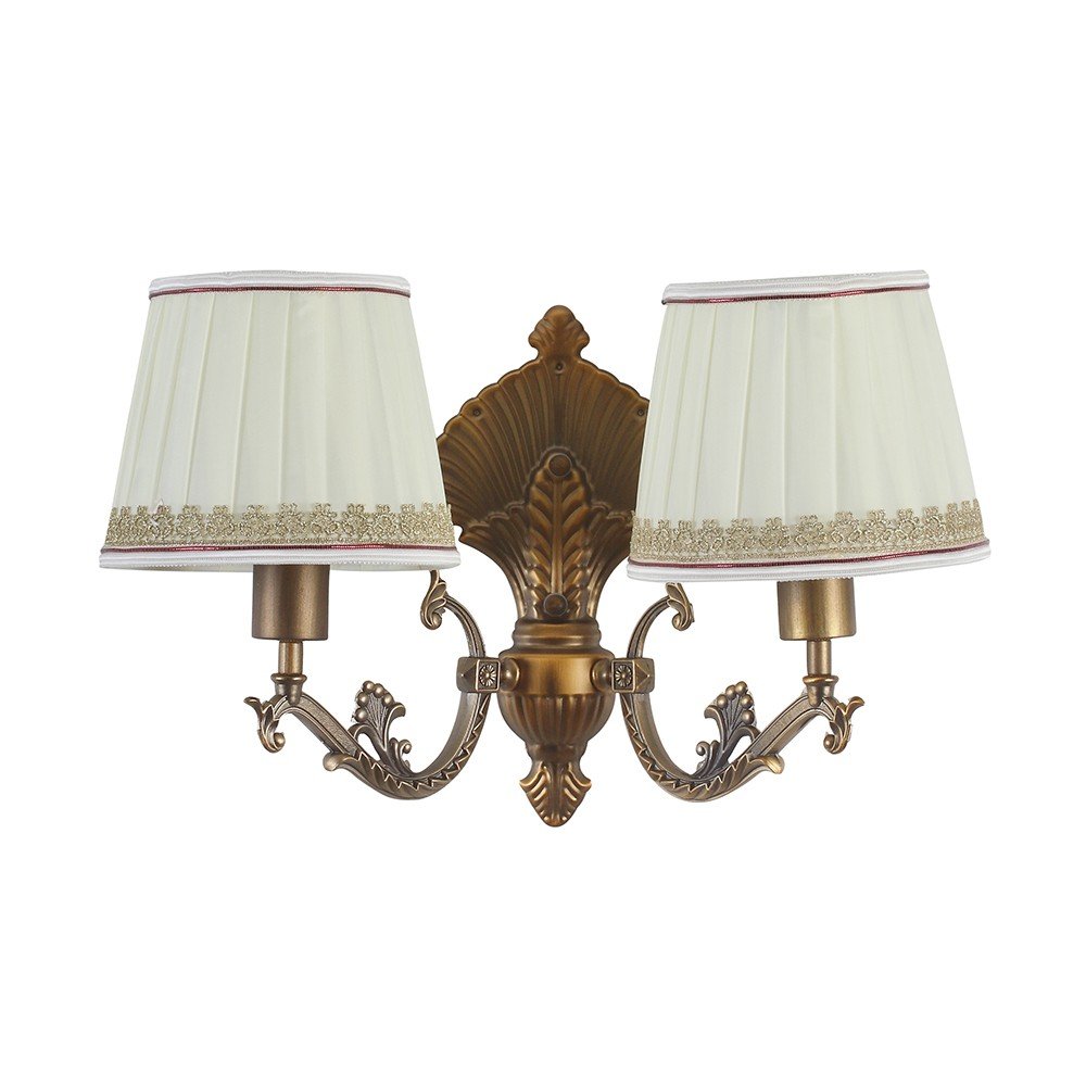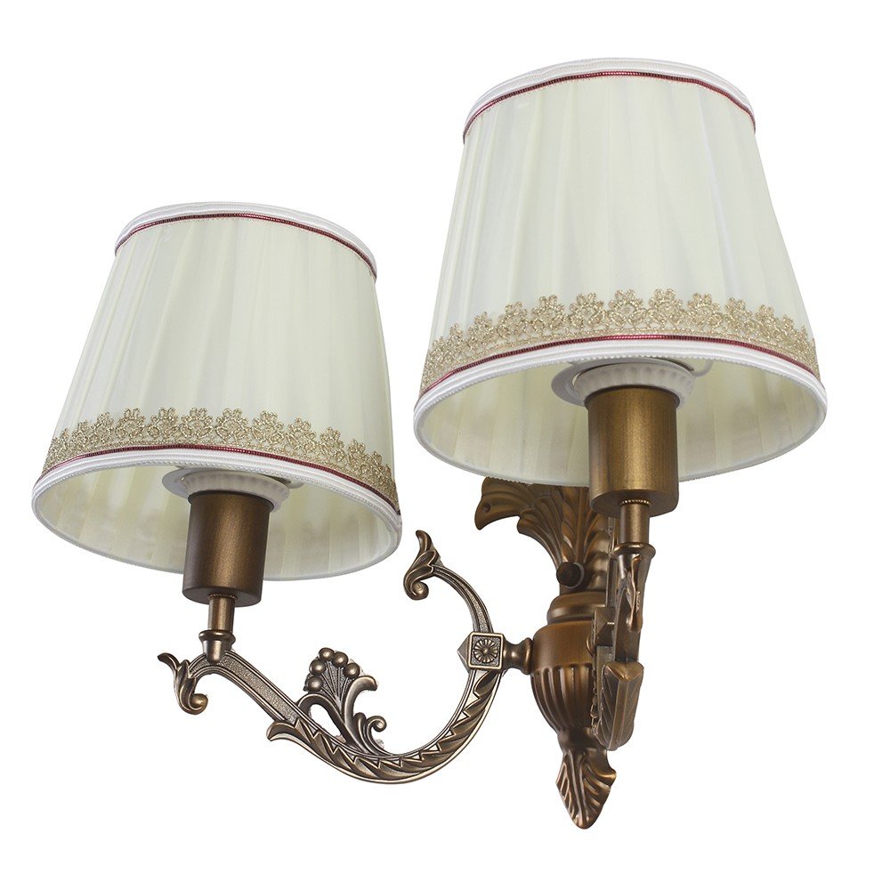 Antique brass, finish double wall light with taper fabric shade off white made of mild steel. It is maintenance free. Comes with an E27 holder, only the change of lamp is required, which is available locally everywhere. Application includes both residential and commercial premises wherever it matches with your interiors. Matching single wall light code – WL2259. Matching chandelier code – CH405. Can be customized as per requirement in case of bulk quantities. Lamp not included.