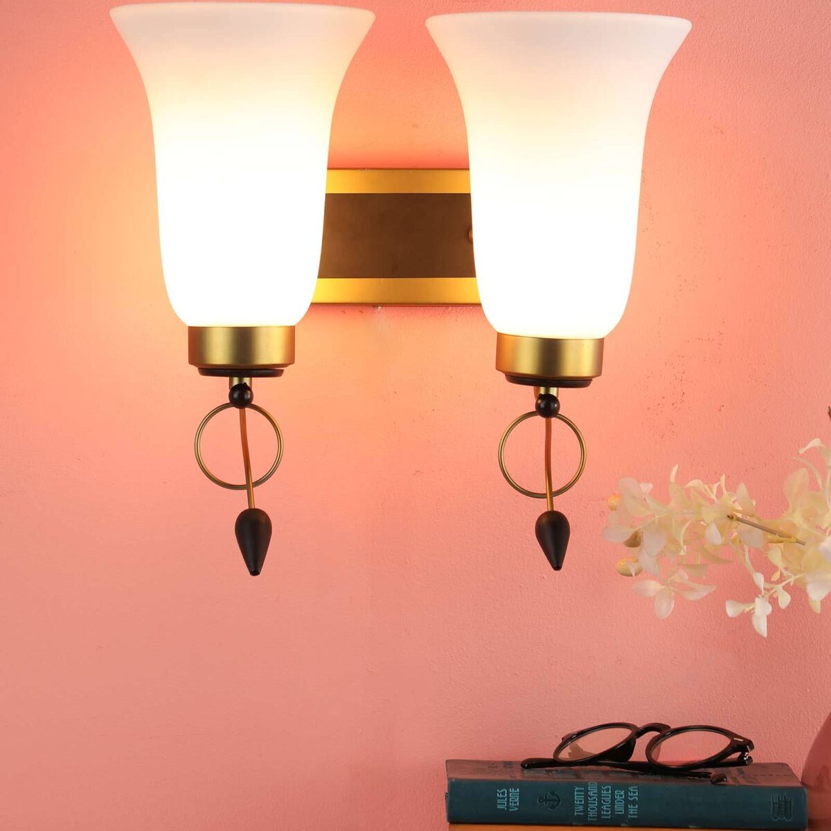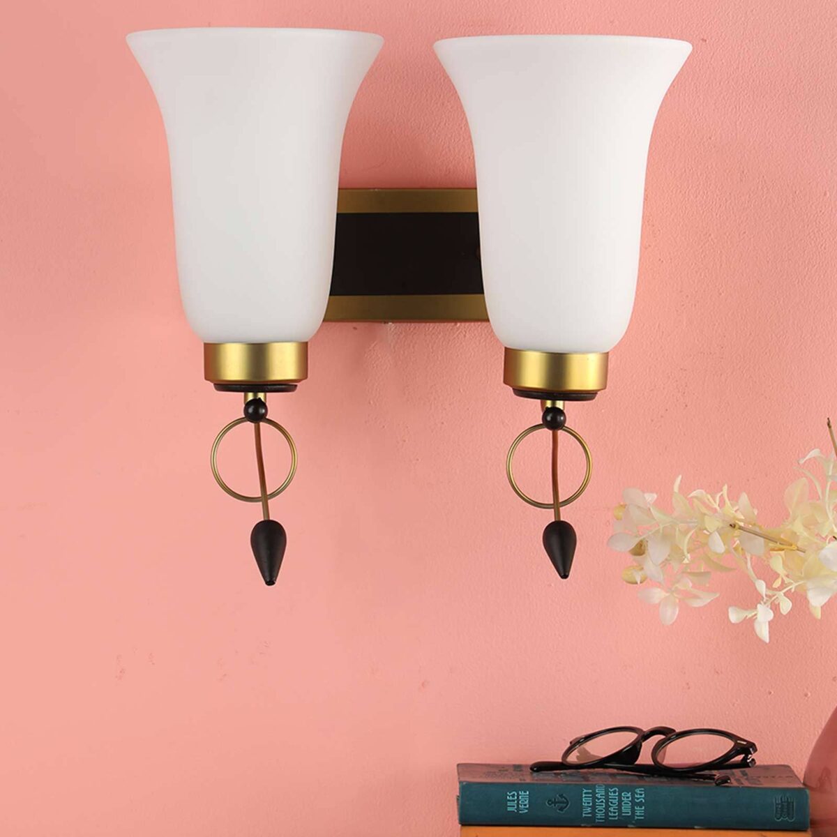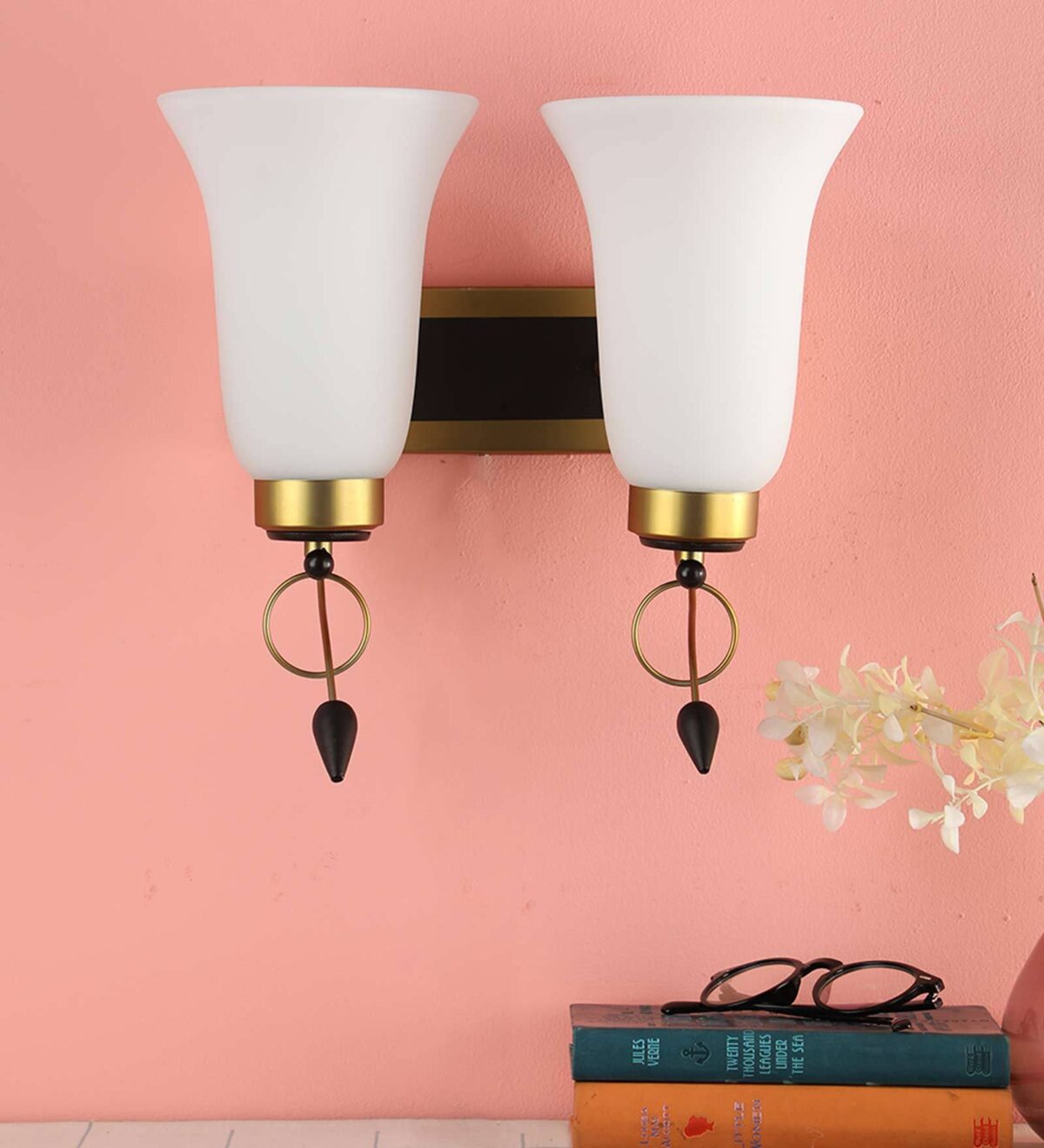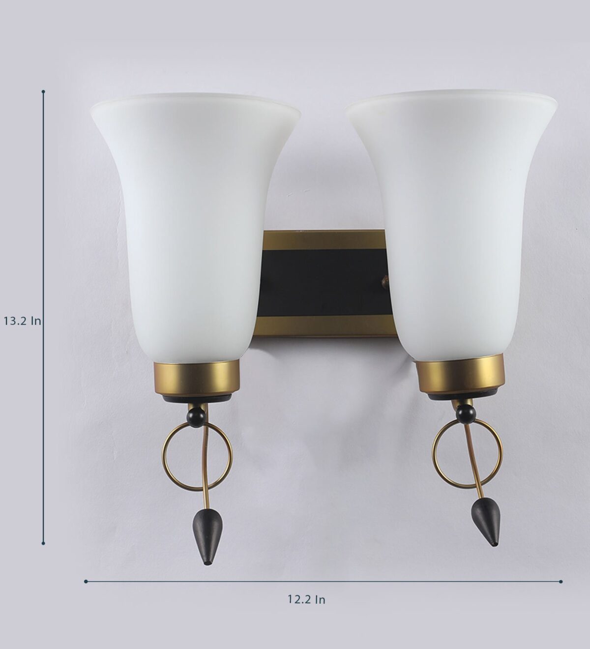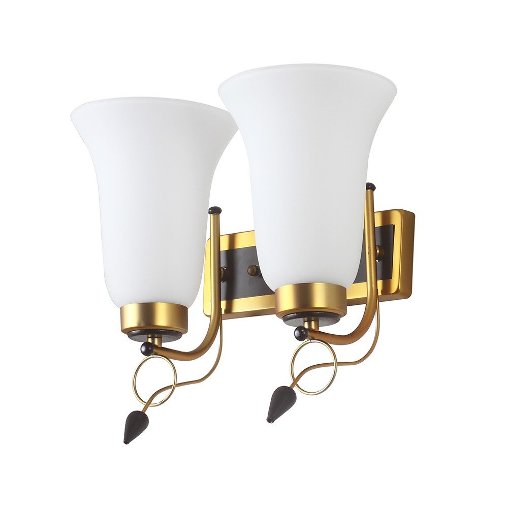 Antique brass dark brown (wood) finish double wall light having bell shaped white glass made of mild steel and wood. It is maintenance free., It is easy to remove glass and wash them. Comes with an E27 holder, only the change of lamp is required, which is available locally everywhere. Application includes both residential and commercial premises wherever it matches with your interiors. Matching single wall light code – WL2265. Matching chandelier code – CH414. Can be customized as per requirement in case of bulk quantities. Lamp not included.