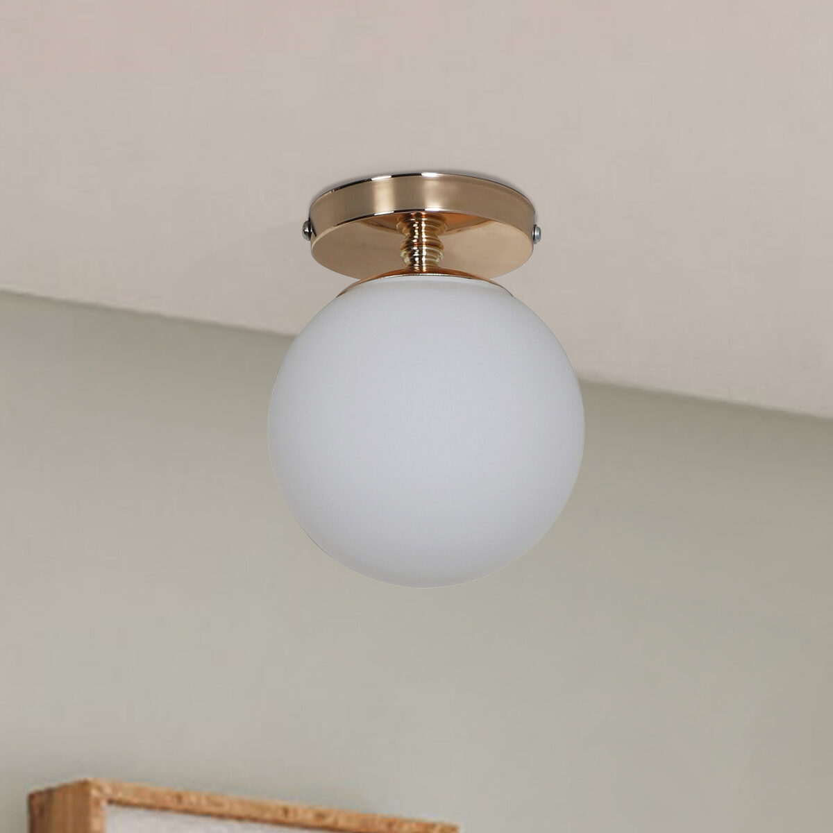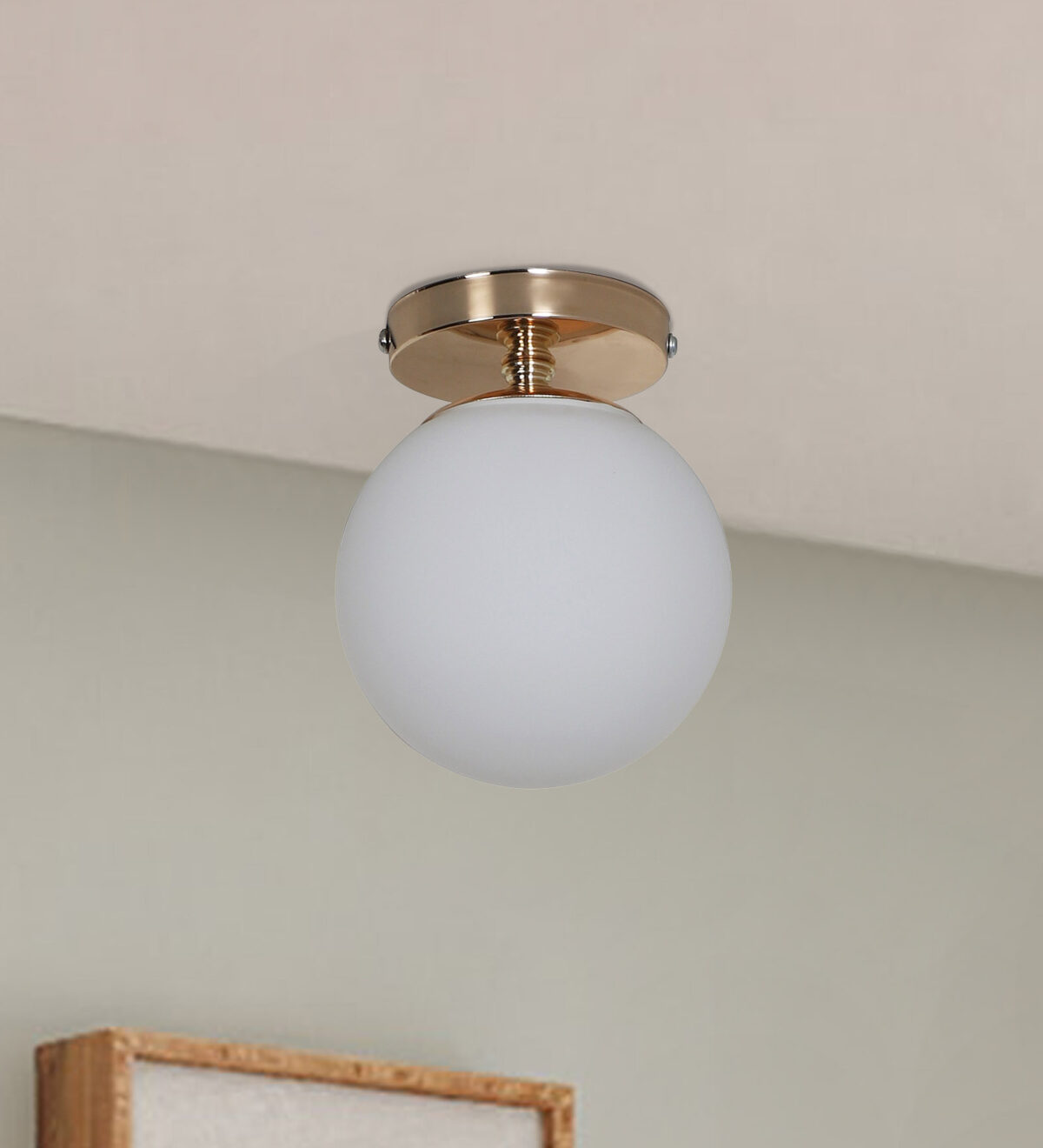 Gold finish indoor ceiling light with 6 inch doom glass. It is maintenance free, it is easy to remove glass and wash it. Comes with an E27 holder. Can be customized as per requirement.LAMP NOT INCLUDED.
