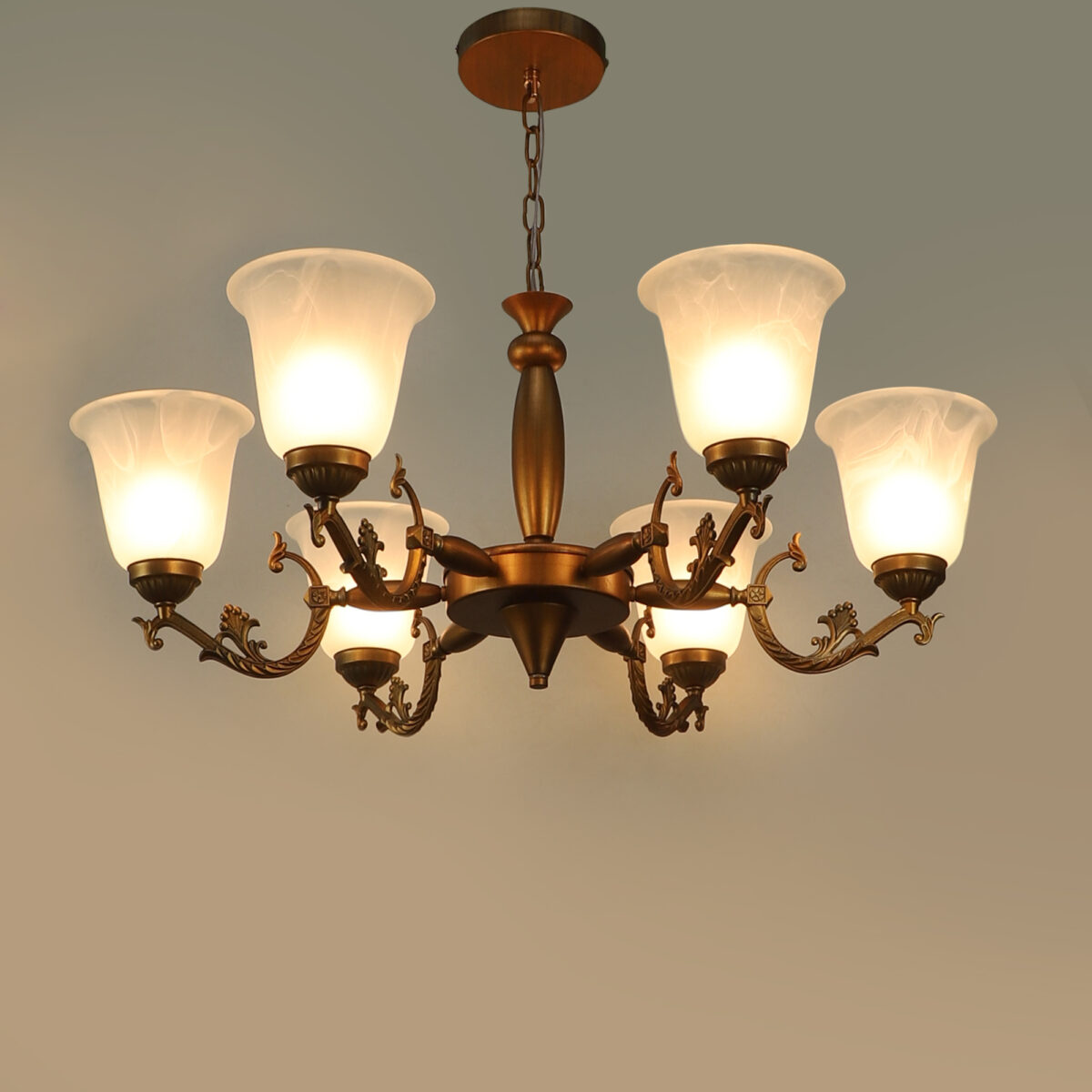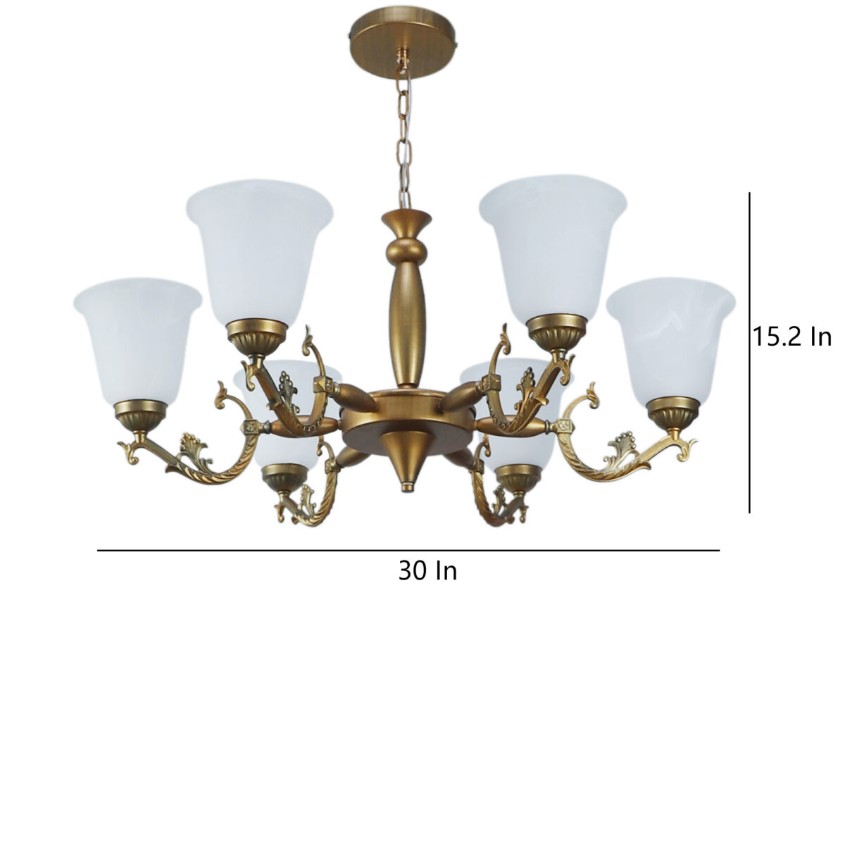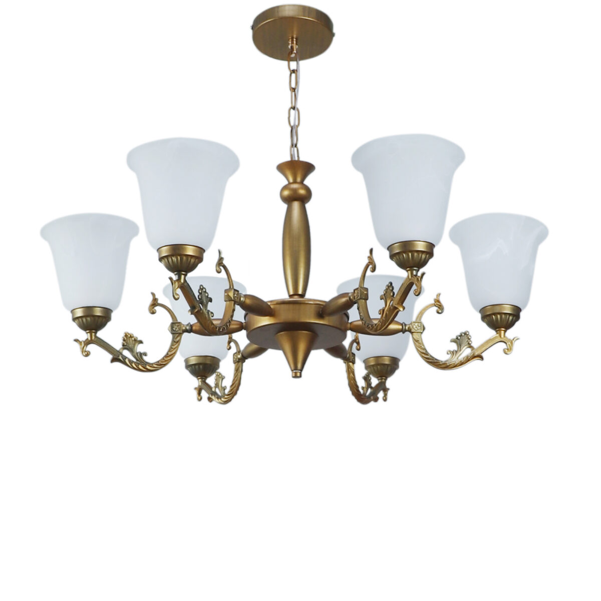 Antique brass finish, bell shaped, white glass having a self textured design mounted on a designer frame made of mild steel having six lights. This is a hanging type chandelier in which the base plate is fixed to the ceiling with the help of straight clamp and screws. The suspension can be adjusted at time of installation to the desired height. It is maintenance free. It is easy to remove glass and wash them. Comes with an E27 holder, only the change of lamp is required, which is available locally everywhere. Application includes both residential and commercial premises wherever it matches with your interiors. Matching wall light code – WL2203, WL2204. Can be customized as per requirement in case of bulk quantities. This along with its variants are the best selling products in our catalogue. LAMP NOT INCLUDED.