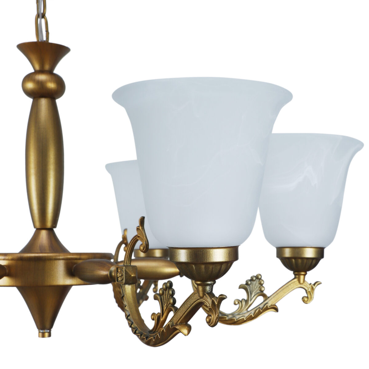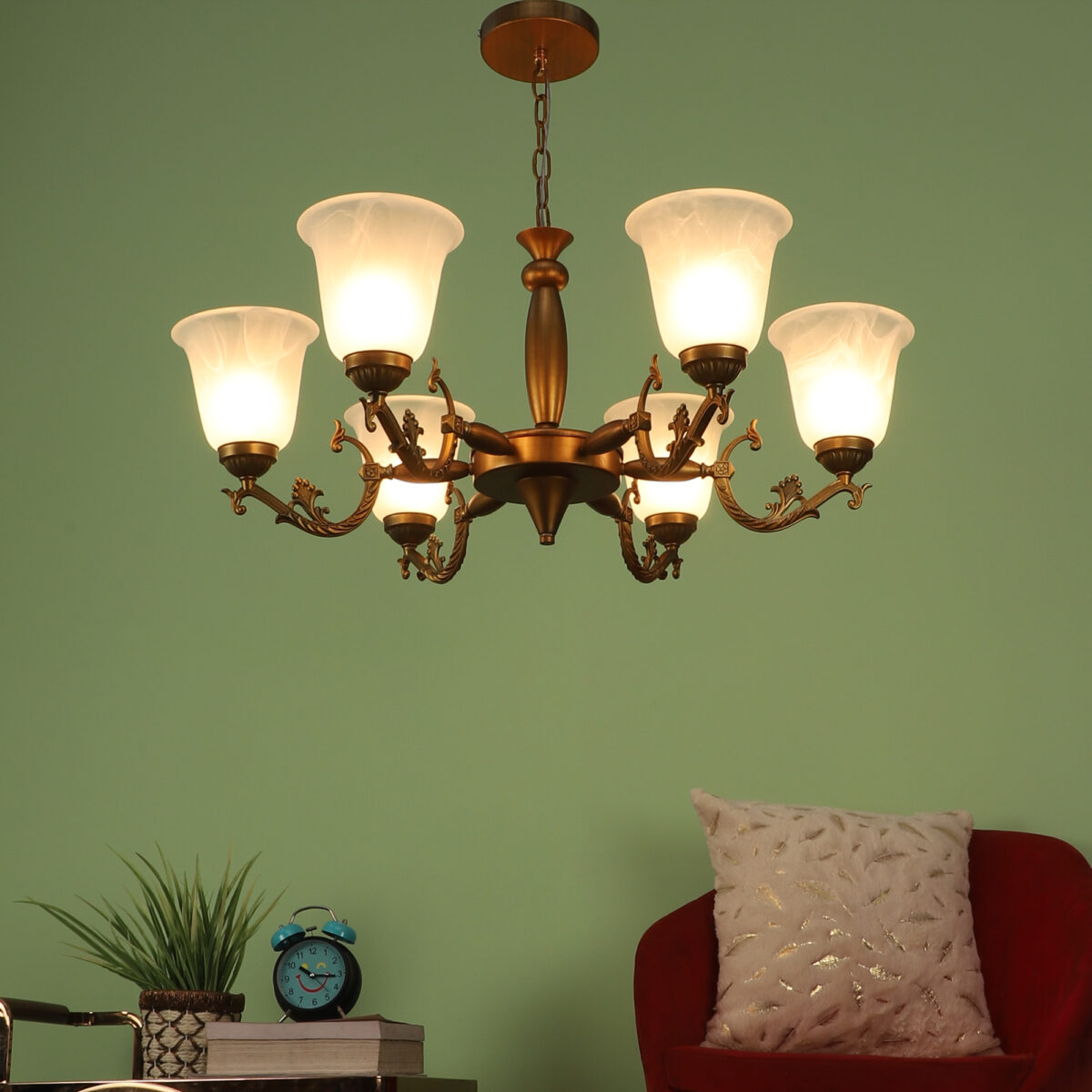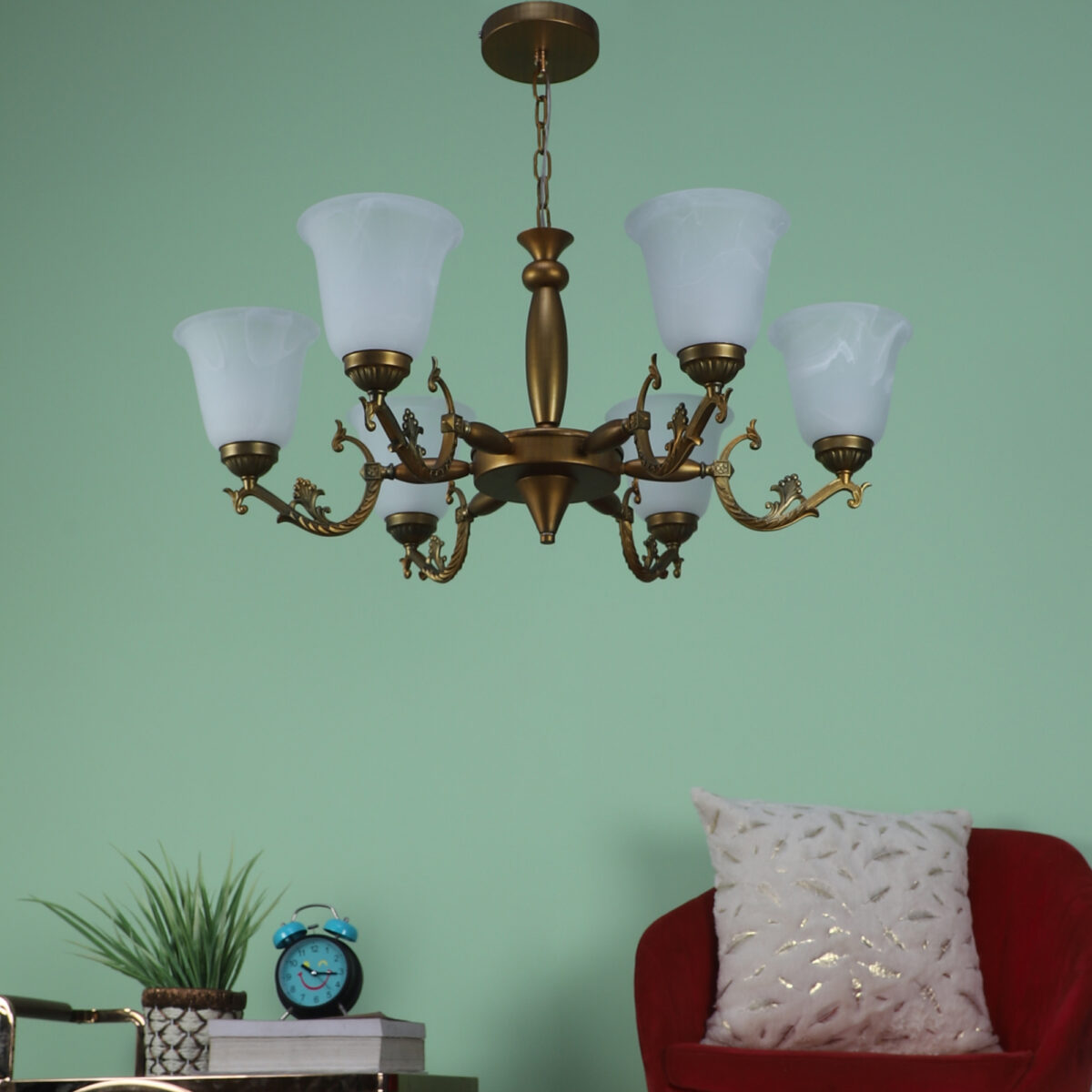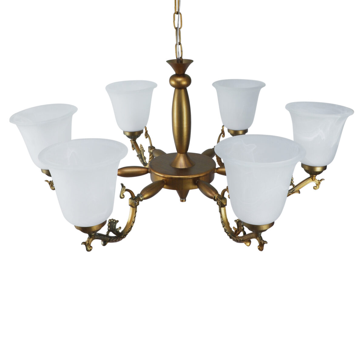 Antique brass finish, bell shaped, white glass having a self textured design mounted on a designer frame made of mild steel having six lights. This is a hanging type chandelier in which the base plate is fixed to the ceiling with the help of straight clamp and screws. The suspension can be adjusted at time of installation to the desired height. It is maintenance free. It is easy to remove glass and wash them. Comes with an E27 holder, only the change of lamp is required, which is available locally everywhere. Application includes both residential and commercial premises wherever it matches with your interiors. Matching wall light code – WL2203, WL2204. Can be customized as per requirement in case of bulk quantities. This along with its variants are the best selling products in our catalogue. LAMP NOT INCLUDED.