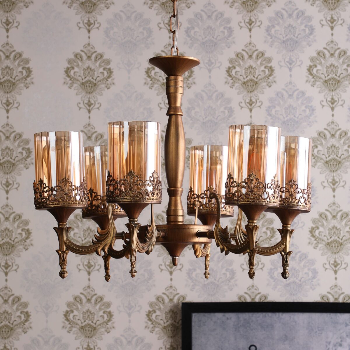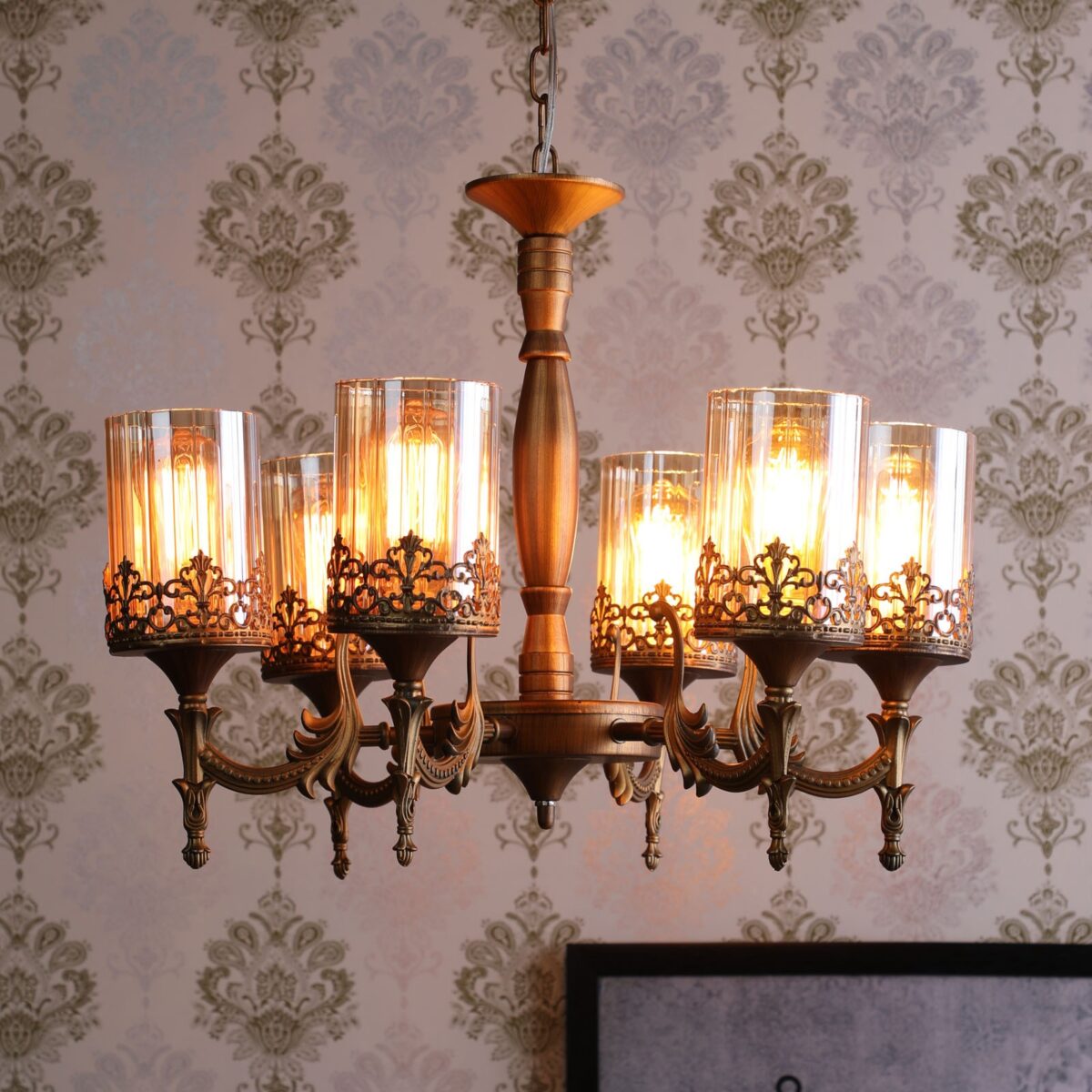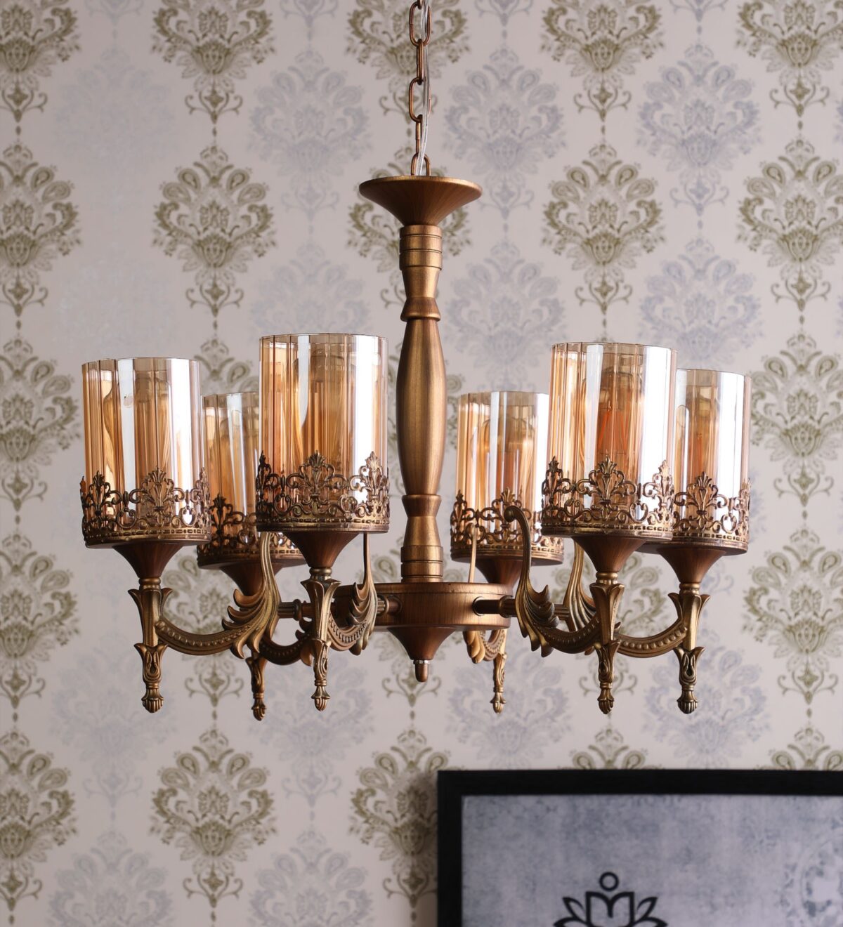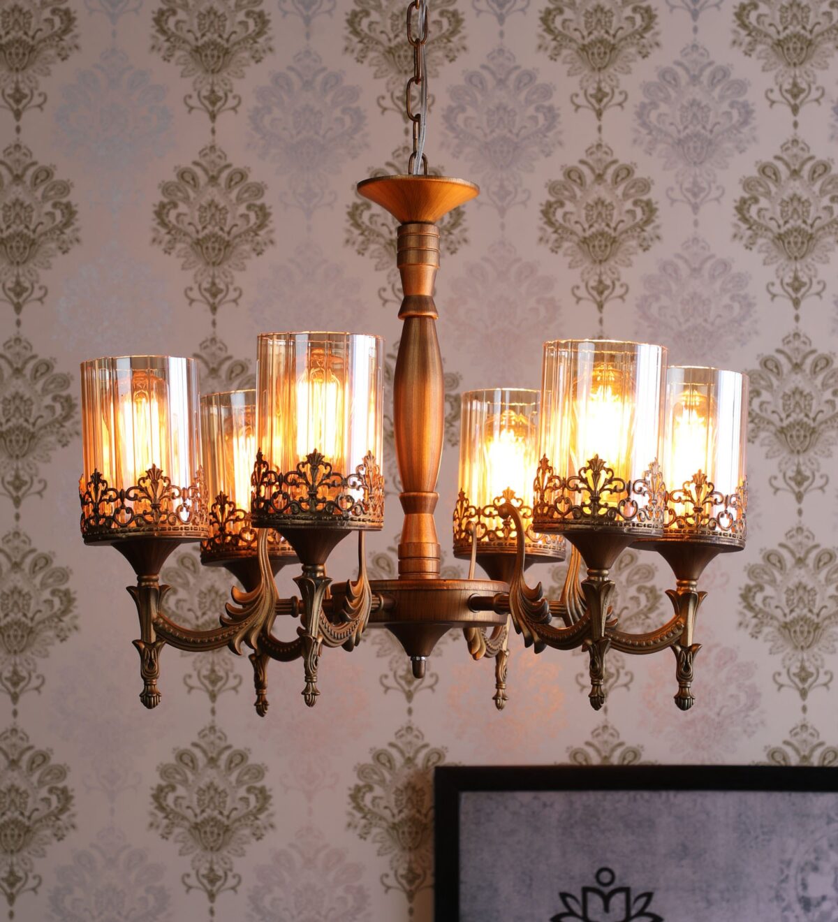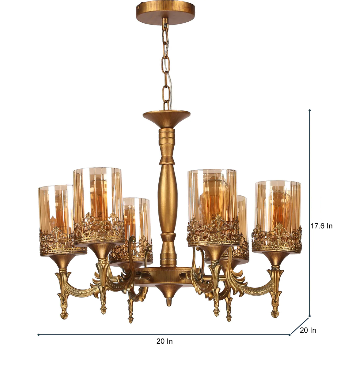 Antique brass finish, round cylindrical champagne coloured glass mounted on a designer frame made of mild steel having six lights. This is a hanging type chandelier in which the base plate is fixed to the ceiling with the help of straight clamp and screws. The suspension can be adjusted at time of installation to the desired height. It is maintenance free. It is easy to remove glass and wash them. Comes with an E27 holder, only the change of lamp is required, which is available locally everywhere. Application includes both residential and commercial premises wherever it matches with your interiors. Matching wall light code – WL2389, WL2390. Can be customized as per requirement in case of bulk quantities. LAMP NOT INCLUDED.