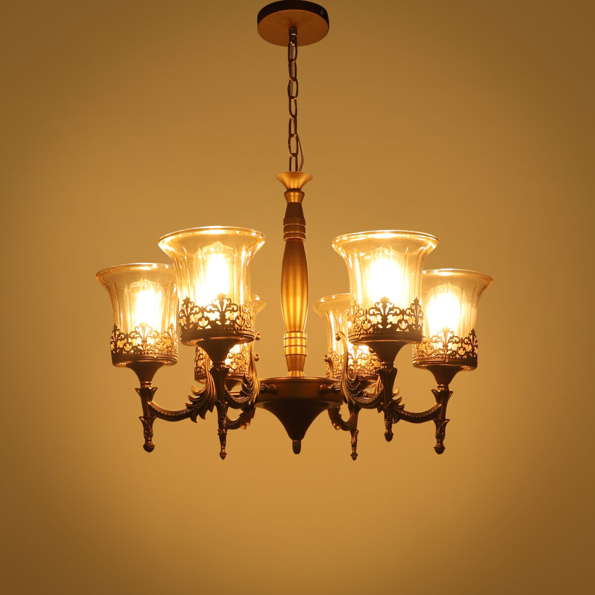 Antique brass, bell shaped champagne coloured glass mounted on a designer frame made of mild steel having six lights. This is a hanging type chandelier in which the base plate is fixed to the ceiling with the help of straight clamp and screws. The suspension can be adjusted at time of installation to the desired height. It is maintenance free. It is easy to remove glass and wash them. Comes with an E27 holder, only the change of lamp is required, which is available locally everywhere. Application includes both residential and commercial premises wherever it matches with your interiors. Matching hanging light ocde – HL5061-1, HL5061-3. Matching wall light code – WL2363, WL2364. Can be customized as per requirement in case of bulk quantities. LAMP NOT INCLUDED.