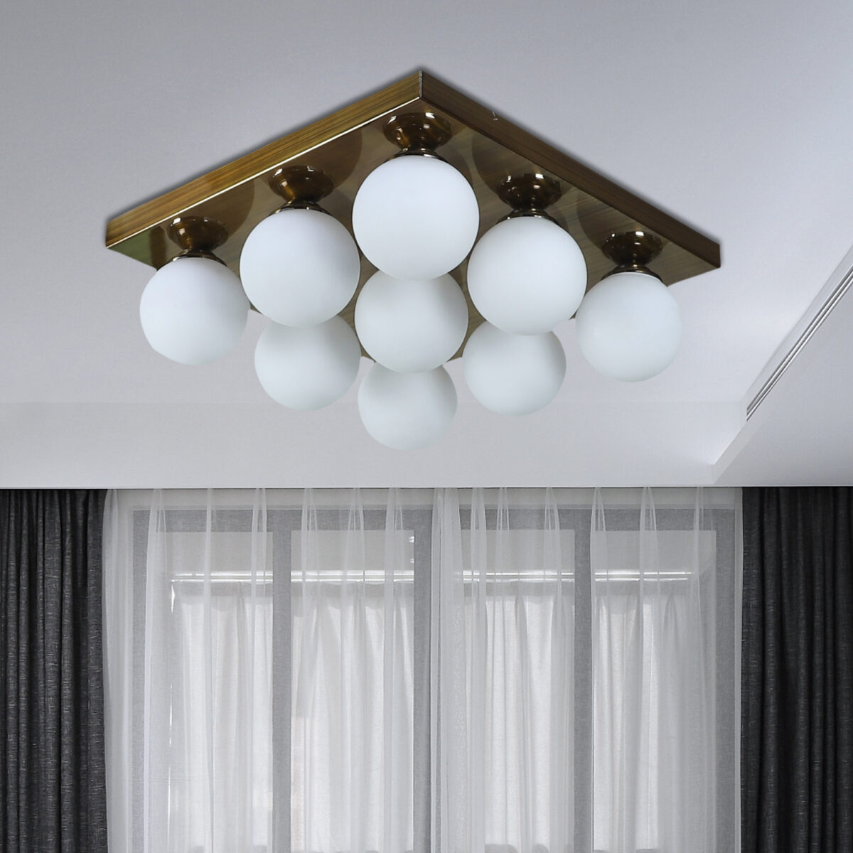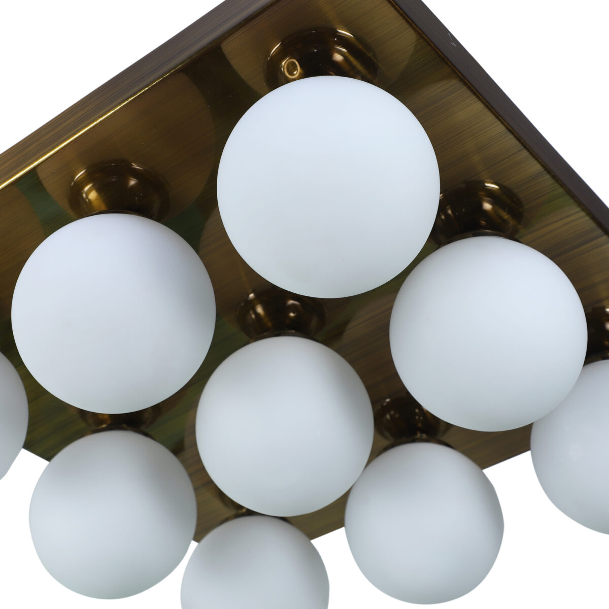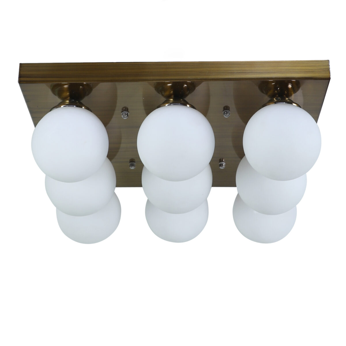 Antique gold finish, round globe (doom) glass mounted on a square plate made of mild steel having nine lights. This is a fixed type chandelier in which the base plate is fixed to the ceiling with the help of straight clamp and screws.It is maintenance free, glasses are closed from all the sides which prevents accumulation of dust and it is easy to remove glass and wash them. Comes with an E27 holder, only the change of lamp is required, which is available locally everywhere. Application includes both residential and commercial premises wherever it matches with your interiors. Matching chandelier variations – CH400-4. Matching hanging variations – HL-4100-4, HL4100-9. Can be customized as per requirement in case of bulk quantities.This along with its variants are the best selling products in our catalogue. LAMP NOT INCLUDED.