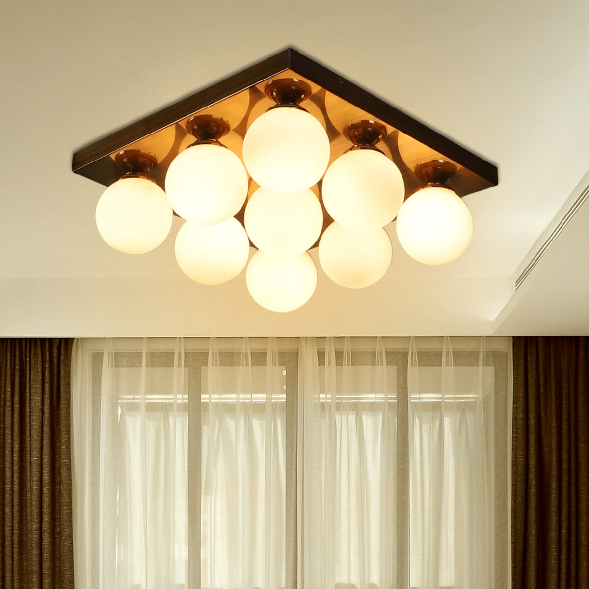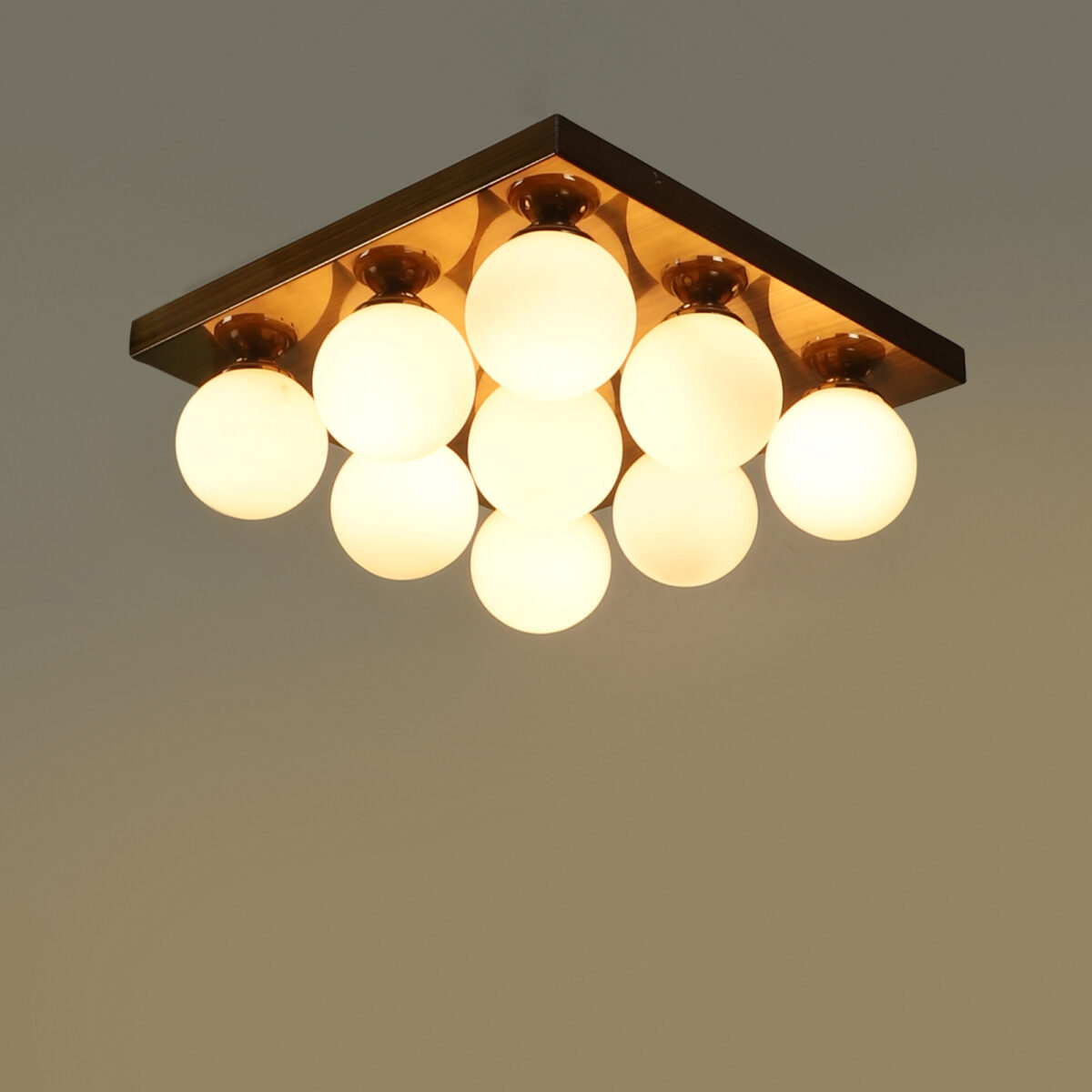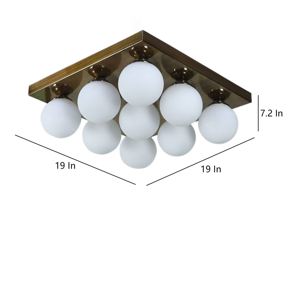 Antique gold finish, round globe (doom) glass mounted on a square plate made of mild steel having nine lights. This is a fixed type chandelier in which the base plate is fixed to the ceiling with the help of straight clamp and screws.It is maintenance free, glasses are closed from all the sides which prevents accumulation of dust and it is easy to remove glass and wash them. Comes with an E27 holder, only the change of lamp is required, which is available locally everywhere. Application includes both residential and commercial premises wherever it matches with your interiors. Matching chandelier variations – CH400-4. Matching hanging variations – HL-4100-4, HL4100-9. Can be customized as per requirement in case of bulk quantities.This along with its variants are the best selling products in our catalogue. LAMP NOT INCLUDED.