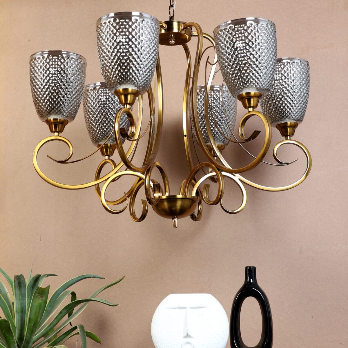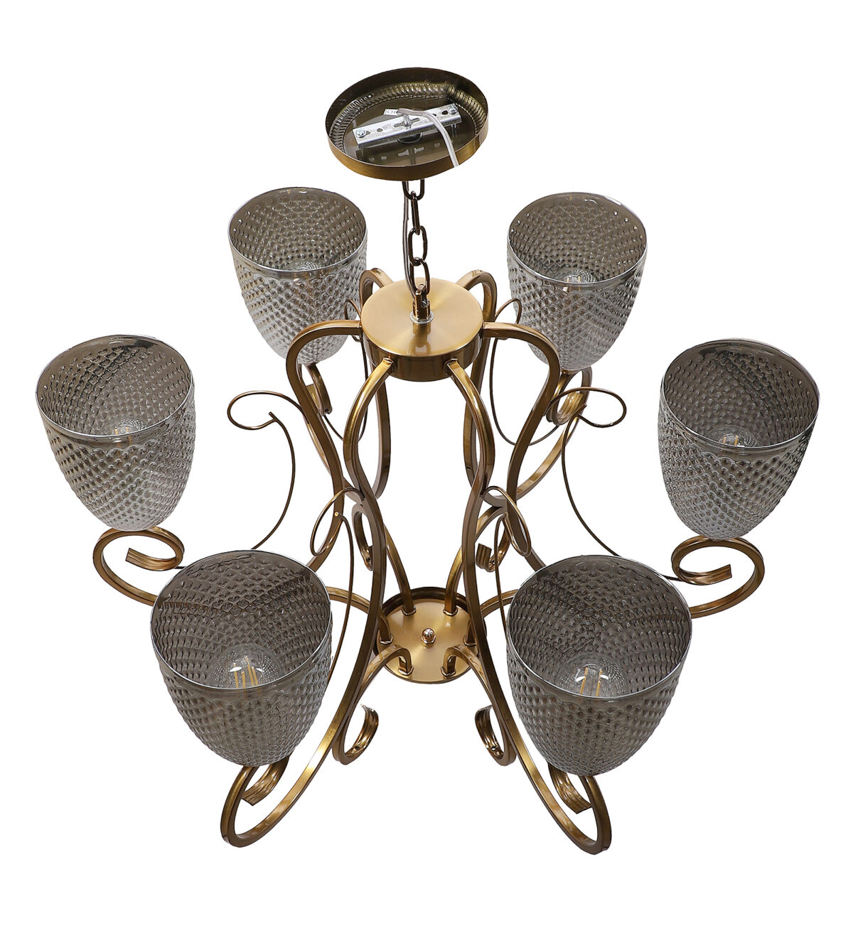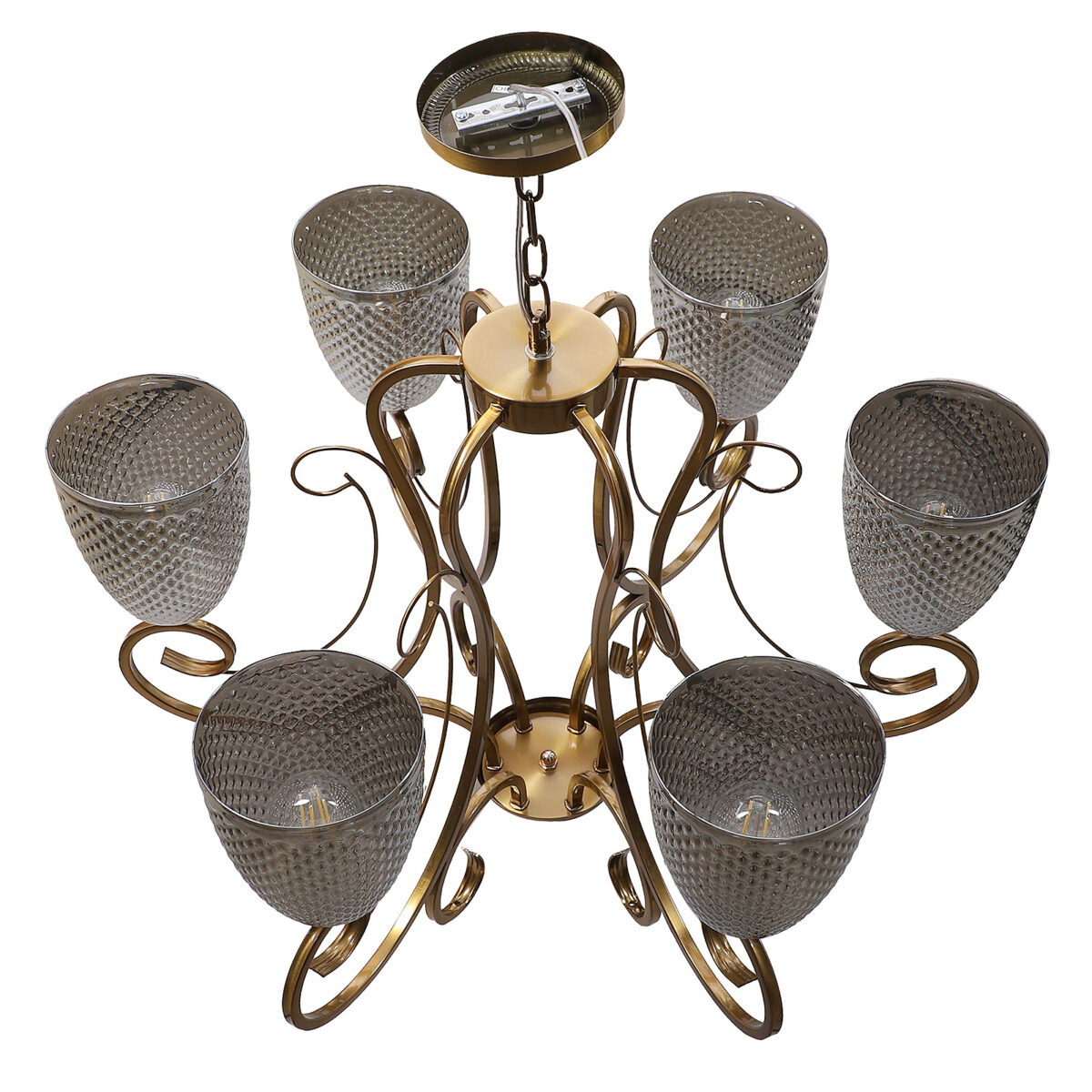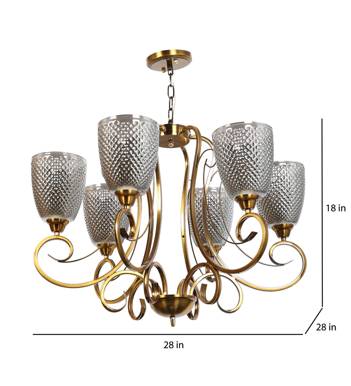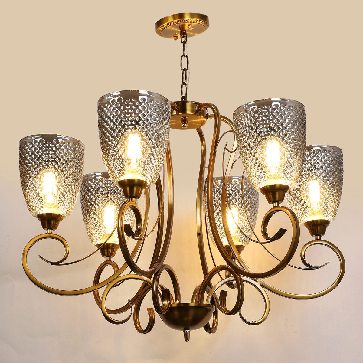 Antique finish chandellier having six lights.The suspension can be adjusted at time of installation to the desired height. It is maintenance free, it is easy to remove glasses and wash them. Comes with an E27 holder.Can be customized as per requirement. Other sizes can be made as per requirement. LAMP NOT INCLUDED.