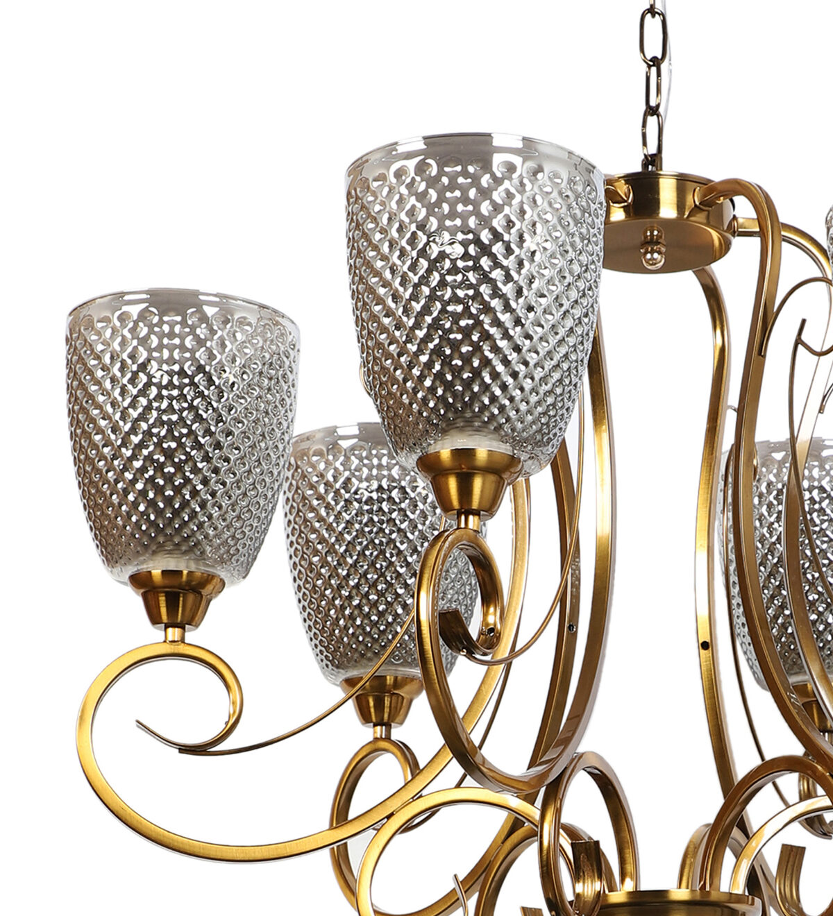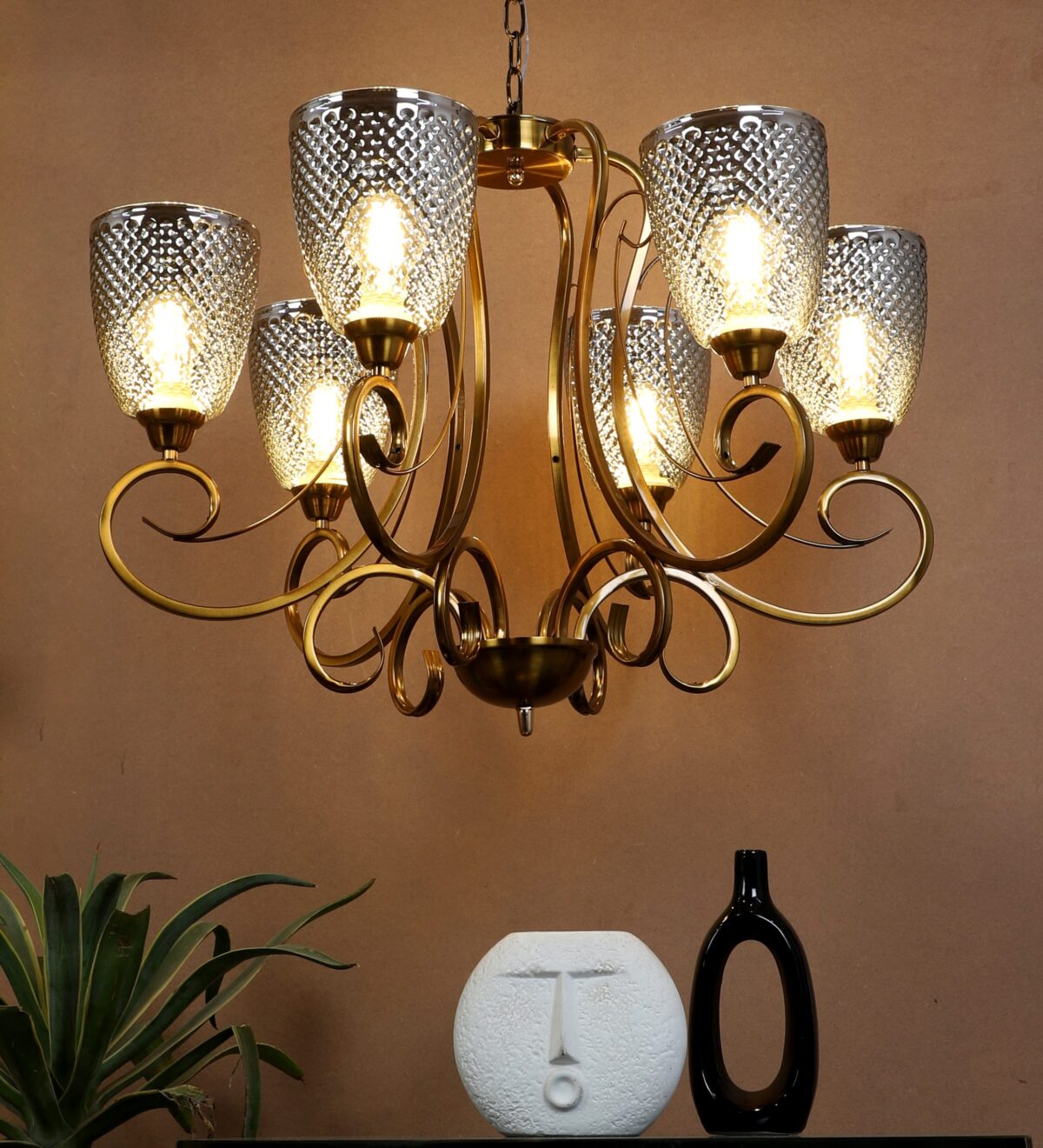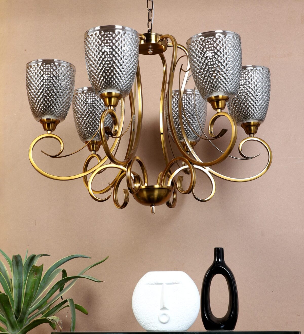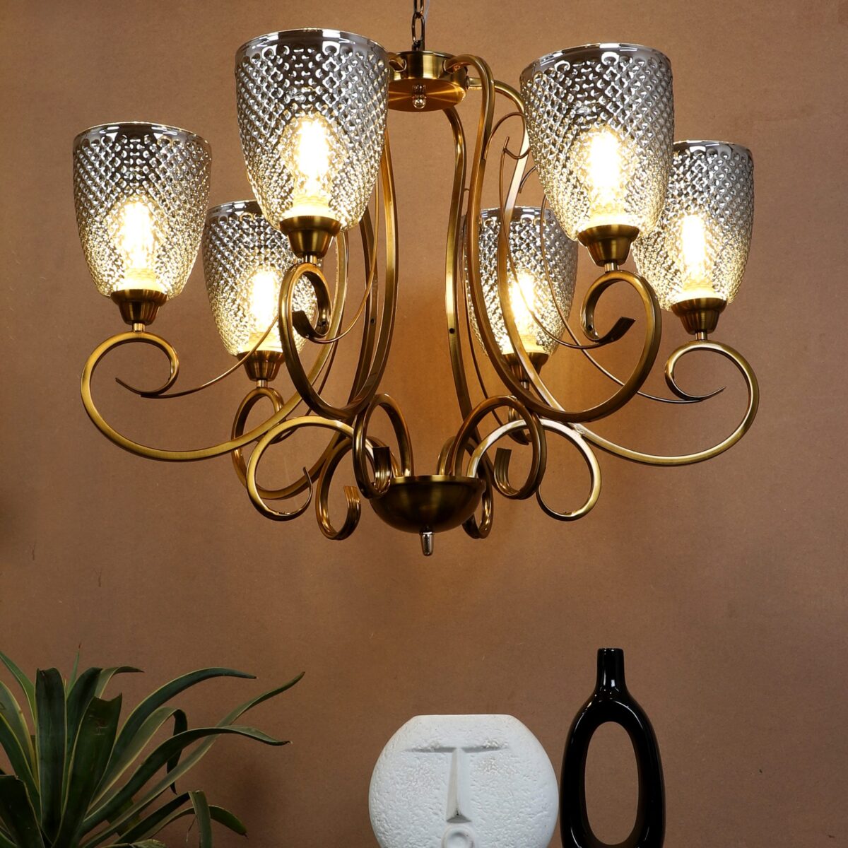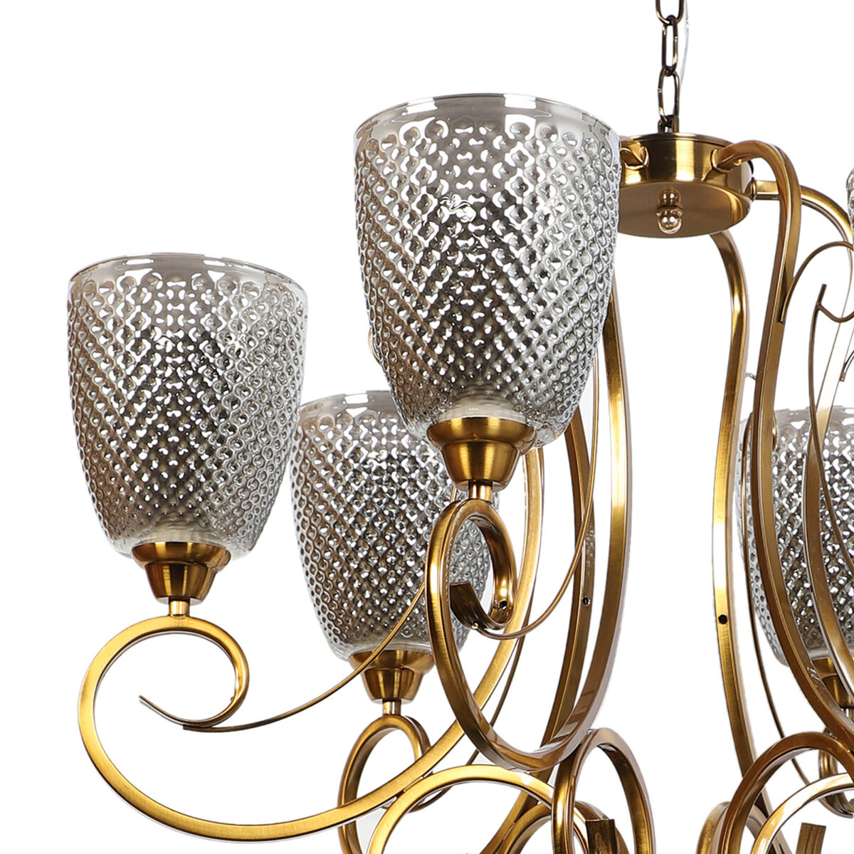 Antique finish chandellier having six lights.The suspension can be adjusted at time of installation to the desired height. It is maintenance free, it is easy to remove glasses and wash them. Comes with an E27 holder.Can be customized as per requirement. Other sizes can be made as per requirement. LAMP NOT INCLUDED.