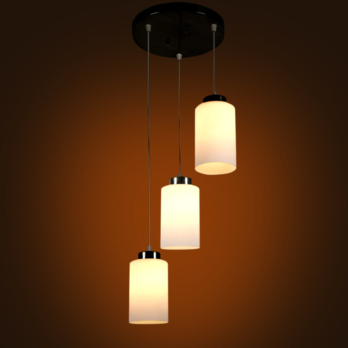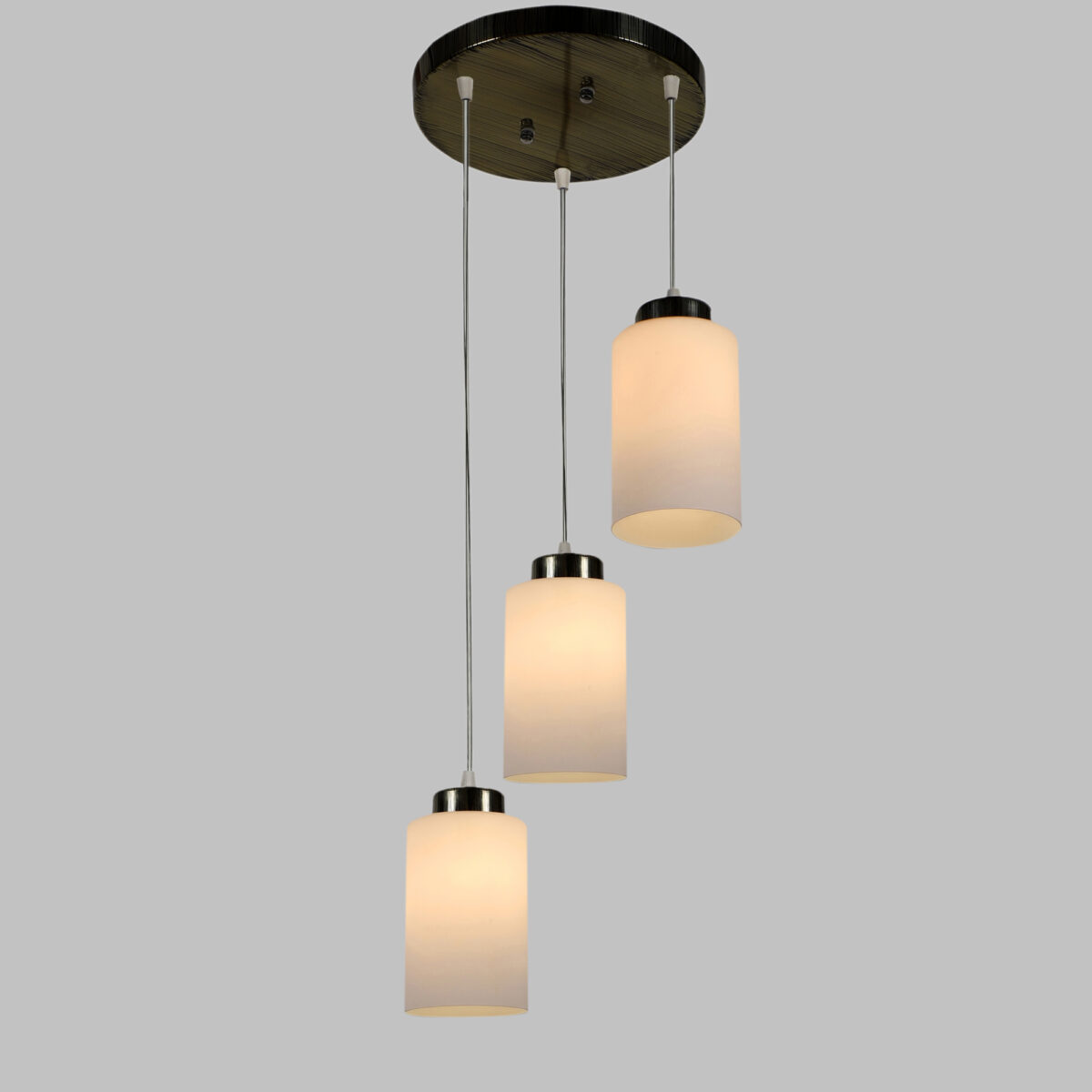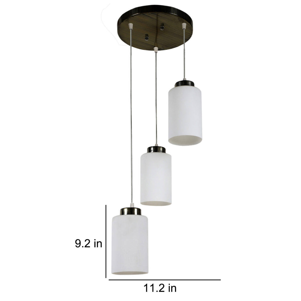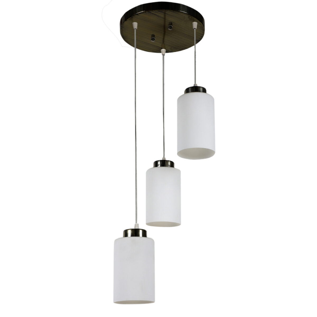 Antique gold finish, modern cylindrical glass cluster hanging light having three lamps made of mild steel and glass. It is one of the regular design which is never out of trend. The suspension can be adjusted at time of installation to the desired height. It is maintenance free, easy to remove glass and wash them, comes with an E27 holder, only the change of lamp is required, which is available locally everywhere. Application includes both residential and commercial premises wherever it matches with your interiors. Matching single light code – HL3863-1, Matching silver (satin nickel) code- HL3857-3, HL3857-1, Matching silver (chrome) finish code HL3860-3, HL3860-1, Matching dark brown (wood) finish code – HL3859-3, HL3859-1. Lamp not included.