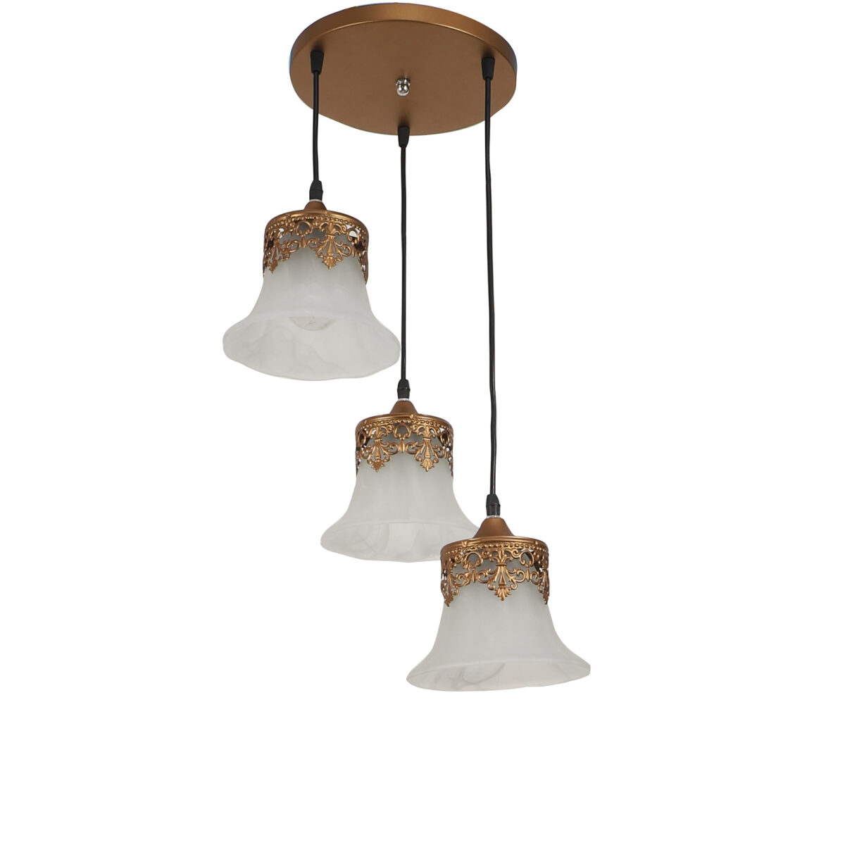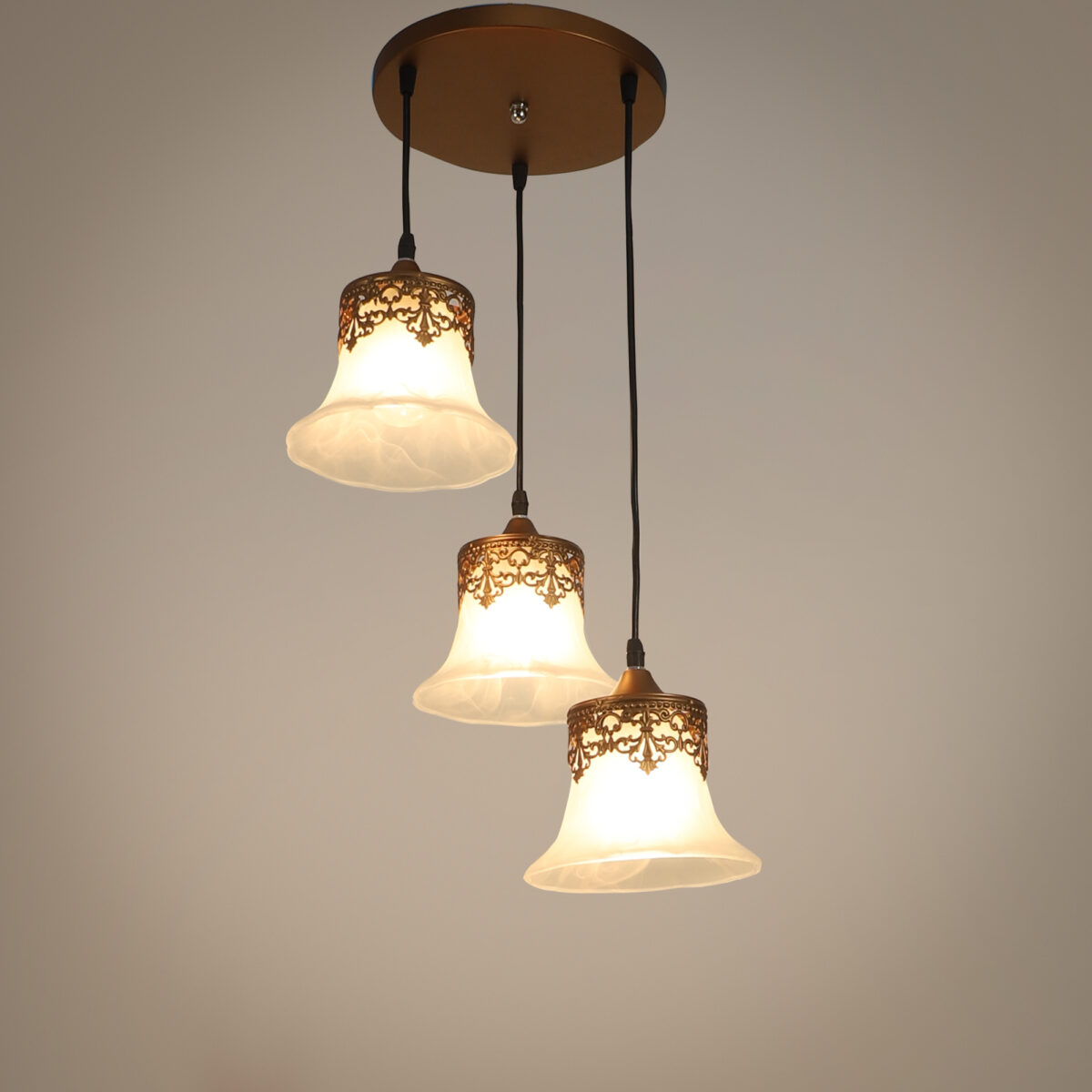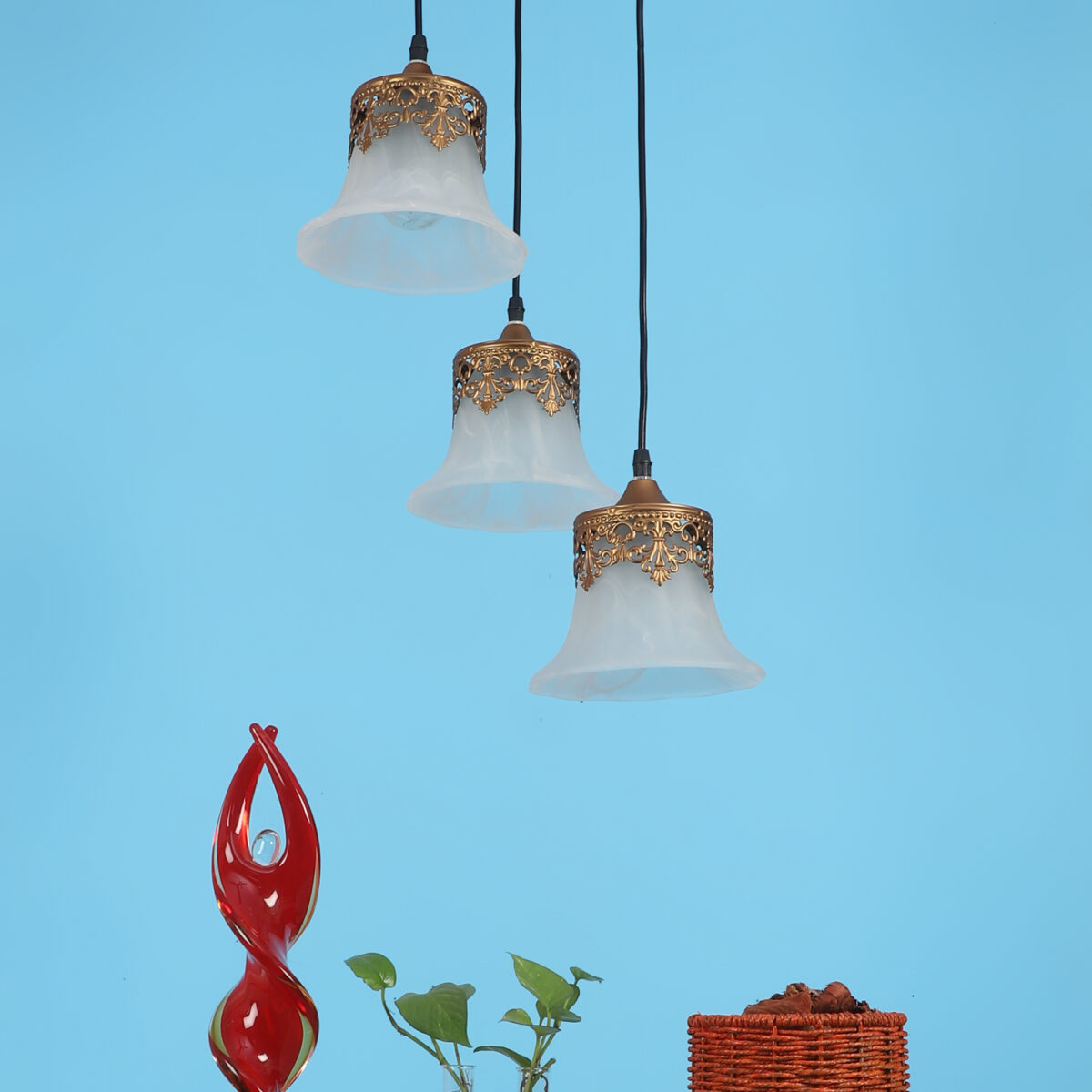Antique gold finish, cluster hanging light having three lamps made of mild steel and glass. The suspension can be adjusted at time of installation to the desired height. It is maintenance free, easy to remove glass and wash them, comes with an E27 holder, only the change of lamp is required, which is available locally everywhere. Application includes both residential and commercial premises wherever it matches with your interiors. Also available in single lamp option with code HL5060-1. Matching wall light code – WL2413, WL2414. Matching chandelier code – CH397. Can be customized as per requirement in case of bulk quantities. Lamp not included.