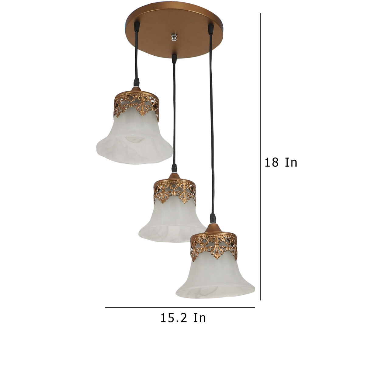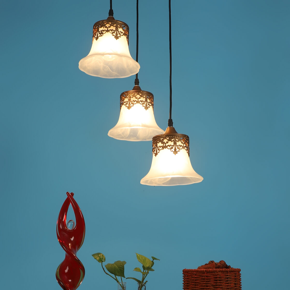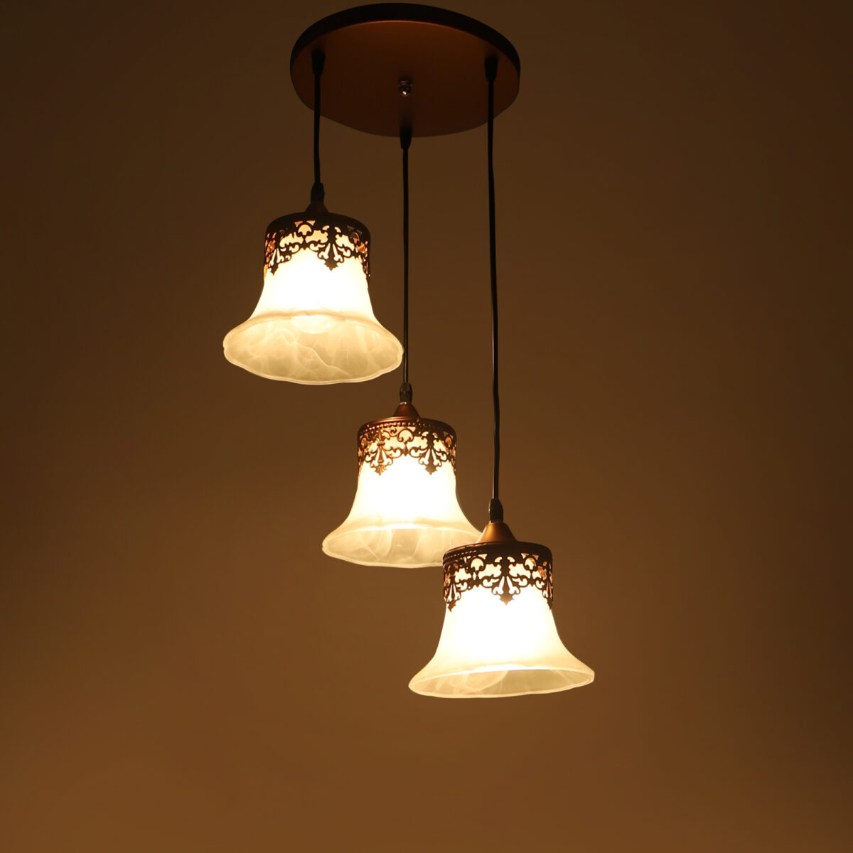 Antique gold finish, cluster hanging light having three lamps made of mild steel and glass. The suspension can be adjusted at time of installation to the desired height. It is maintenance free, easy to remove glass and wash them, comes with an E27 holder, only the change of lamp is required, which is available locally everywhere. Application includes both residential and commercial premises wherever it matches with your interiors. Also available in single lamp option with code HL5060-1. Matching wall light code – WL2413, WL2414. Matching chandelier code – CH397. Can be customized as per requirement in case of bulk quantities. Lamp not included.