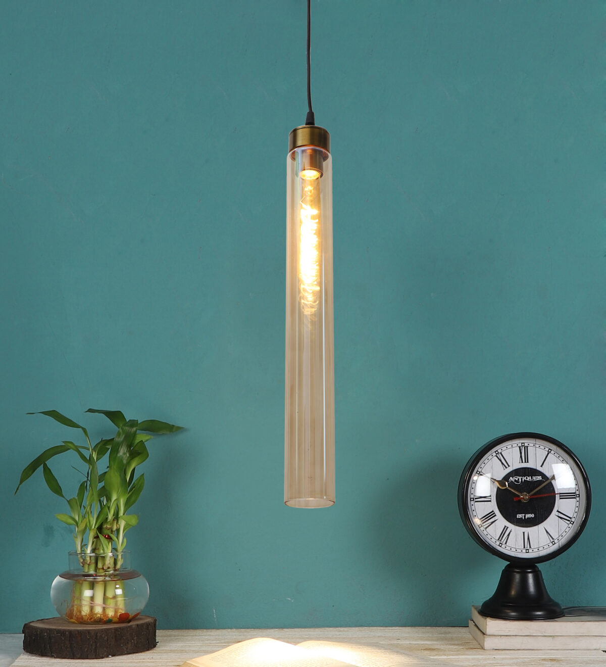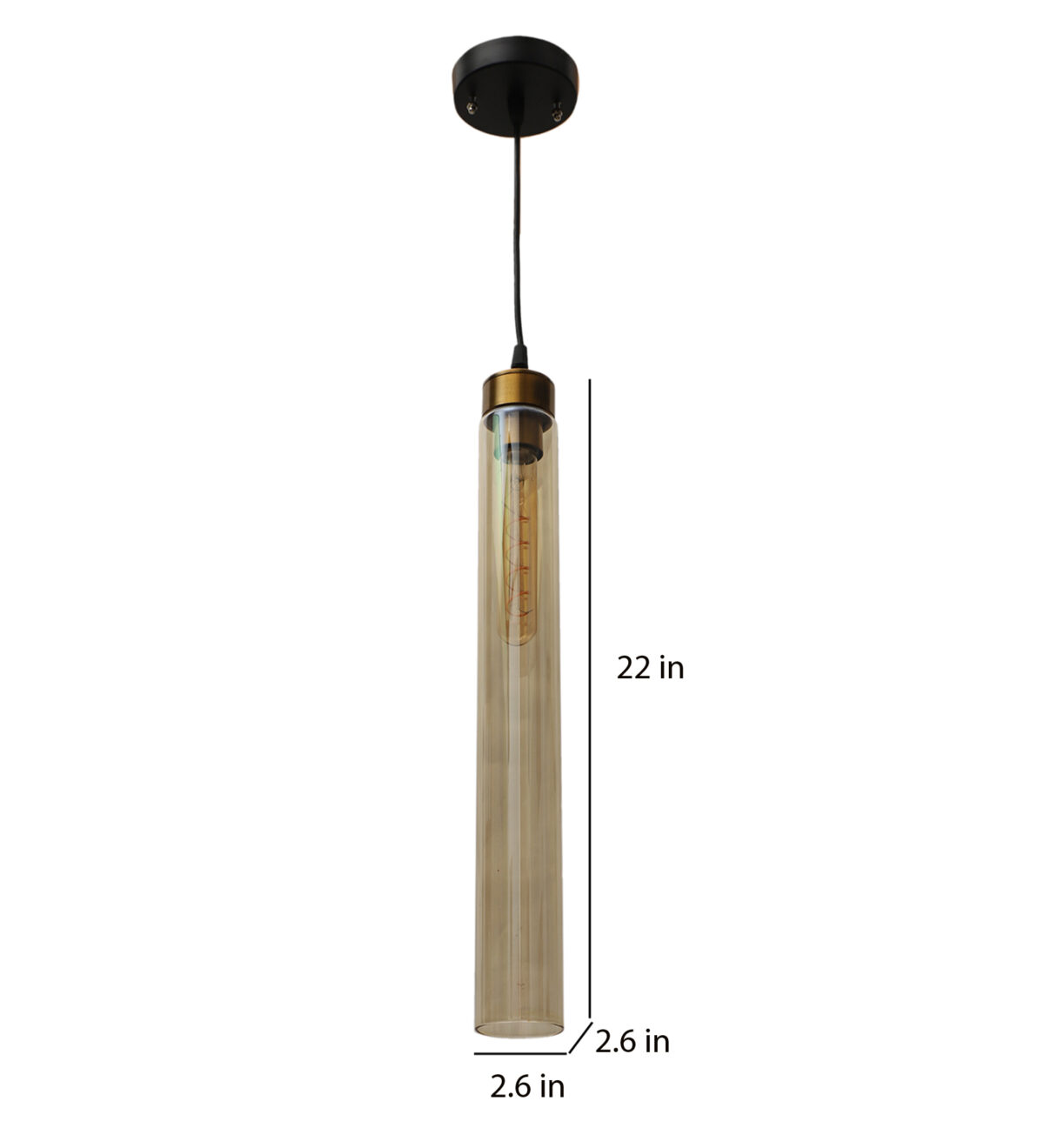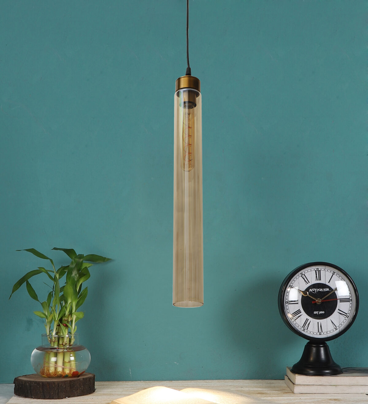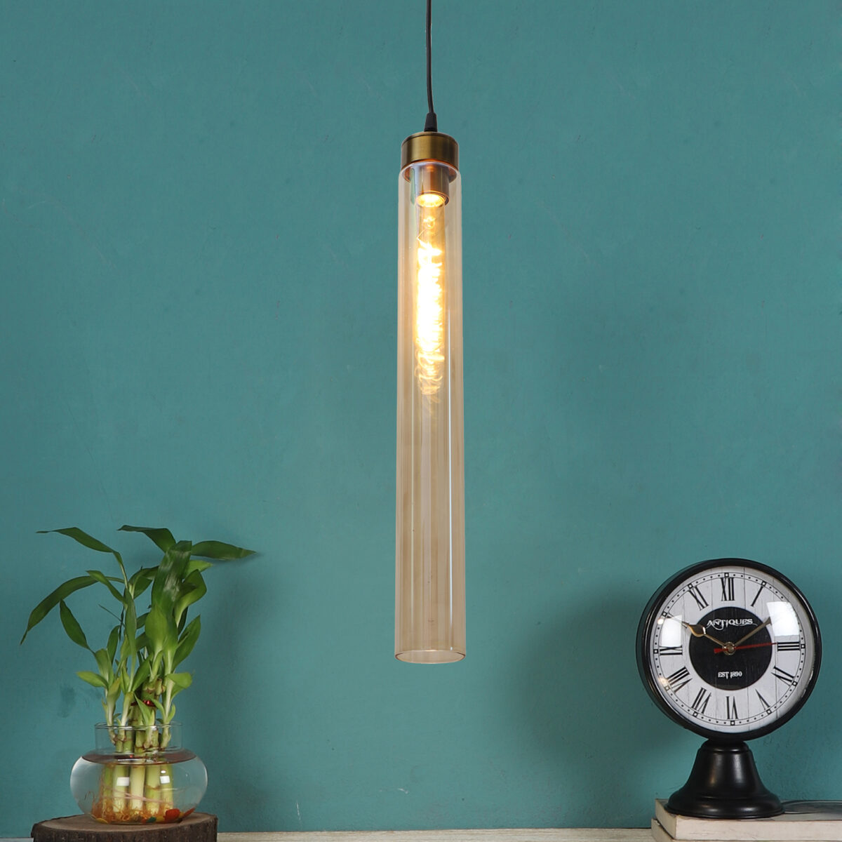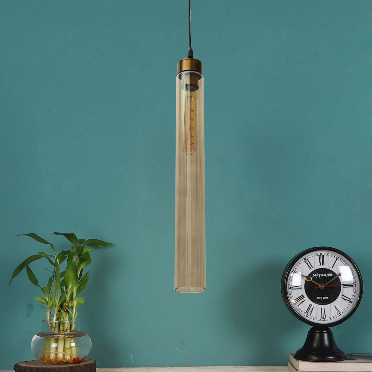 Antique gold sleek single hanging light in campaign glass. The suspension can be adjusted at time of installation to the desired height. It is maintenance free, comes with an E27 holder. LED filament lamp is recommended to enhance its beauty. Can be customized as per requirement. Can be made into a hanging cluster as per requirement.