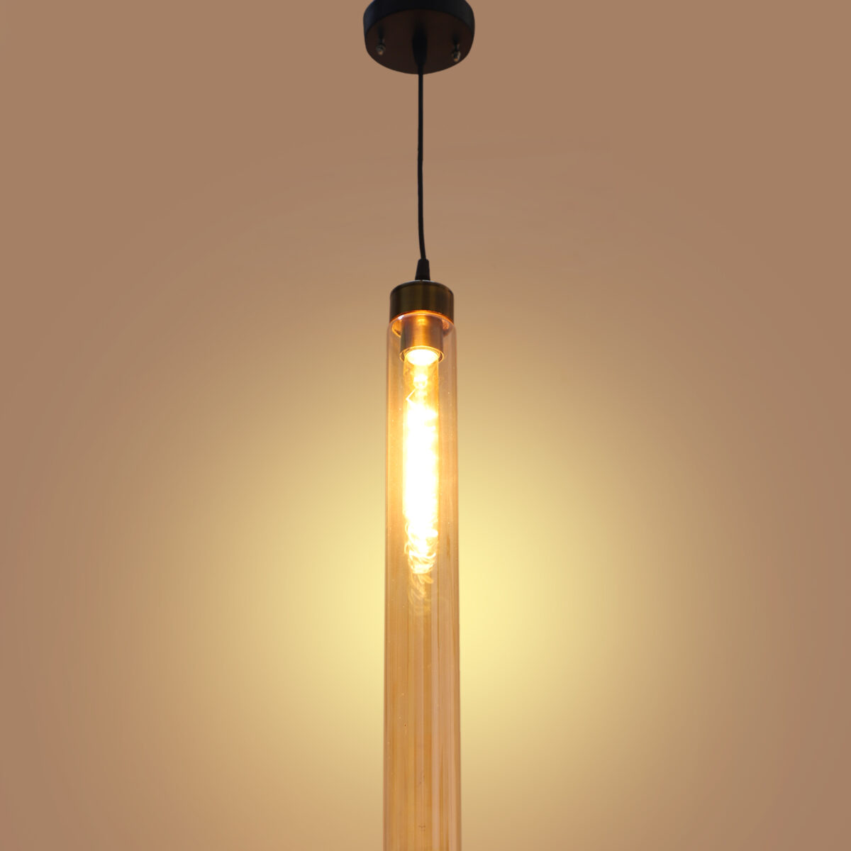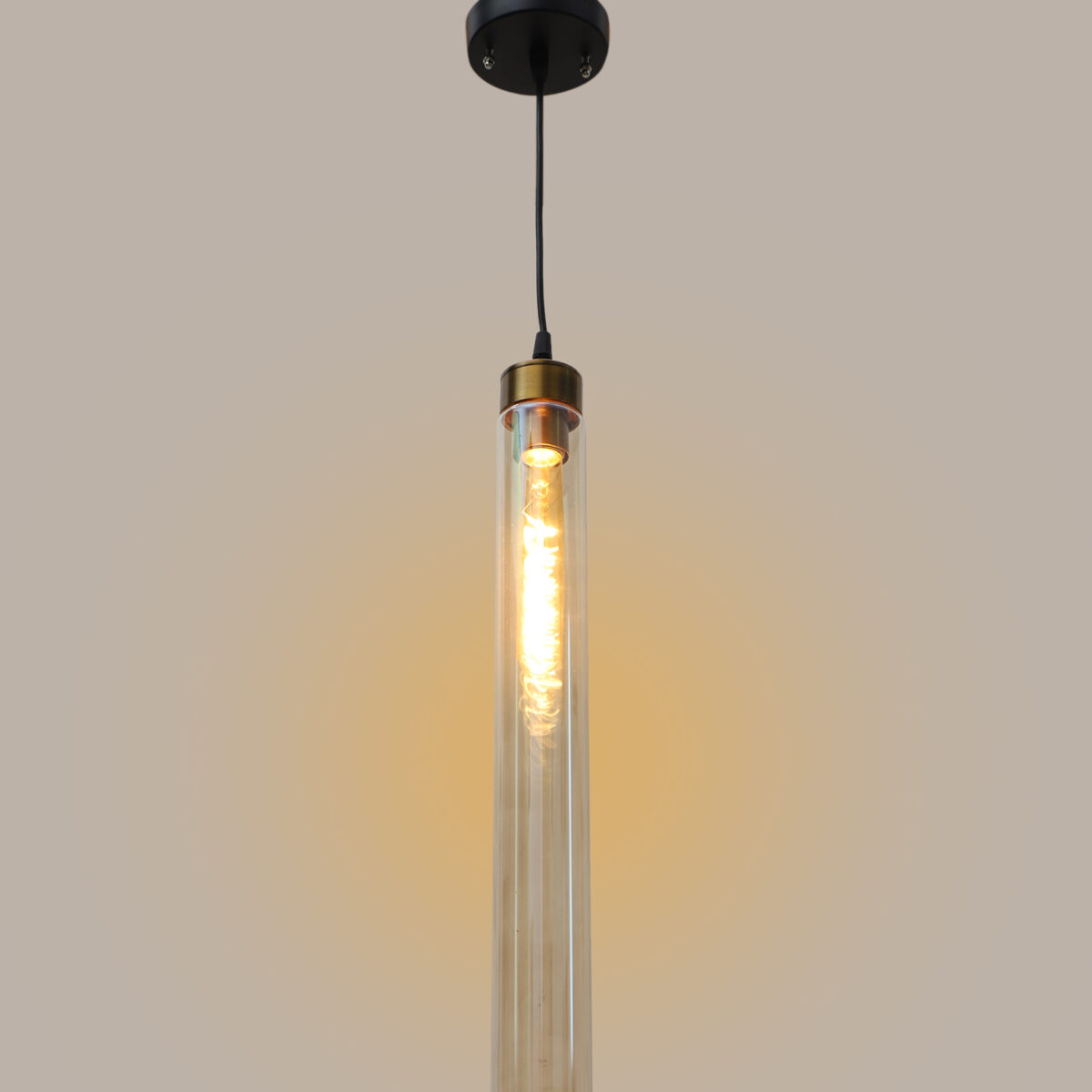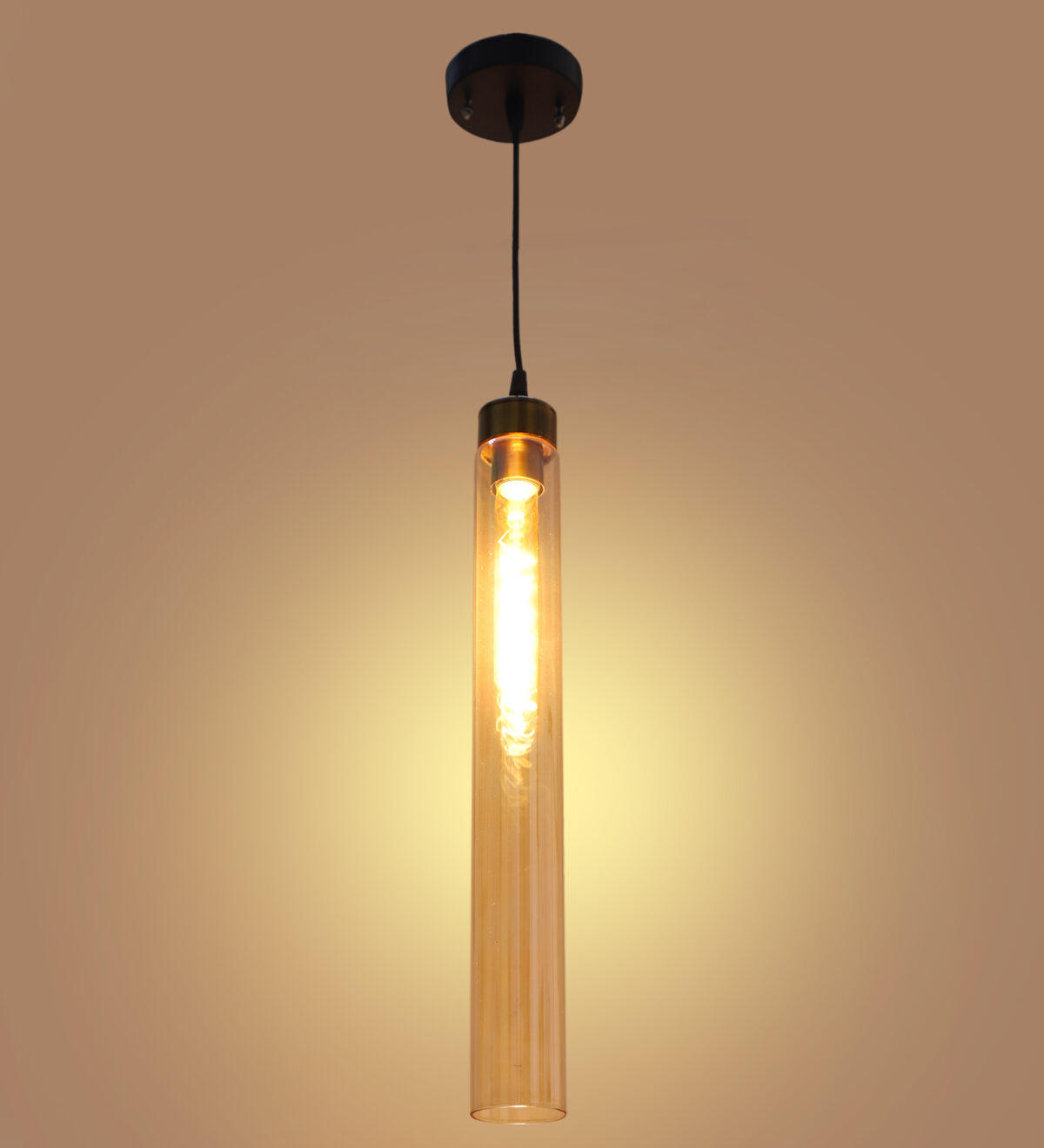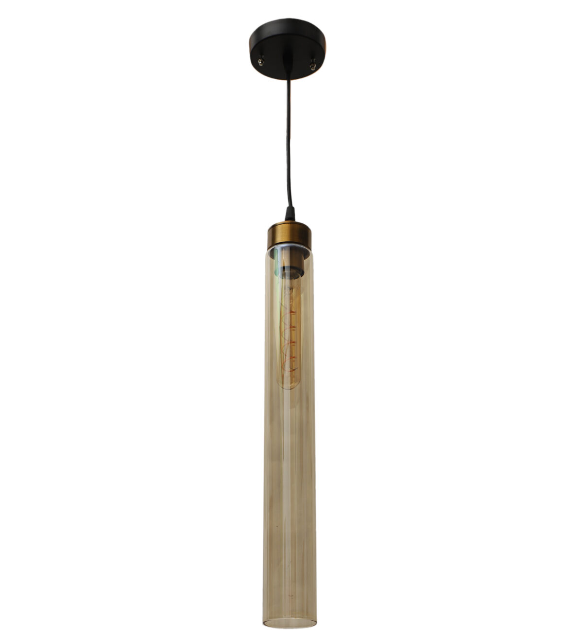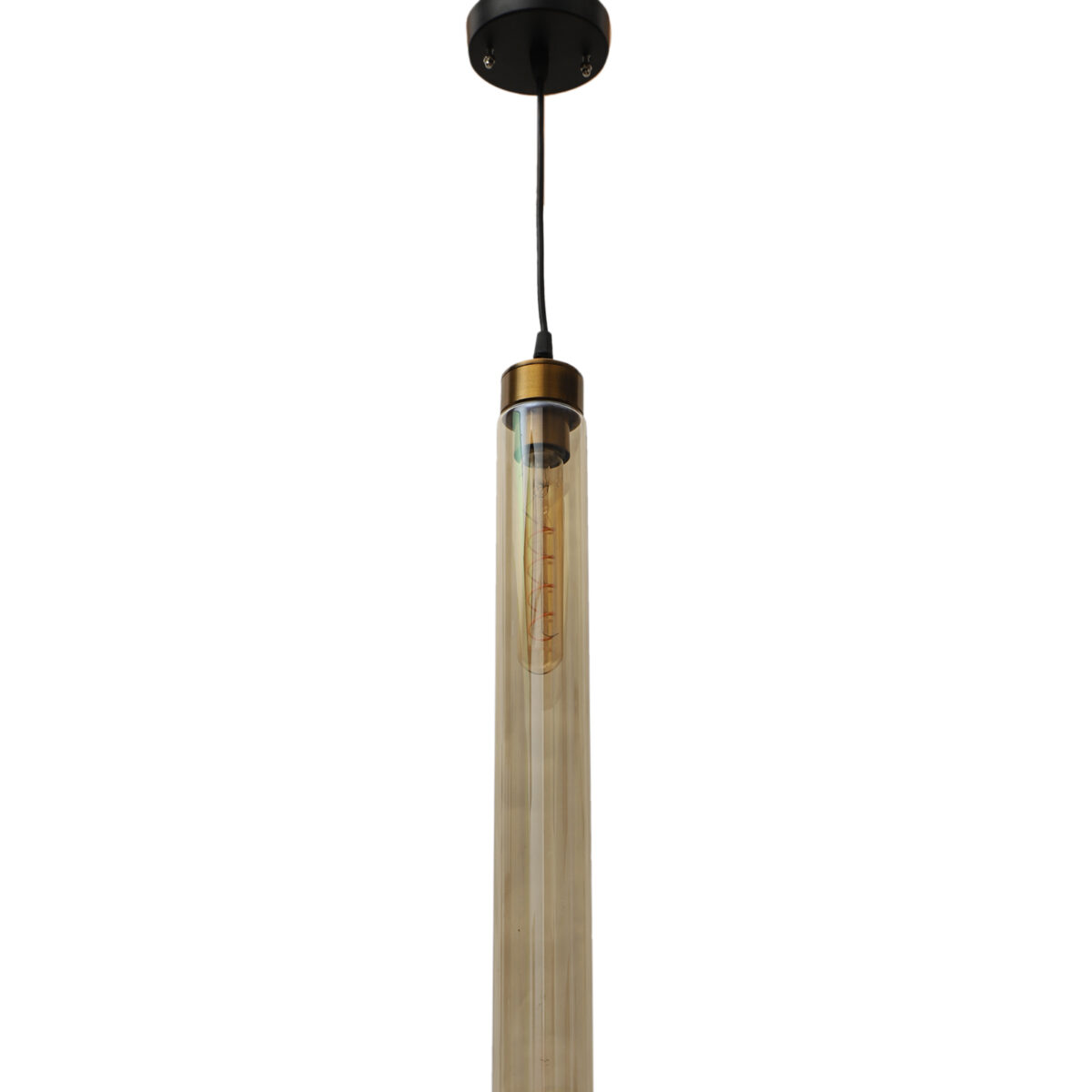 Antique gold sleek single hanging light in campaign glass. The suspension can be adjusted at time of installation to the desired height. It is maintenance free, comes with an E27 holder. LED filament lamp is recommended to enhance its beauty. Can be customized as per requirement. Can be made into a hanging cluster as per requirement.