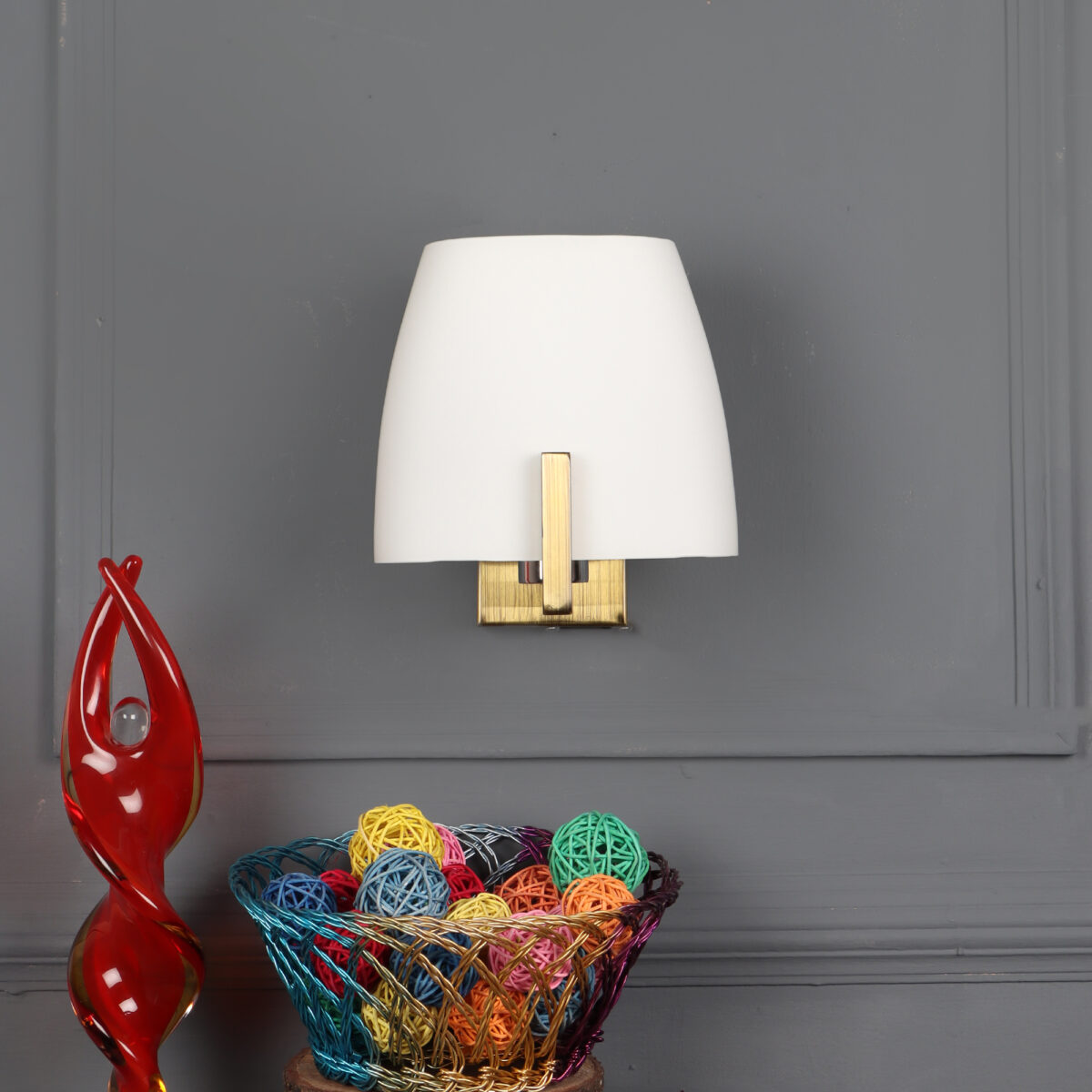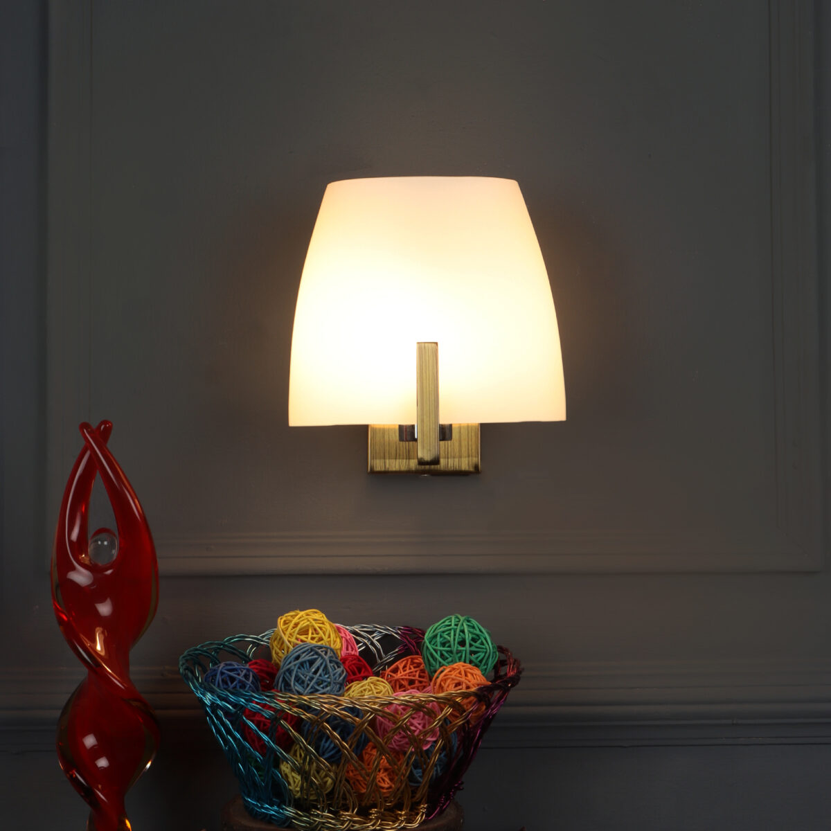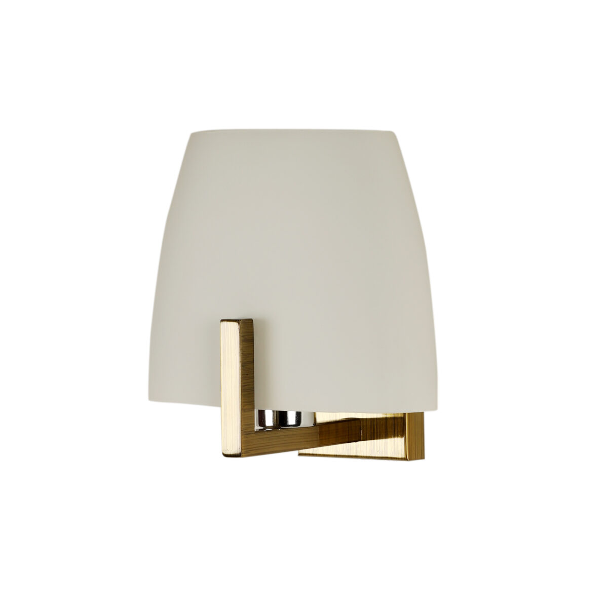 Antique brass finish single wall light made of mild steel, with a big taper white glass. It is maintenance free, glass is open from both the sides that prevents any dust collection, easy to remove glass and wash it, comes with an E27 holder, only the change of lamp is required, which is available locally everywhere. You can of course swap out the bulb for one that is dimmable, has a higher light output or a different color temperature. Application includes both residential and commercial premises wherever it matches with your interiors. Matching variations (number of lights and color) in wall light code – WL1218, WL1219, WL1322. Can be customized as per requirement in case of bulk quantities. It is one of the top selling product in our catalogue. Lamp not included.