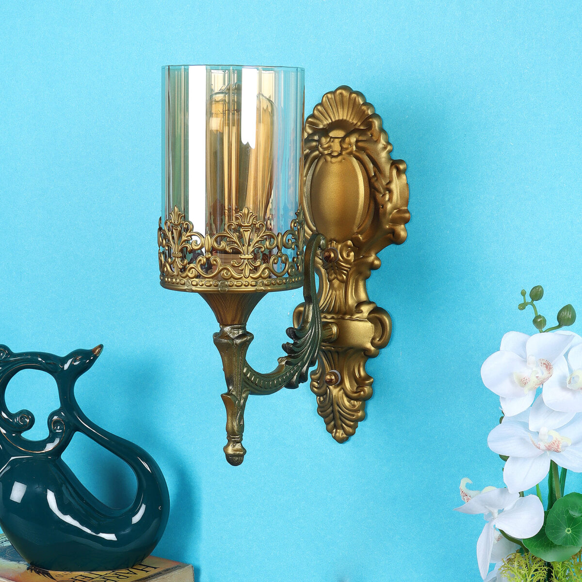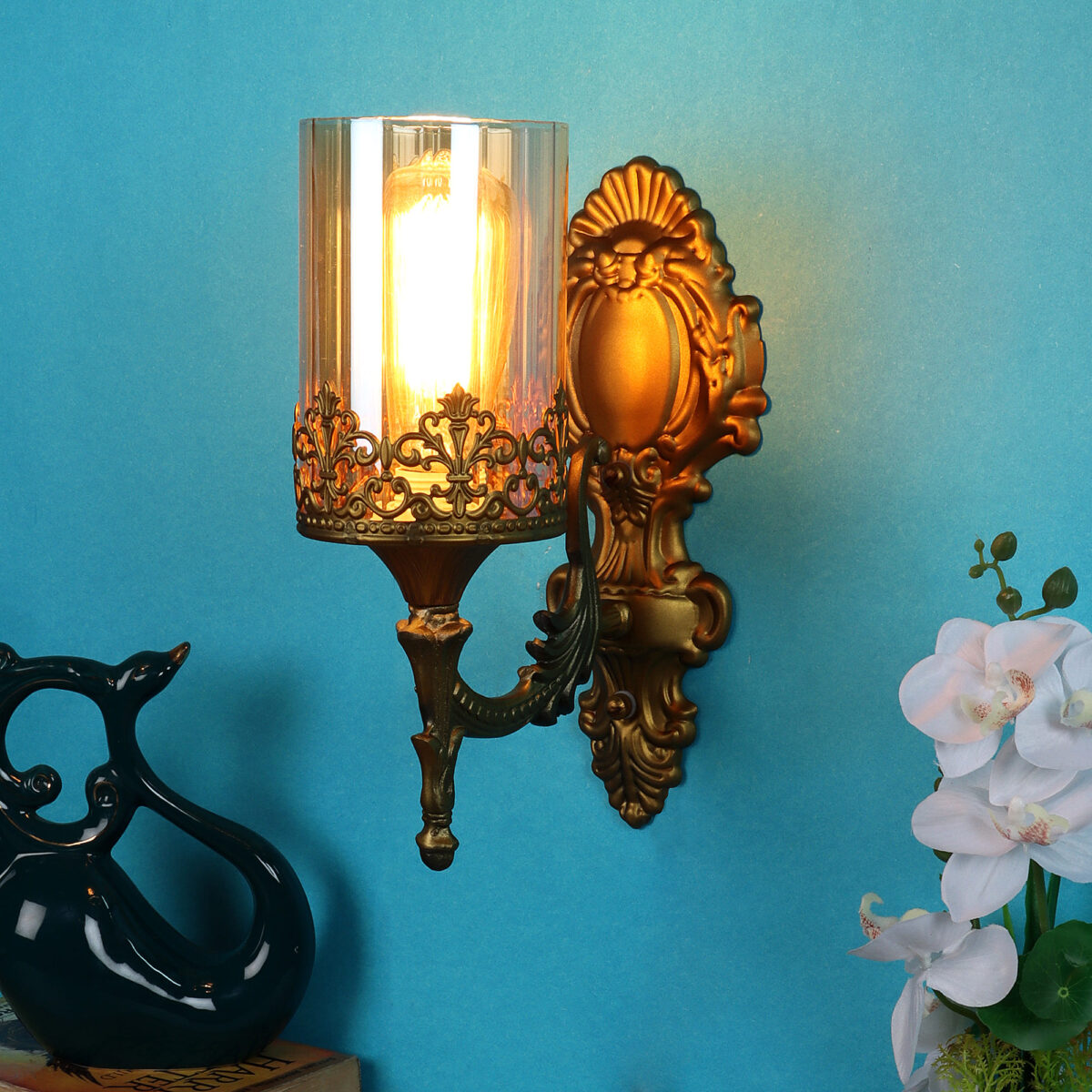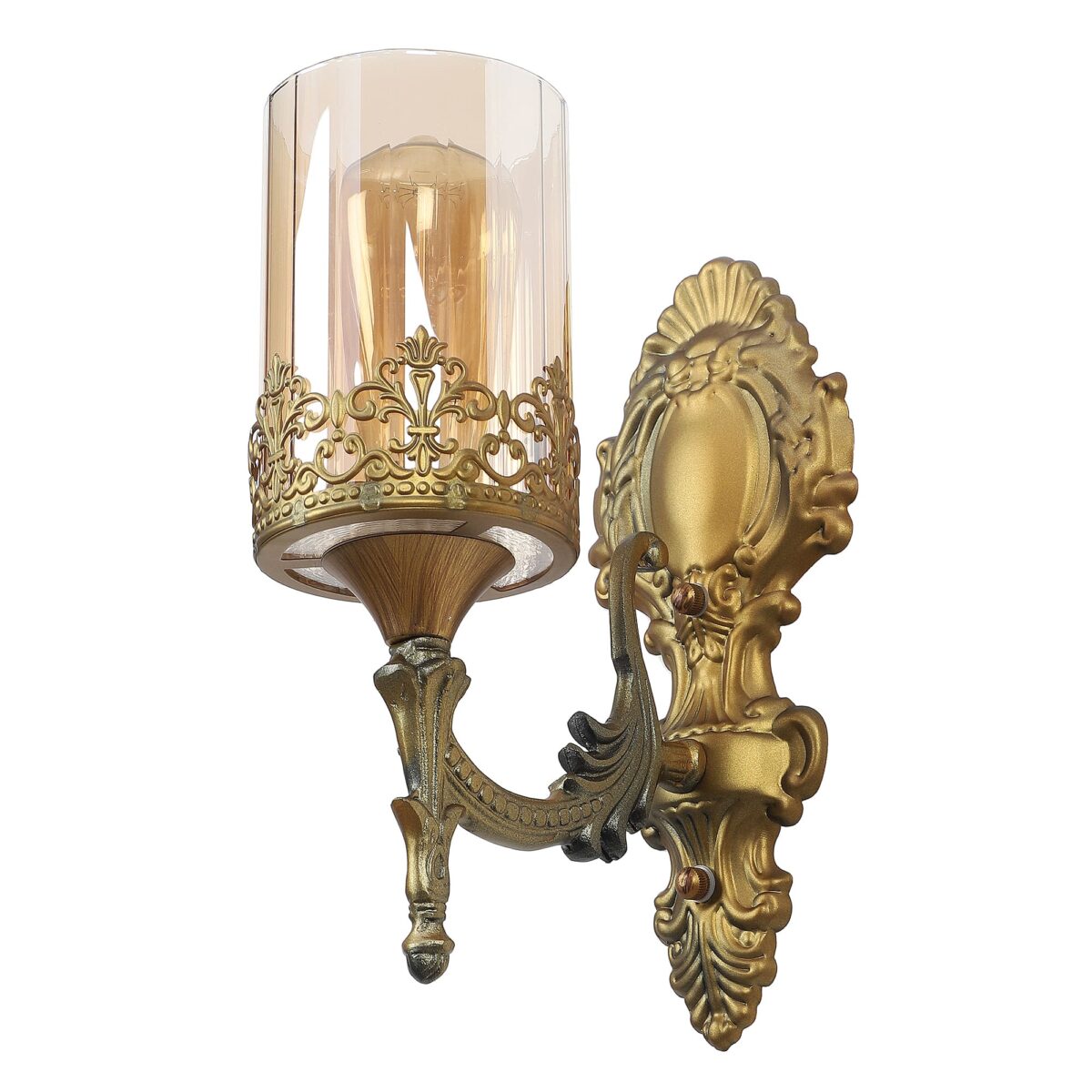 Antique brass finish traditional single wall light with a round cylindrical Champaign colored glass. It is maintenance free, easy to remove glass and wash them, comes with an E27 holder, only the change of lamp is required, which is available locally everywhere. LED filament lamp is recommended to enhance the beauty. Application includes both residential and commercial premises wherever it matches with your interiors. Matching hanging light code -HL5047-3, HL5047-1. Matching double wall light code – WL2390. Matching chandelier code – CH396. Lamp not included.