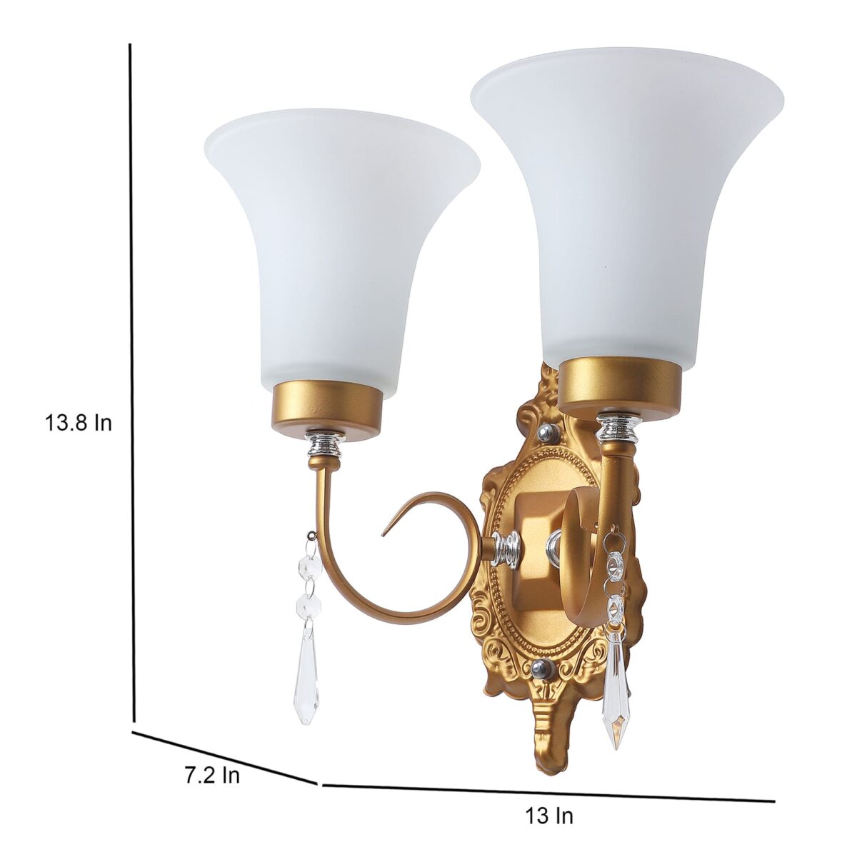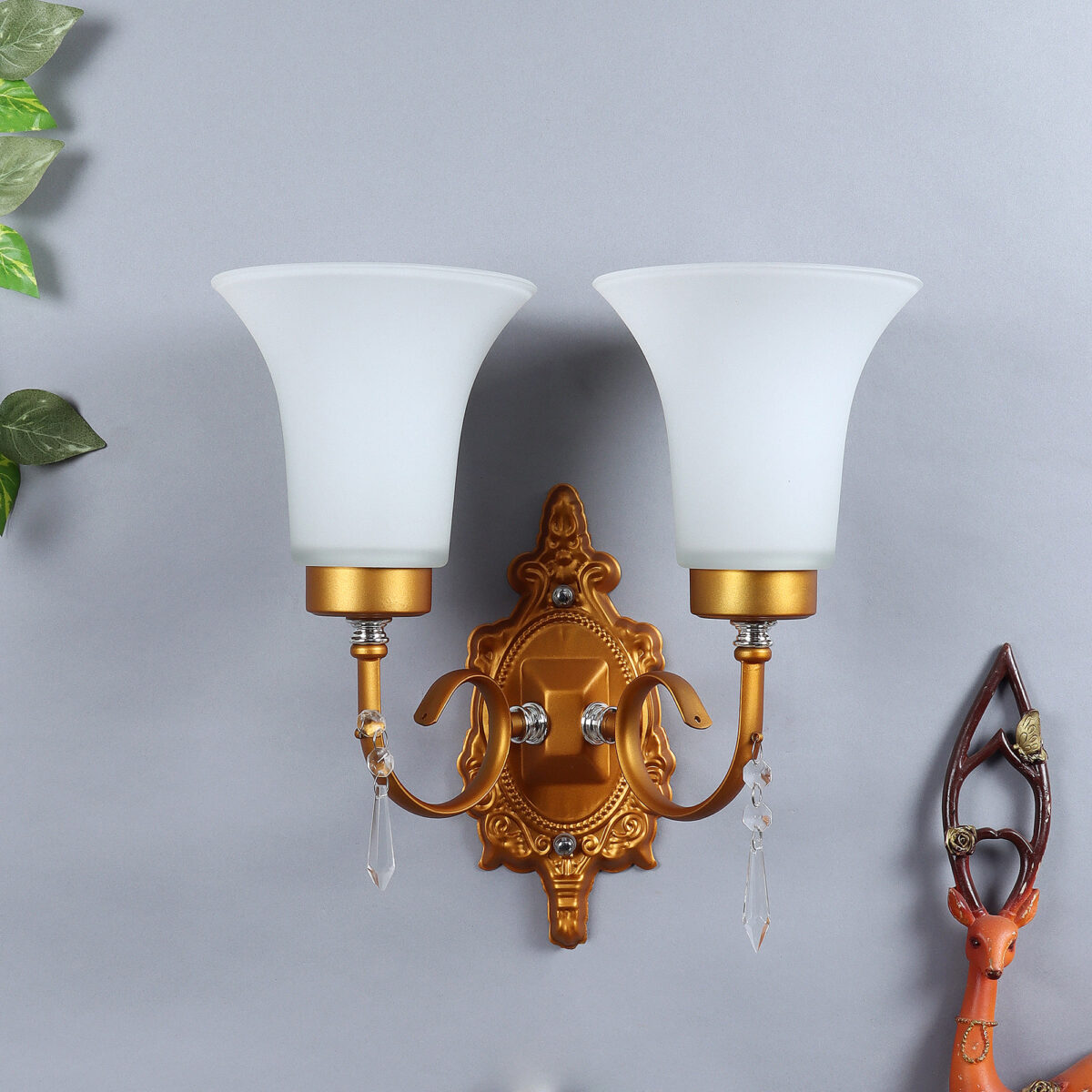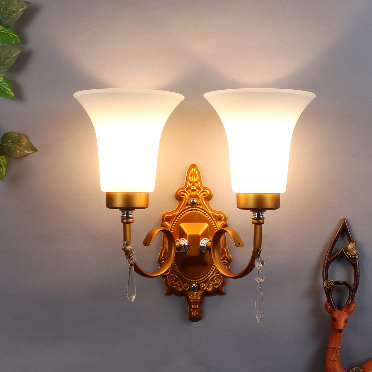 Antique brass finish double wall light having bell shaped white made of mild steel. It is maintenance free. It is easy to remove glass and wash them. Comes with an E27 holder, only the change of lamp is required, which is available locally everywhere. Application includes both residential and commercial premises wherever it matches with your interiors. Matching single wall light code -WL2445. Can be customized as per requirement in case of bulk quantities. Lamp not included.