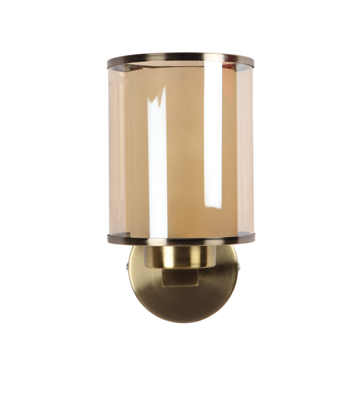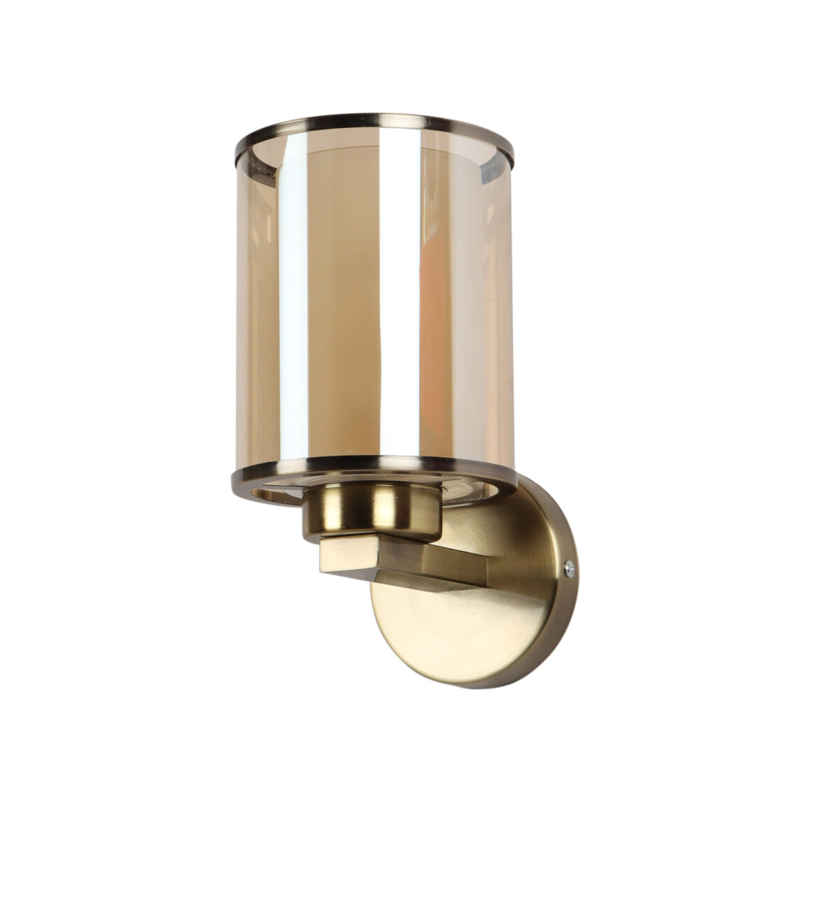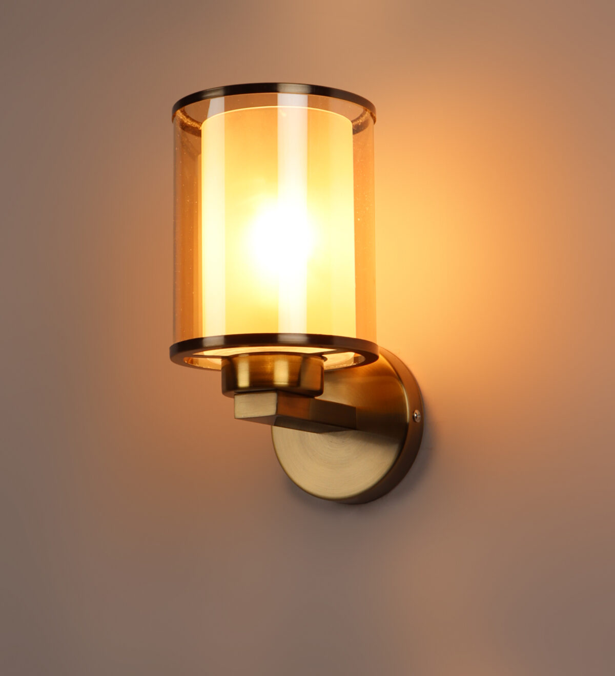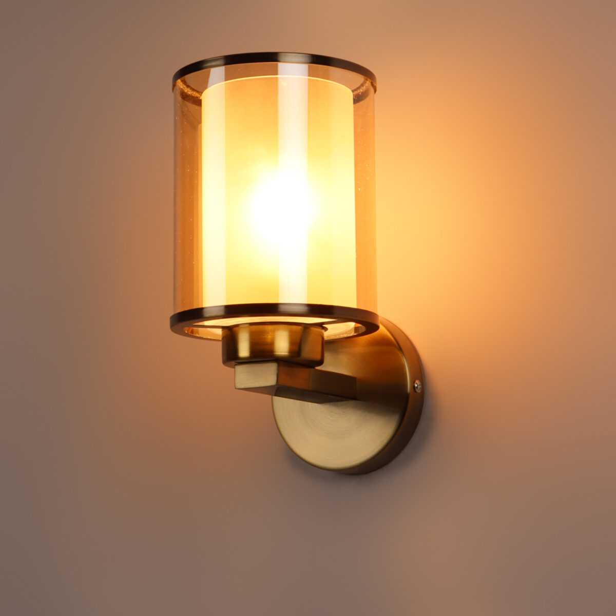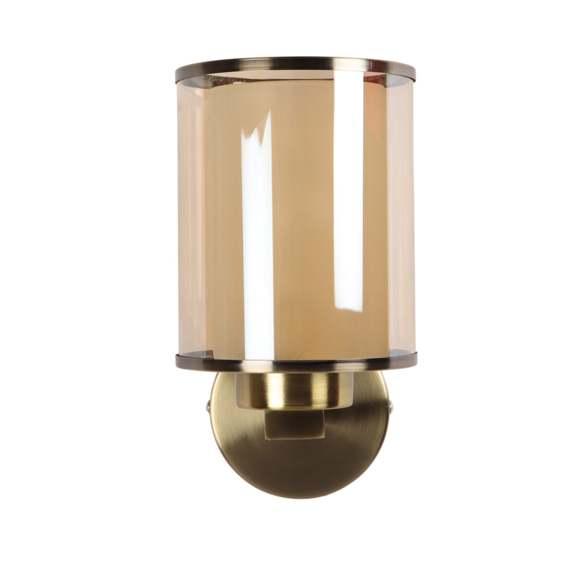 Antique brass finish single wall light having cylindrical Champaign coloured two layer glass made of mild steel. It is maintenance free., It is easy to remove glass and wash them. Comes with an E27 holder, only the change of lamp is required, which is available locally everywhere. Application includes both residential and commercial premises wherever it matches with your interiors. Matching double wall light code WL2470. LAMP NOT INCLUDED.