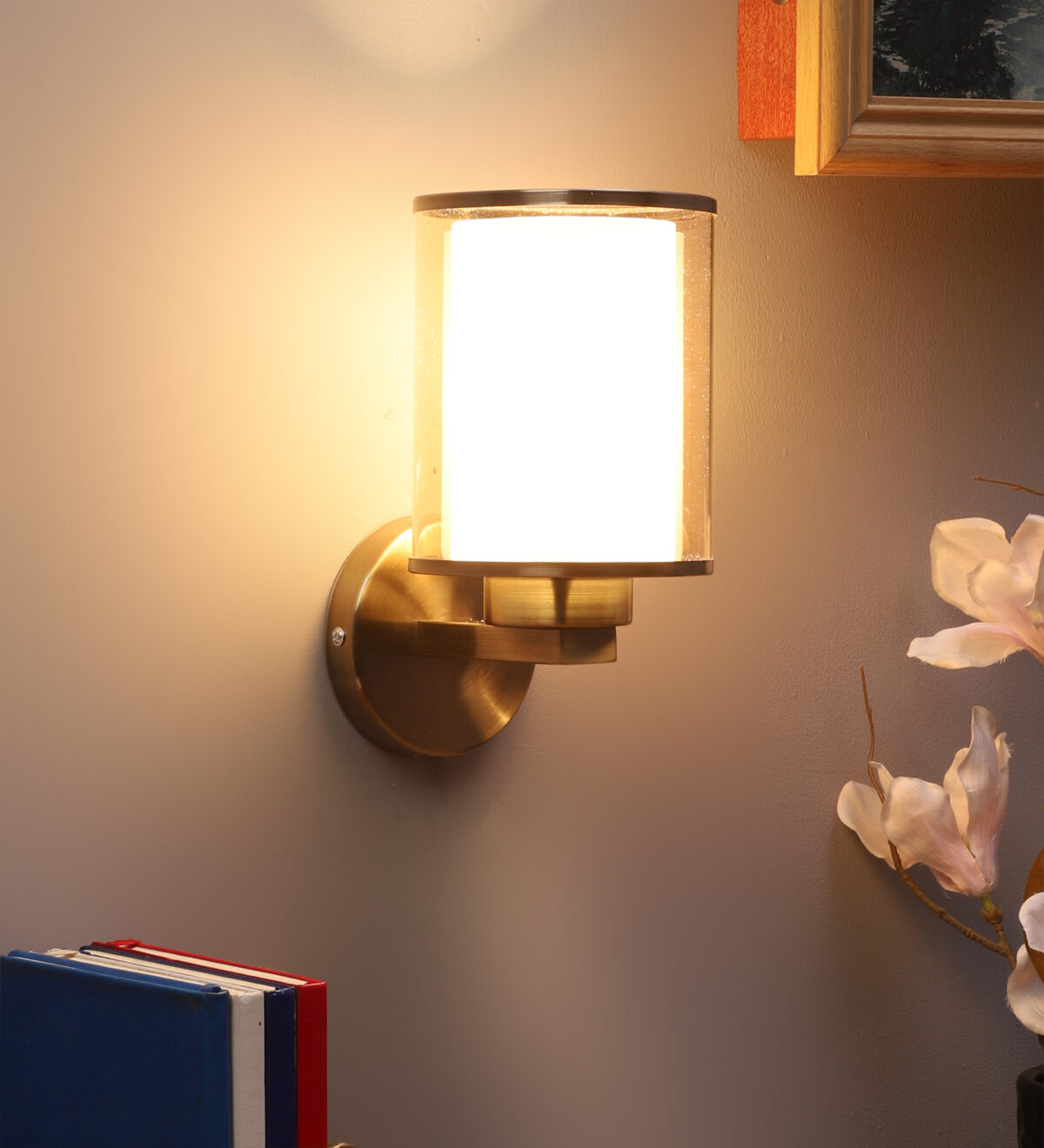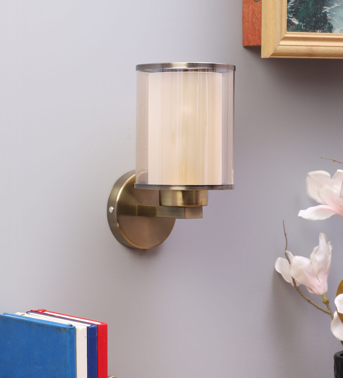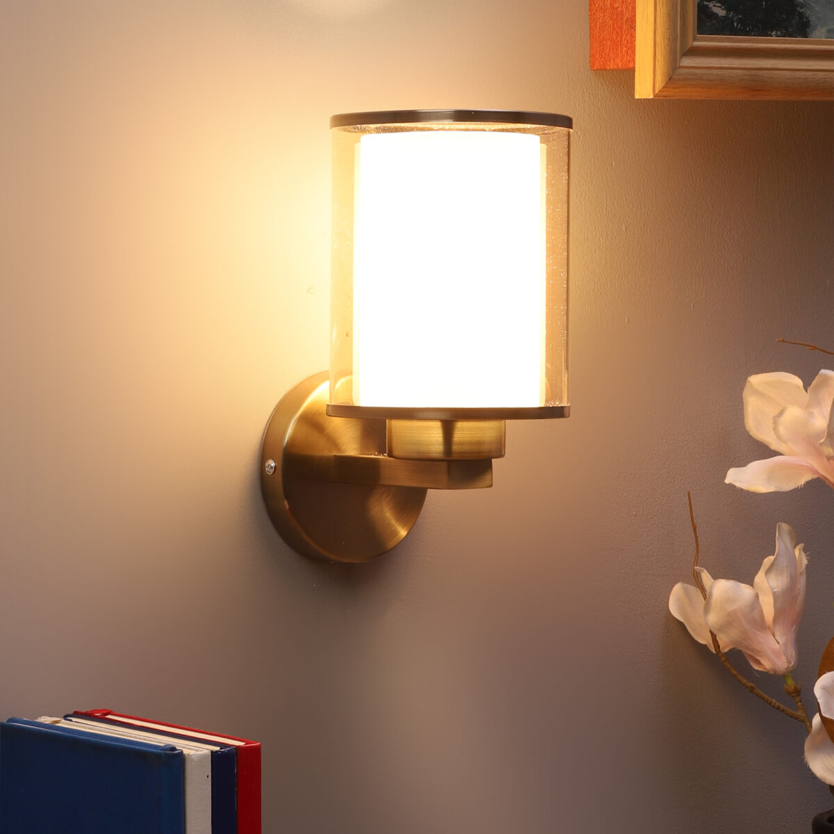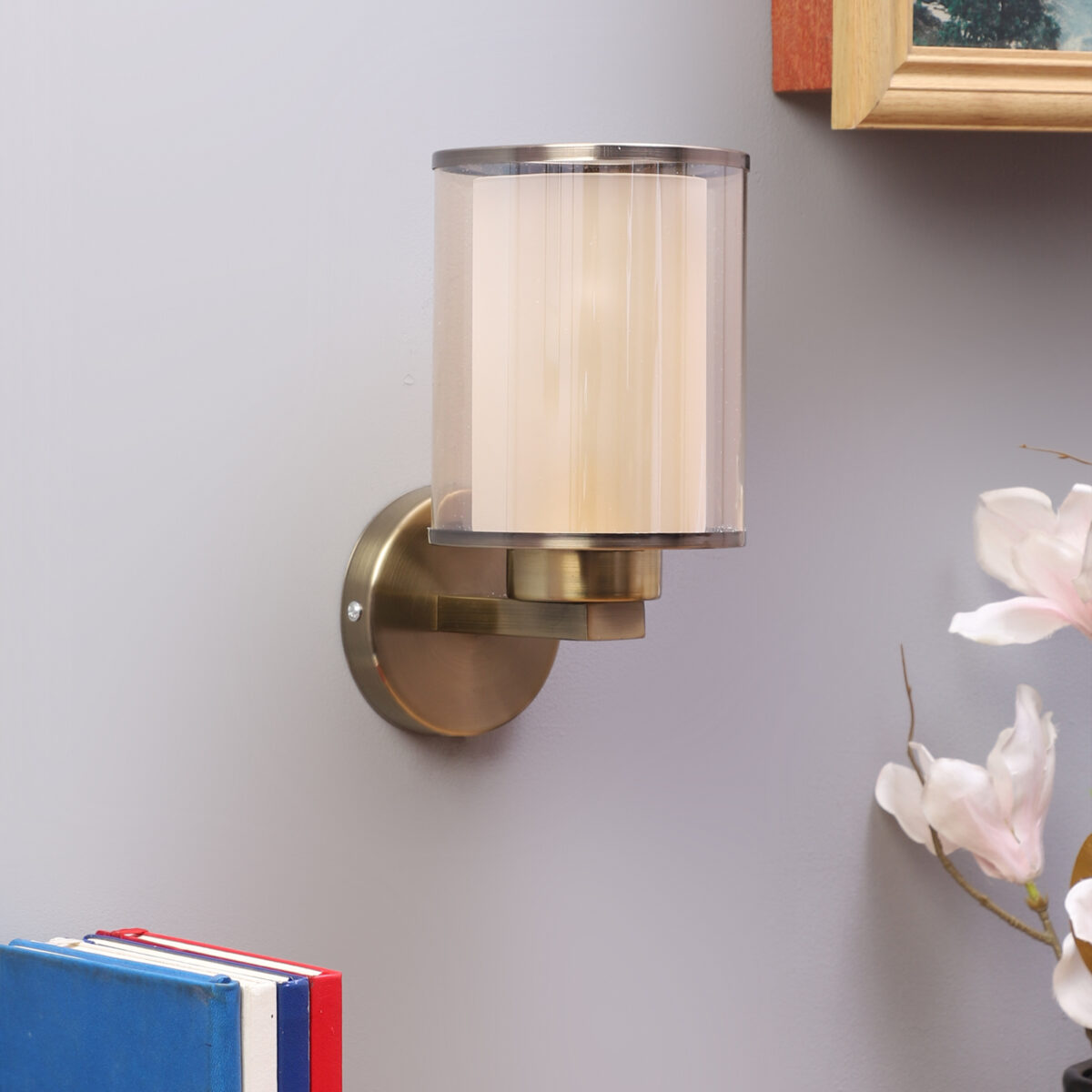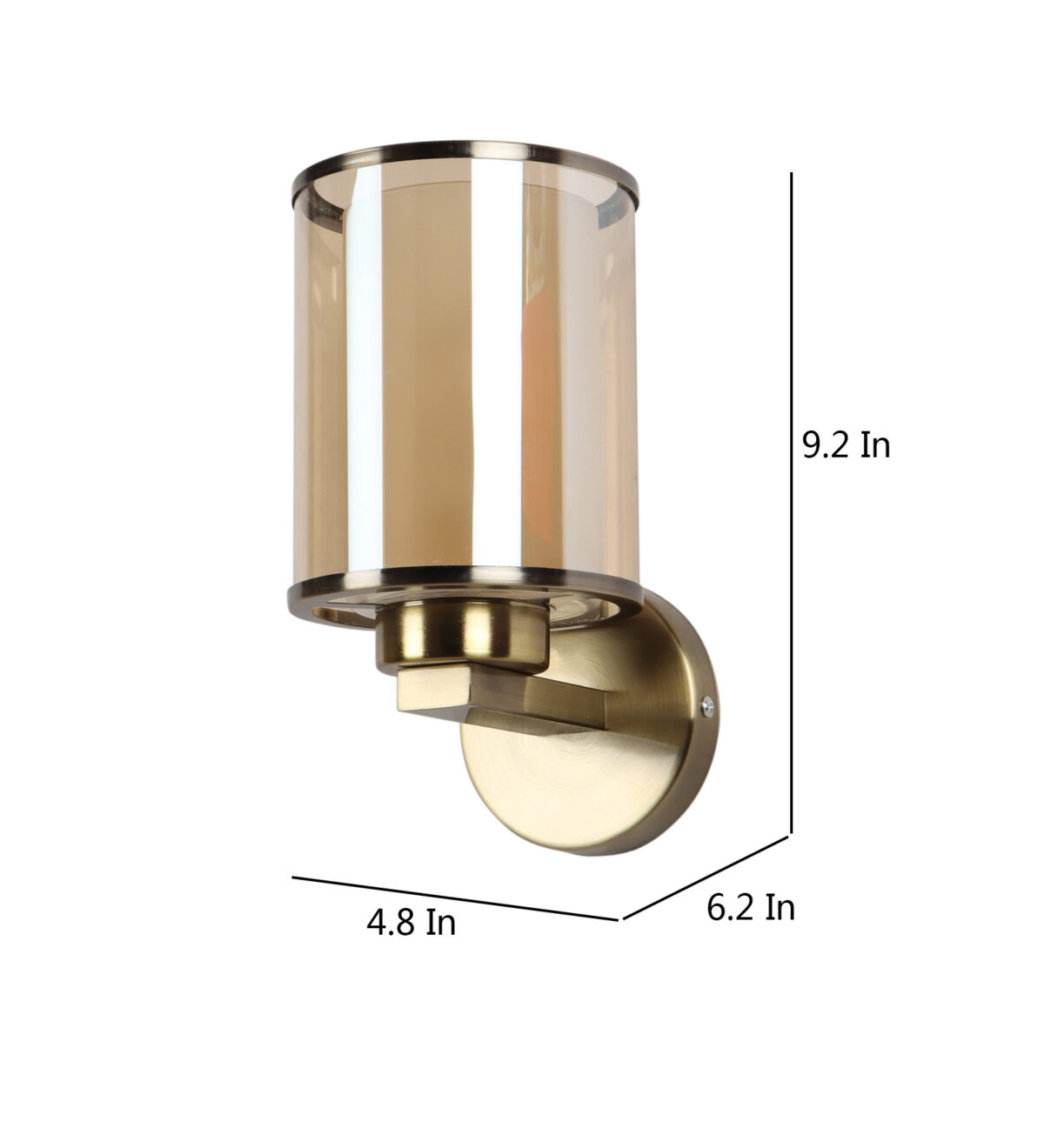 Antique brass finish single wall light having cylindrical Champaign coloured two layer glass made of mild steel. It is maintenance free., It is easy to remove glass and wash them. Comes with an E27 holder, only the change of lamp is required, which is available locally everywhere. Application includes both residential and commercial premises wherever it matches with your interiors. Matching double wall light code WL2470. LAMP NOT INCLUDED.