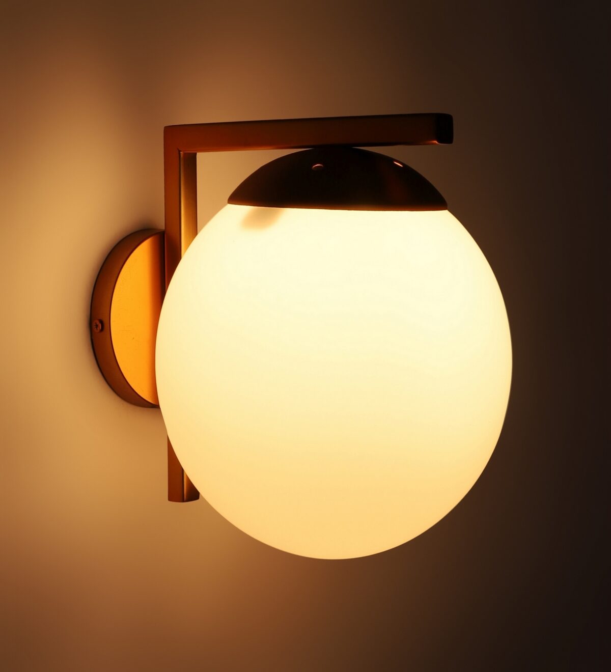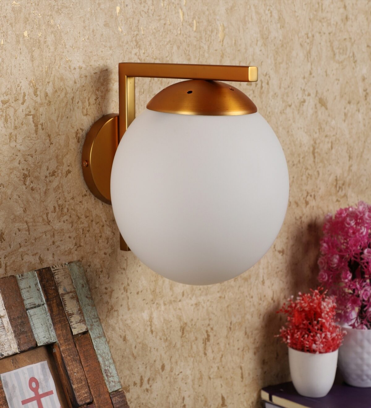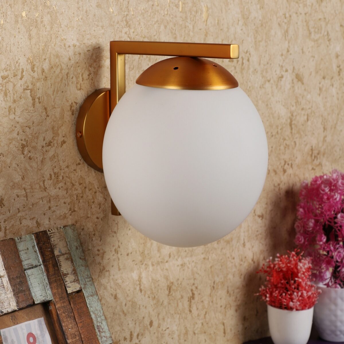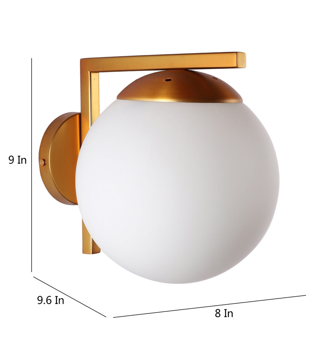 Antique gold finish single wall light made of mild steel, with white round globe (doom) glass. It is maintenance free, glass is closed from all the sides which prevents accumulation of dust, easy to remove glass and wash it, comes with an E27 holder, only the change of lamp is required, which is available locally everywhere. You can of course swap out the bulb for one that is dimmable, has a higher light output or a different color temperature. Application includes both residential and commercial premises wherever it matches with your interiors. It is one of the best selling product in our catalogue. Can be customised as per requirement in case of bulk quantities. LAMP NOT INCLUDED.