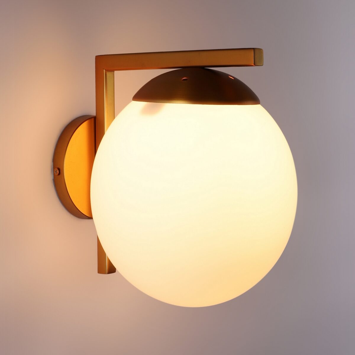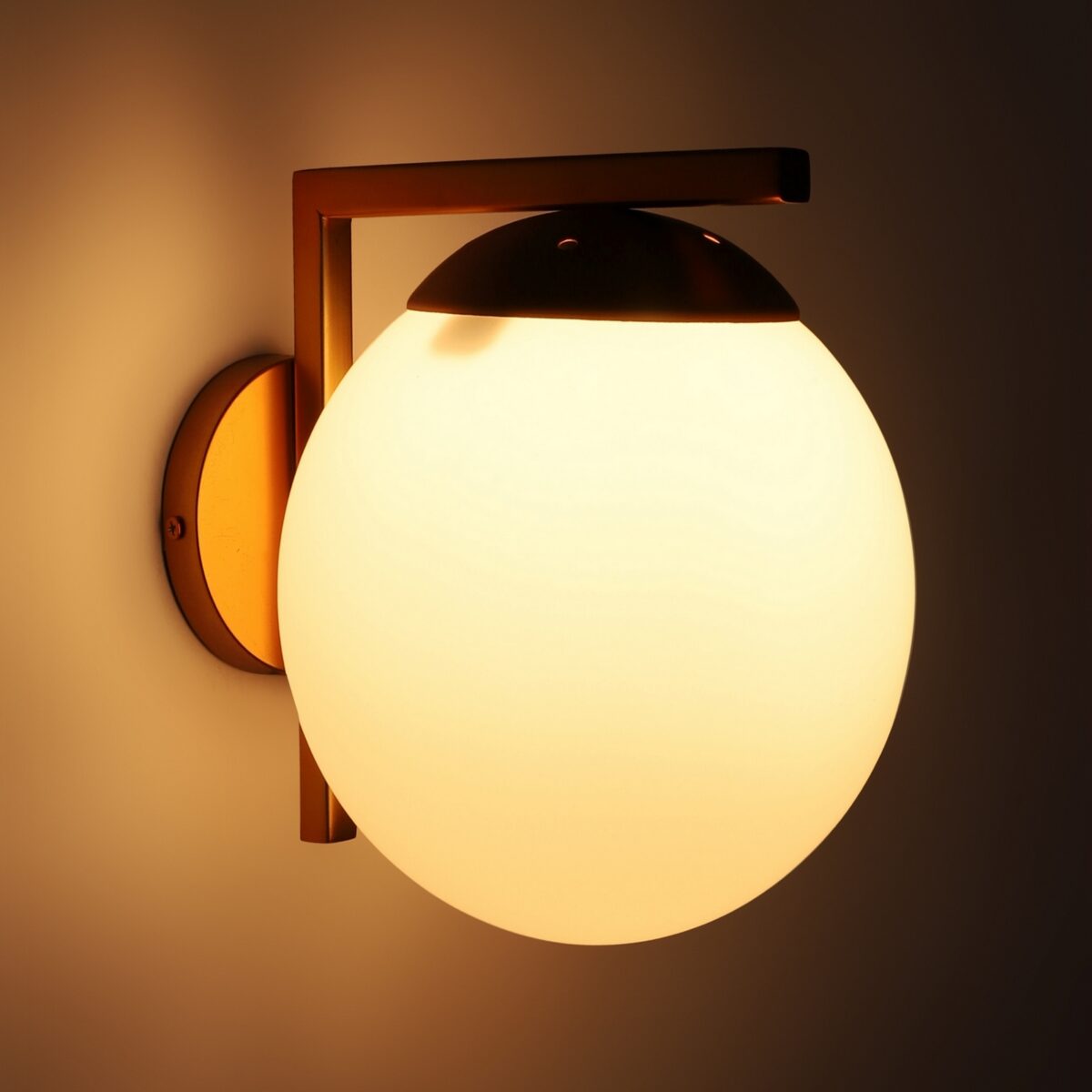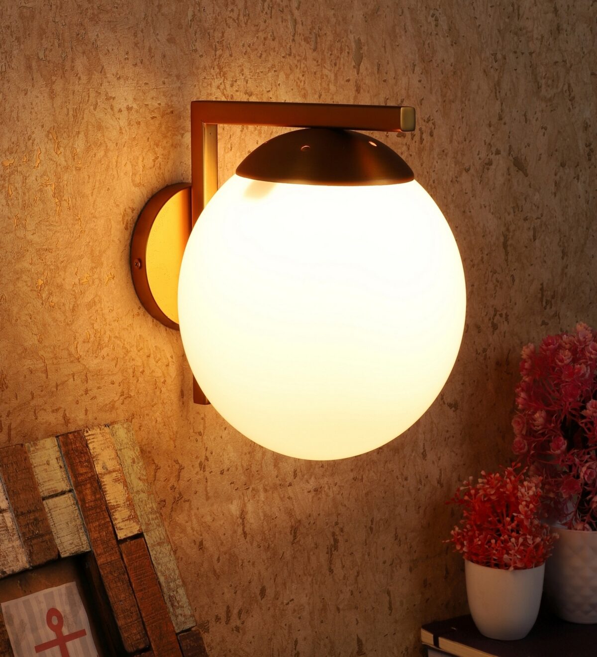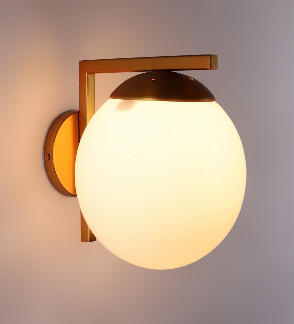 Antique gold finish single wall light made of mild steel, with white round globe (doom) glass. It is maintenance free, glass is closed from all the sides which prevents accumulation of dust, easy to remove glass and wash it, comes with an E27 holder, only the change of lamp is required, which is available locally everywhere. You can of course swap out the bulb for one that is dimmable, has a higher light output or a different color temperature. Application includes both residential and commercial premises wherever it matches with your interiors. It is one of the best selling product in our catalogue. Can be customised as per requirement in case of bulk quantities. LAMP NOT INCLUDED.