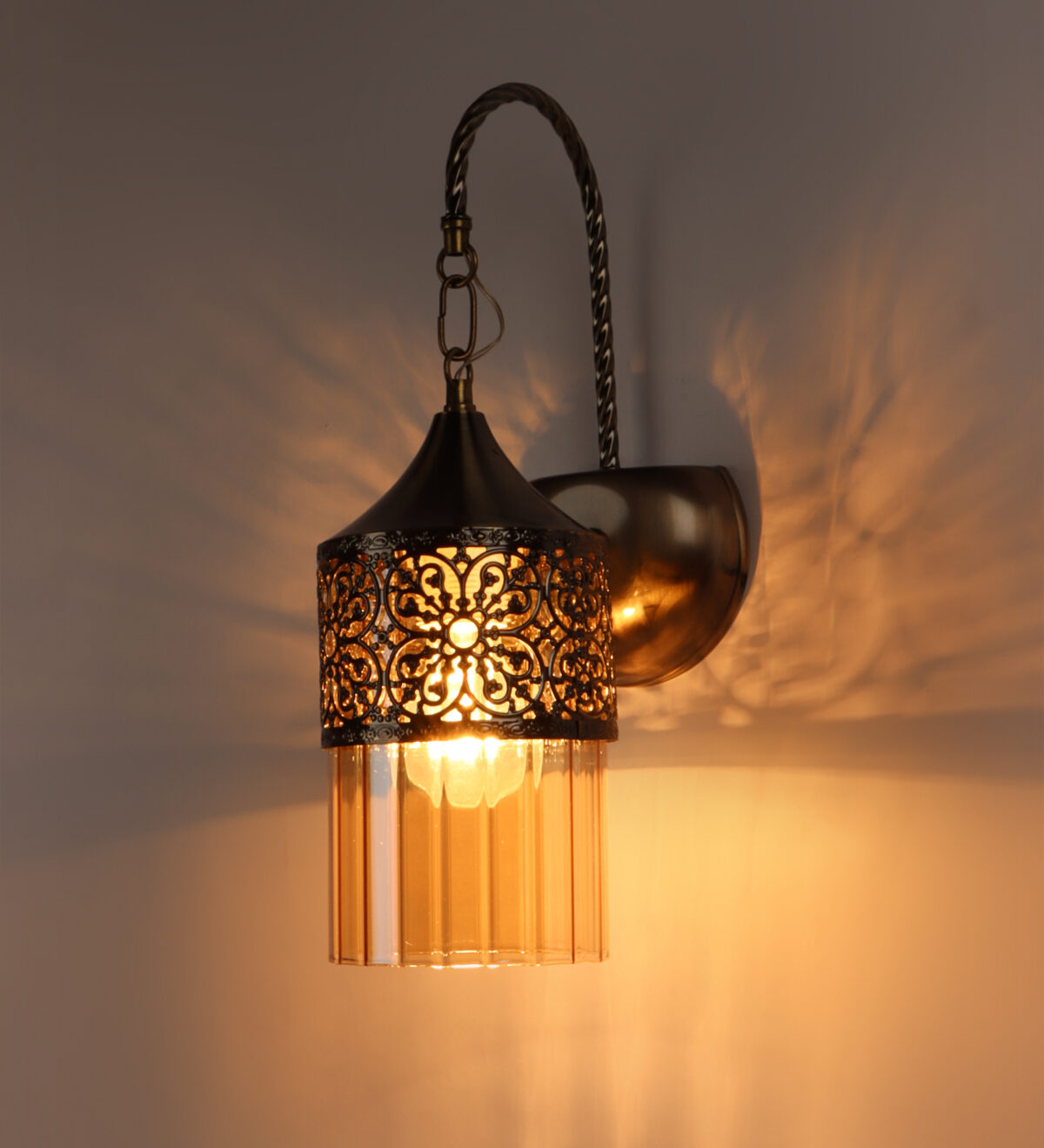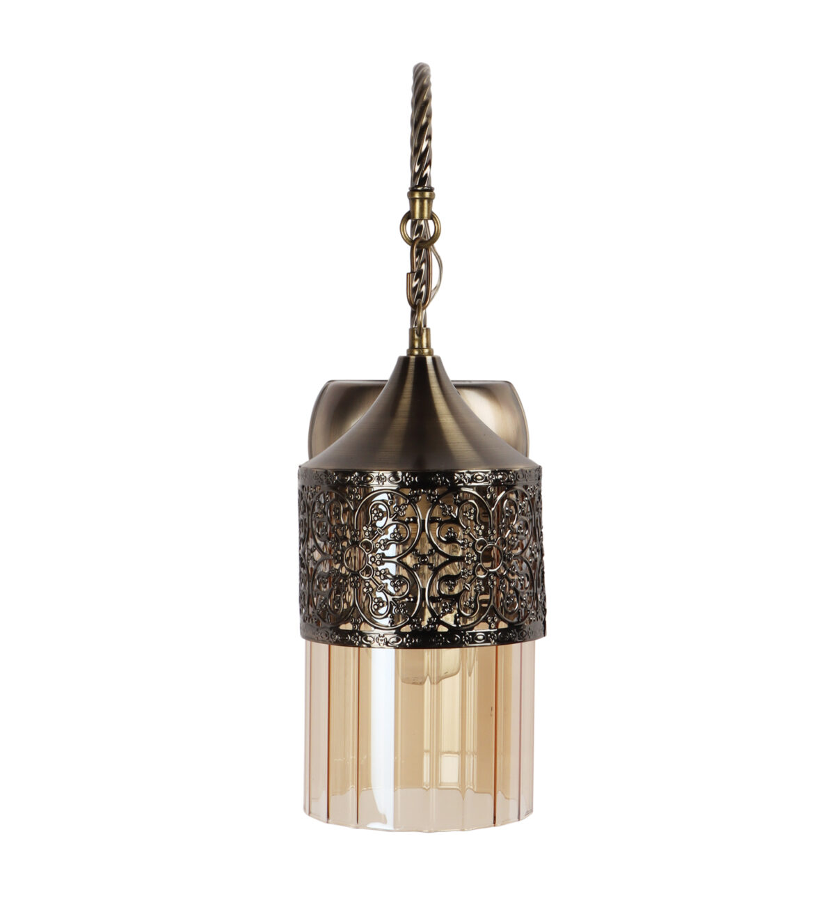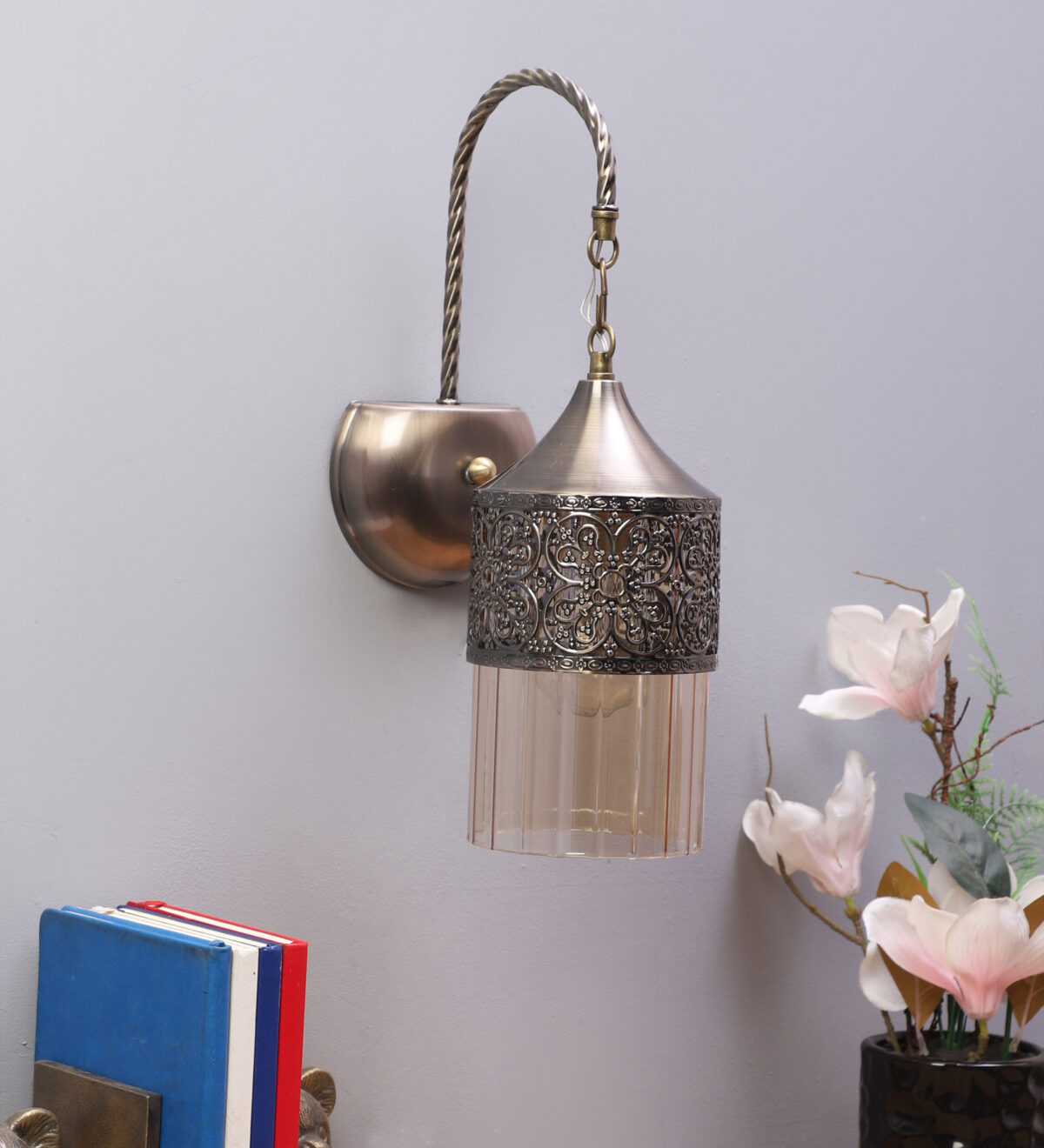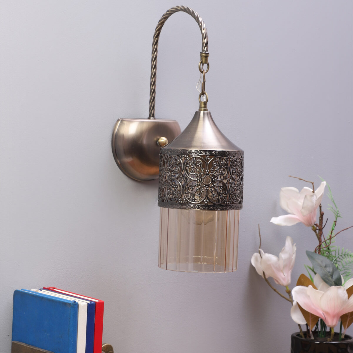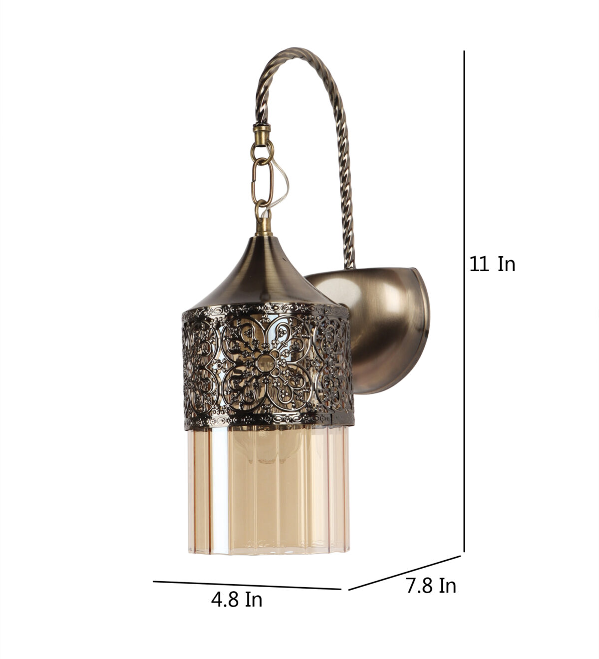 Antique brass finish single wall light made of mild steel having champaign coloured glass. It is maintenance free. Comes with an E27 holder, only the change of lamp is required, which is available locally everywhere. Application includes both residential and commercial premises wherever it matches with your interiors. LAMPS NOT INCLUDED.