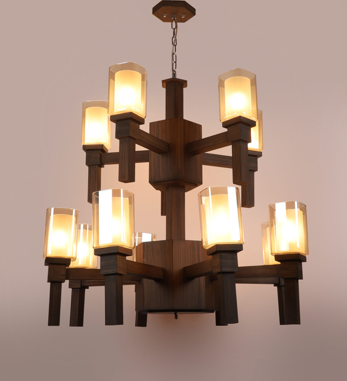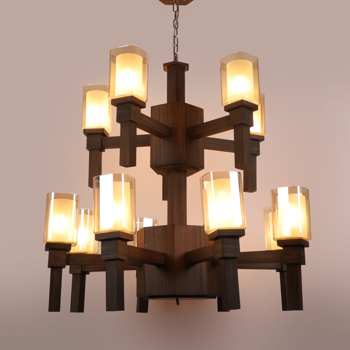 Dark brown (wood), square long two layered champagne coloured glass mounted on a designer frame made of wood having thirteen lights. This is a hanging type chandelier in which the base plate is fixed to the ceiling with the help of straight clamp and screws. The suspension can be adjusted at time of installation to the desired height. It is maintenance free, easy to remove glass and wash them. Comes with an E27 holder, only the change of lamp is required, which is available locally everywhere. Application includes both residential and commercial premises wherever it matches with your interiors. Matching wall light code WL2343, WL2344. Also available in six and eight lights with code CH394 and CH394-8. Can be customized as per requirement in case of bulk quantities. This along with its variants are the best selling products in our catalogue. LAMP NOT INCLUDED.