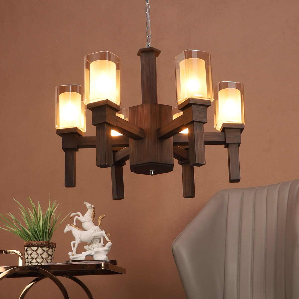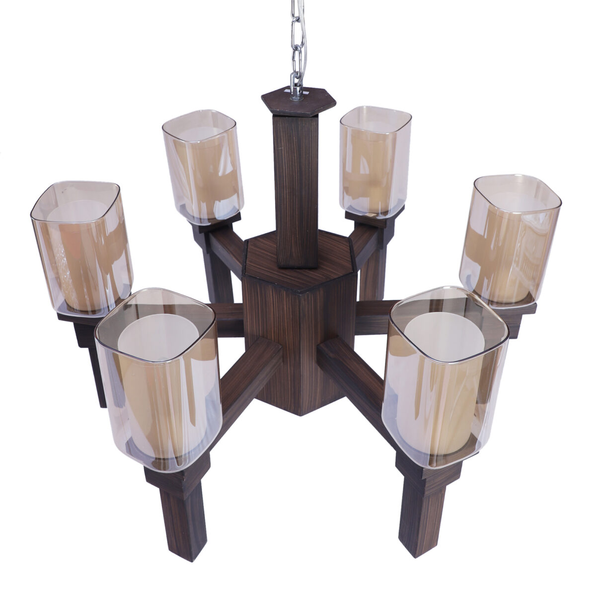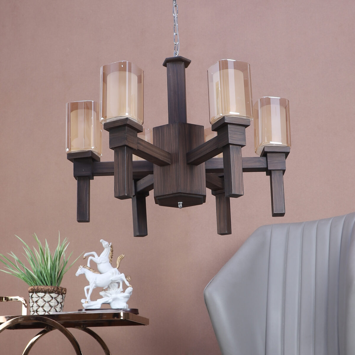 Dark brown (wood), square long two layered champagne coloured glass mounted on a designer frame made of wood having six lights. This is a hanging type chandelier in which the base plate is fixed to the ceiling with the help of straight clamp and screws. The suspension can be adjusted at time of installation to the desired height. It is maintenance free, easy to remove glass and wash them. Comes with an E27 holder, only the change of lamp is required, which is available locally everywhere. Application includes both residential and commercial premises wherever it matches with your interiors. Matching wall light code WL2343, WL2344. Also available in eight and thirteen lights with code CH394-8, CH394-13. Can be customized as per requirement in case of bulk quantities. This along with its variants are the best selling products in our catalogue. LAMP NOT INCLUDED.