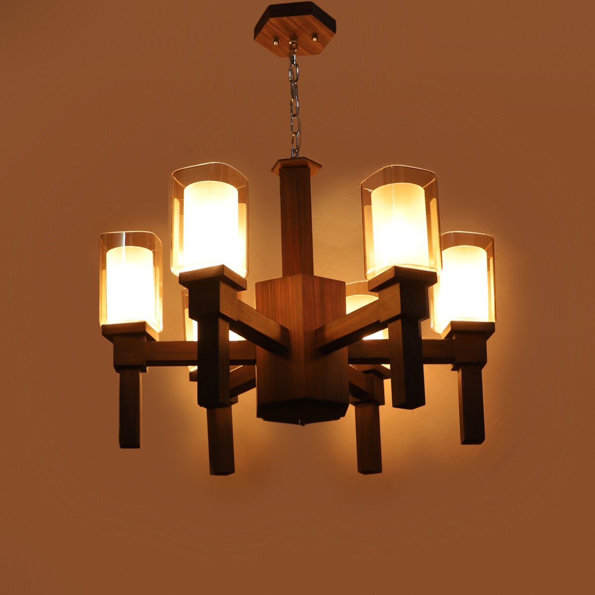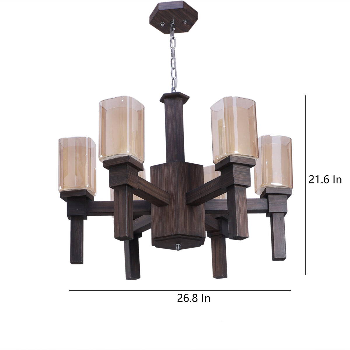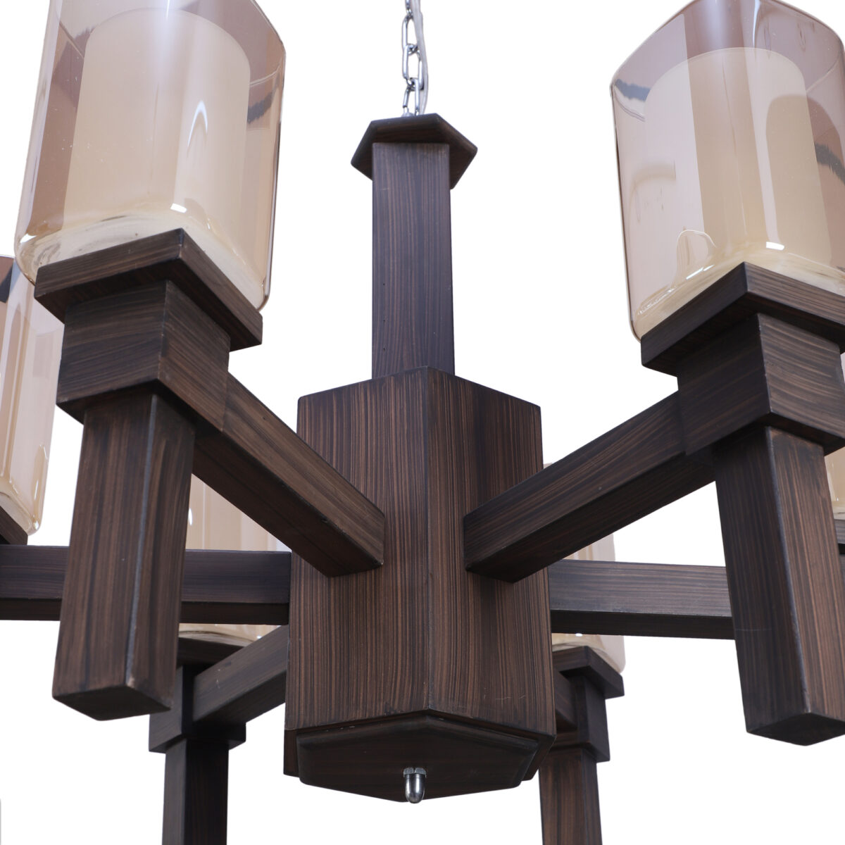Dark brown (wood), square long two layered champagne coloured glass mounted on a designer frame made of wood having six lights. This is a hanging type chandelier in which the base plate is fixed to the ceiling with the help of straight clamp and screws. The suspension can be adjusted at time of installation to the desired height. It is maintenance free, easy to remove glass and wash them. Comes with an E27 holder, only the change of lamp is required, which is available locally everywhere. Application includes both residential and commercial premises wherever it matches with your interiors. Matching wall light code WL2343, WL2344. Also available in eight and thirteen lights with code CH394-8, CH394-13. Can be customized as per requirement in case of bulk quantities. This along with its variants are the best selling products in our catalogue. LAMP NOT INCLUDED.