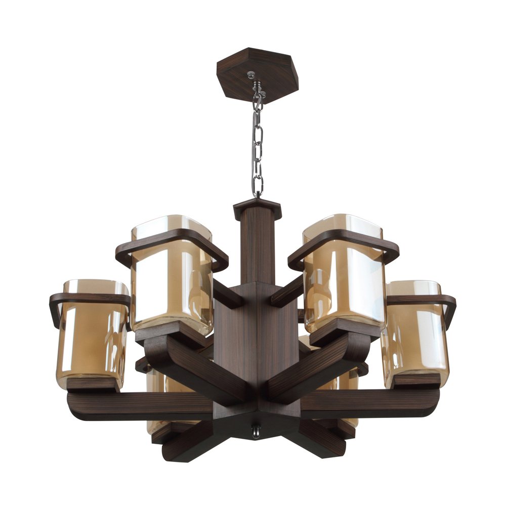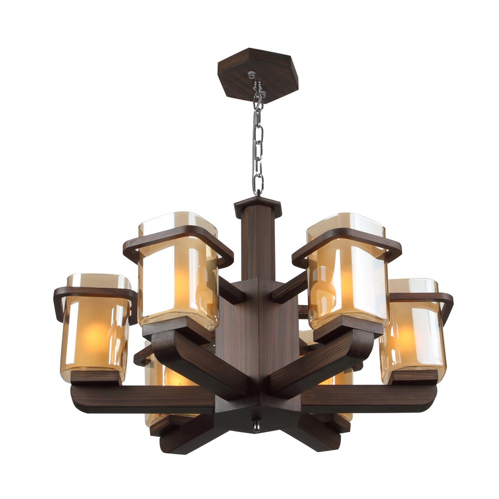 Dark brown (wood) square long two layered champagne coloured glass mounted on a designer frame made of wood having six lights. This is a hanging type chandelier in which the base plate is fixed to the ceiling with the help of straight clamp and screws. The suspension can be adjusted at time of installation to the desired height. It is maintenance free, easy to remove glass and wash them. Comes with an E27 holder, only the change of lamp is required, which is available locally everywhere. Application includes both residential and commercial premises wherever it matches with your interiors. Matching wall light code WL2357, WL2358. Also available in big sizes with eight and thirteen lights with code CH428-8, CH428-13. Can be customized as per requirement in case of bulk quantities. This along with its variants are the best selling products in our catalogue. LAMP NOT INCLUDED.