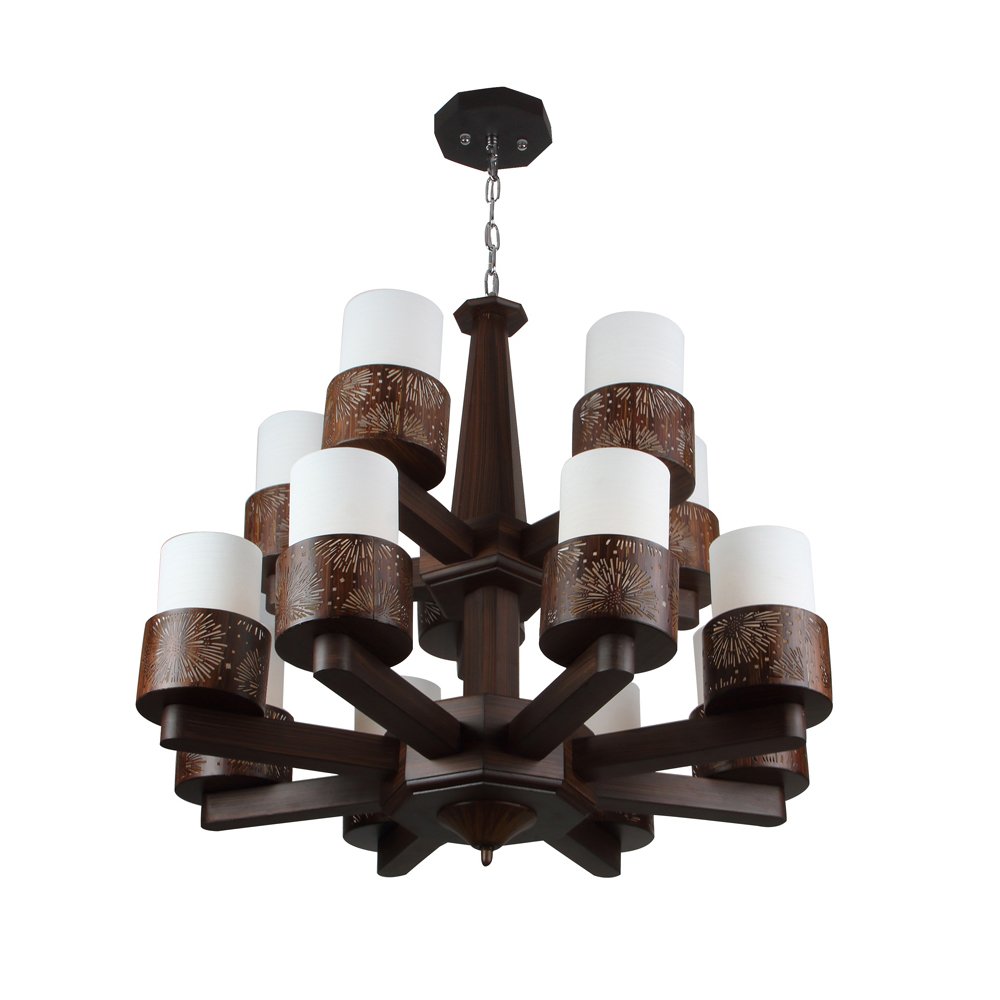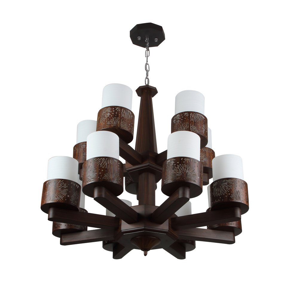 Dark brown (wood) finish, double story, round, cylindrical glass partly covered with a wooden designed cover mounted on a designer frame made of wood having thirteen lights. This is a hanging type chandelier in which the base plate is fixed to the ceiling with the help of straight clamp and screws. The suspension can be adjusted at time of installation to the desired height. It is maintenance free, it is easy to remove glass and wash them. Comes with an E27 holder, only the change of lamp is required, which is available locally everywhere. Application includes both residential and commercial premises wherever it matches with your interiors. Matching chandelier variation – CH403-6. Matching wall light code – WL2609, WL2610. Can be customized as per requirement in case of bulk quantities. LAMP NOT INCLUDED.