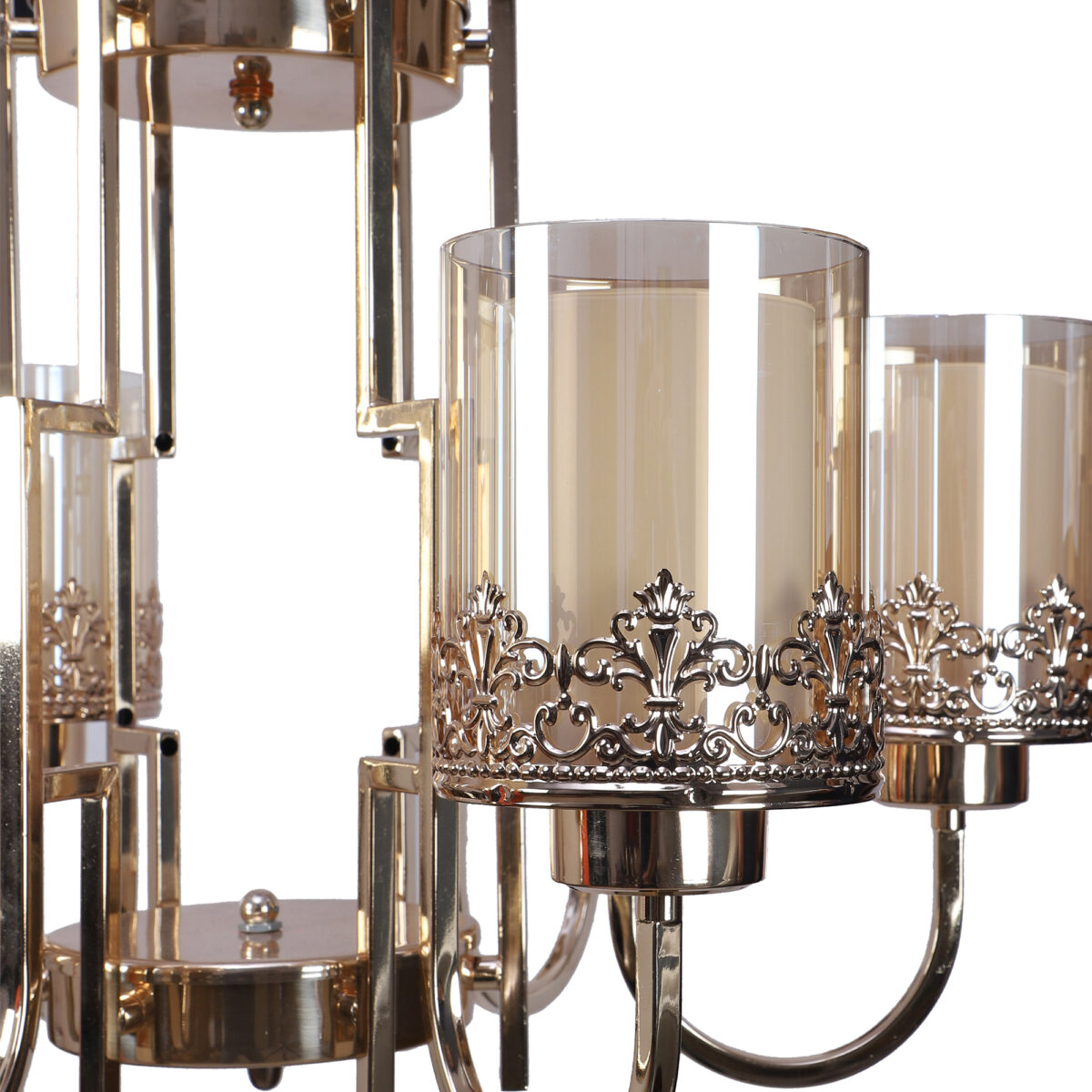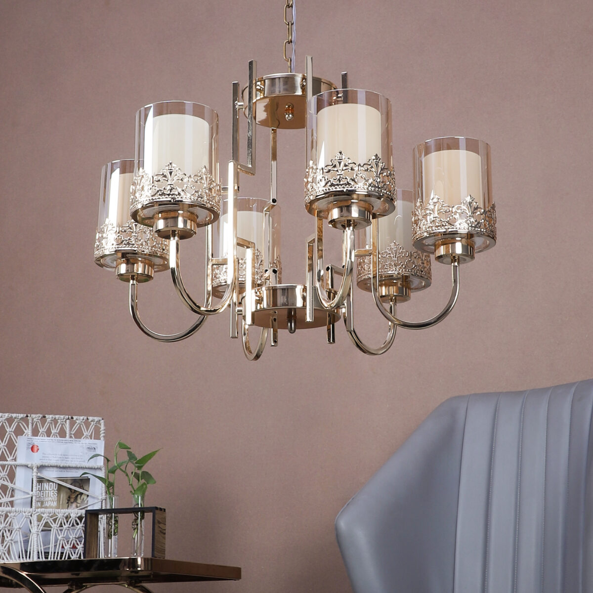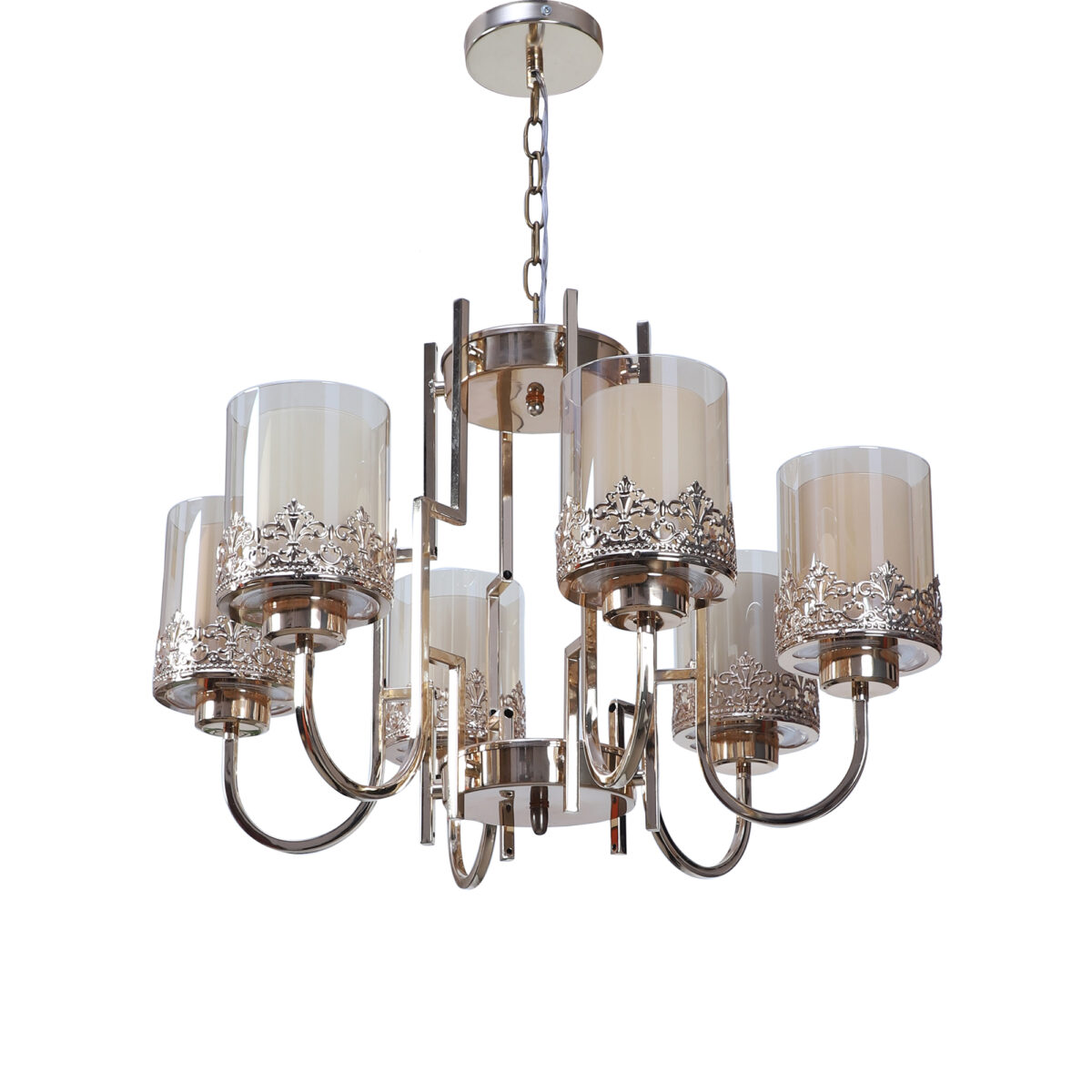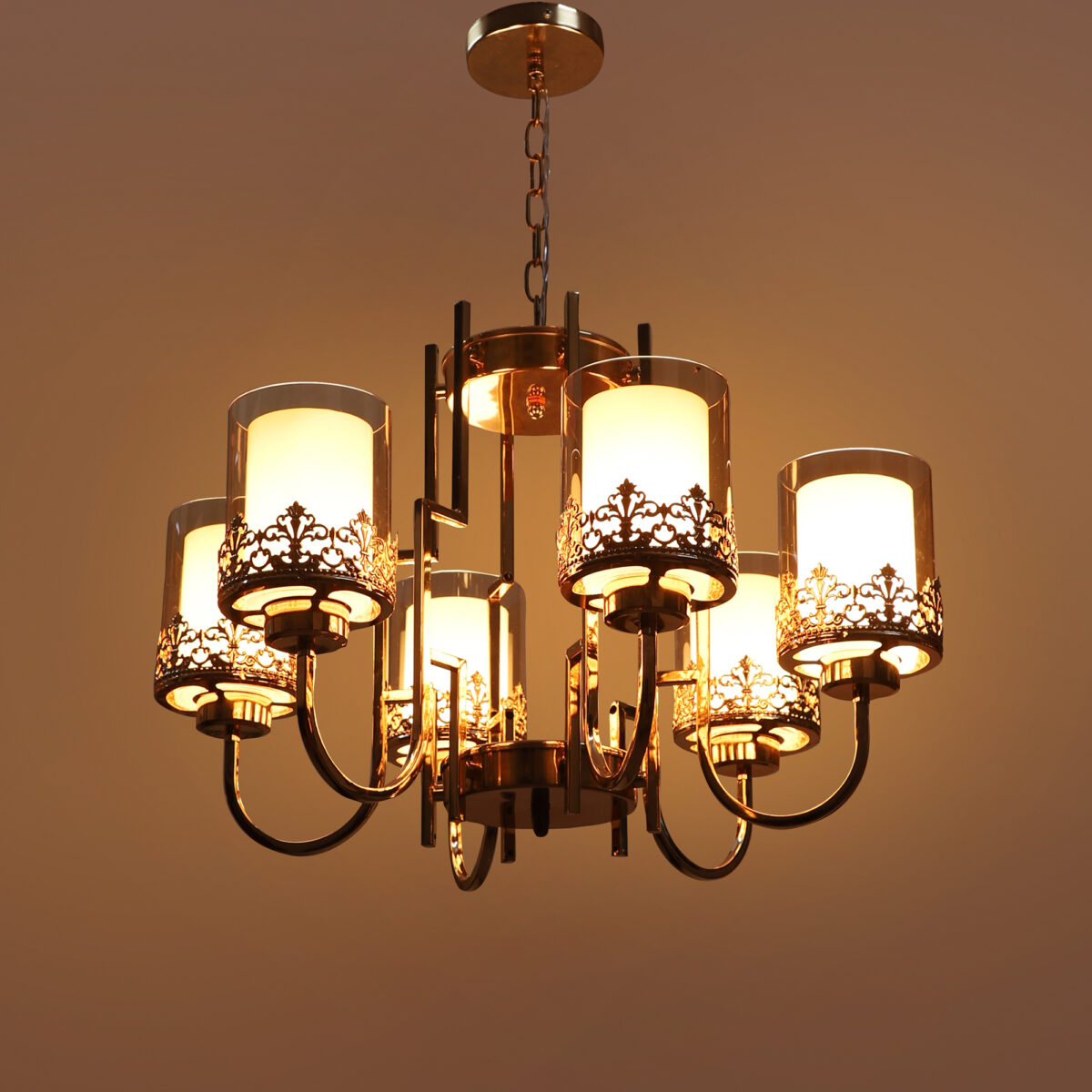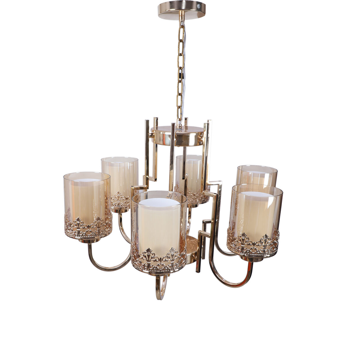 Gold finish, round, cylindrical champagne coloured two layered glass mounted on a designer frame made of mild steel having six lights. This is a hanging type chandelier in which the base plate is fixed to the ceiling with the help of straight clamp and screws. The suspension can be adjusted at time of installation to the desired height. It is maintenance free, easy to remove glasses and wash them. Comes with an E27 holder, only the change of lamp is required, which is available locally everywhere. Application includes both residential and commercial premises wherever it matches with your interiors. Can be customized as per requirement. LAMP NOT INCLUDED.