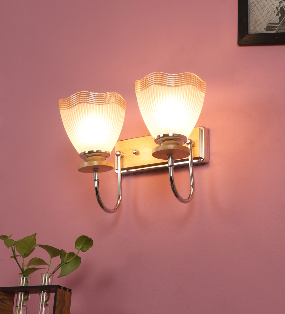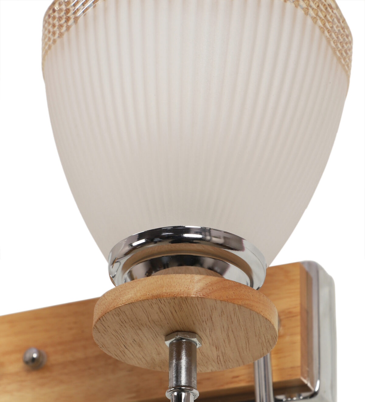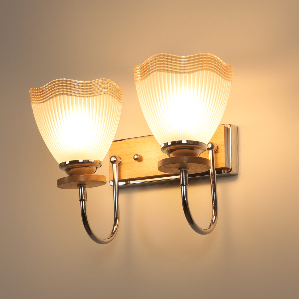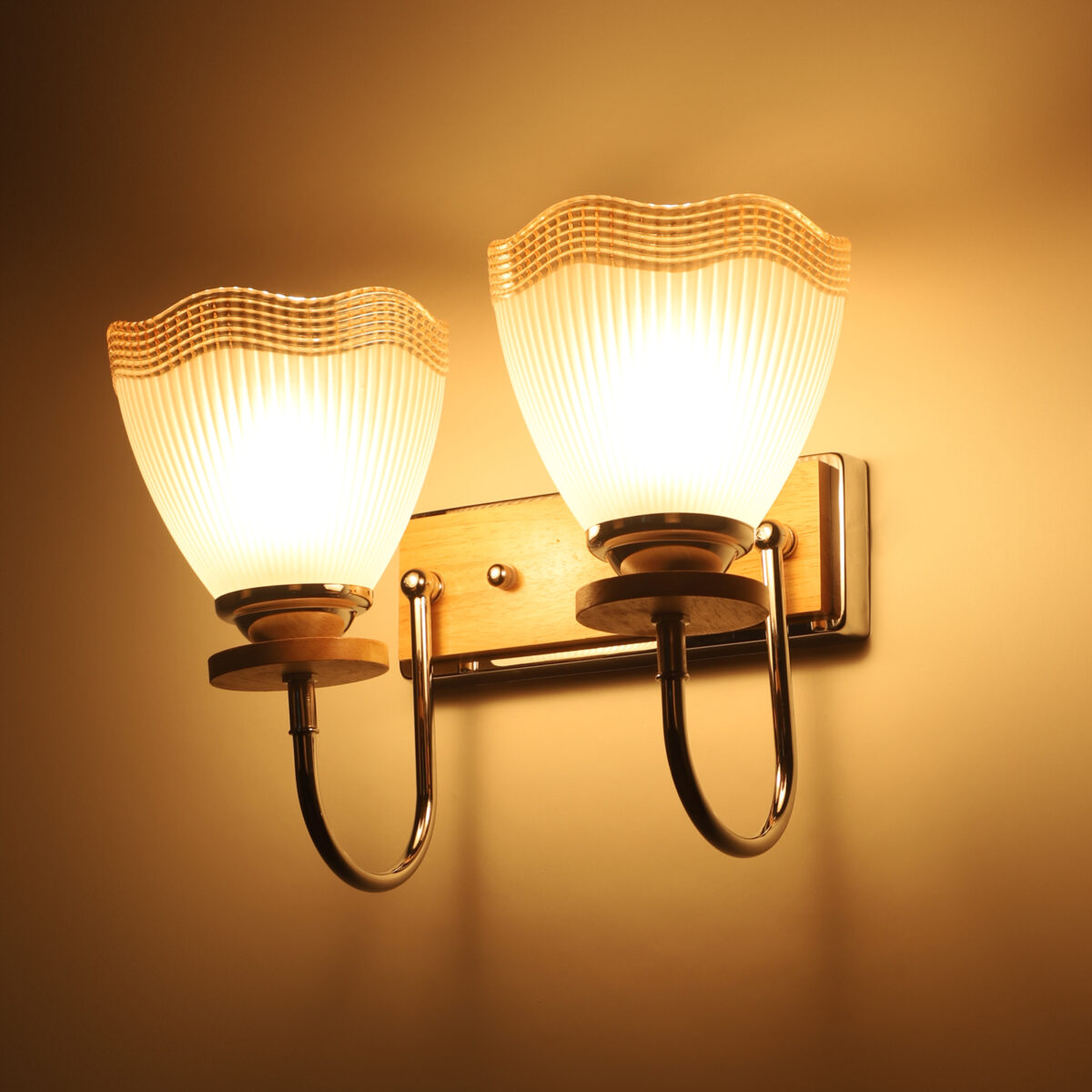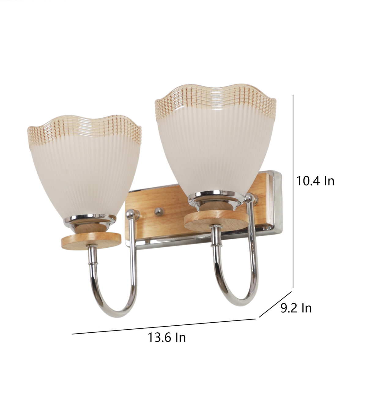 Modern light brown, silver (wood – chrome) finish double wall light made of wood and mild steel having taper frosted glasses with golden border. It is maintenance free, easy to remove glass and wash it, comes with an E27 holder, only the change of lamp is required, which is available locally everywhere. You can of course swap out the bulb for one that is dimmable, has a higher light output or a different color temperature. Application includes both residential and commercial premises wherever it matches with your interiors. Matching single wall light code – WL2369. Can be customized as per requirement in case of bulk quantities. Lamp not included.